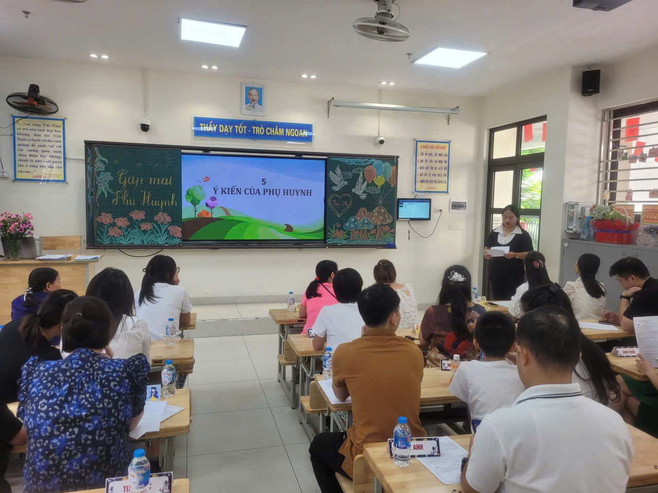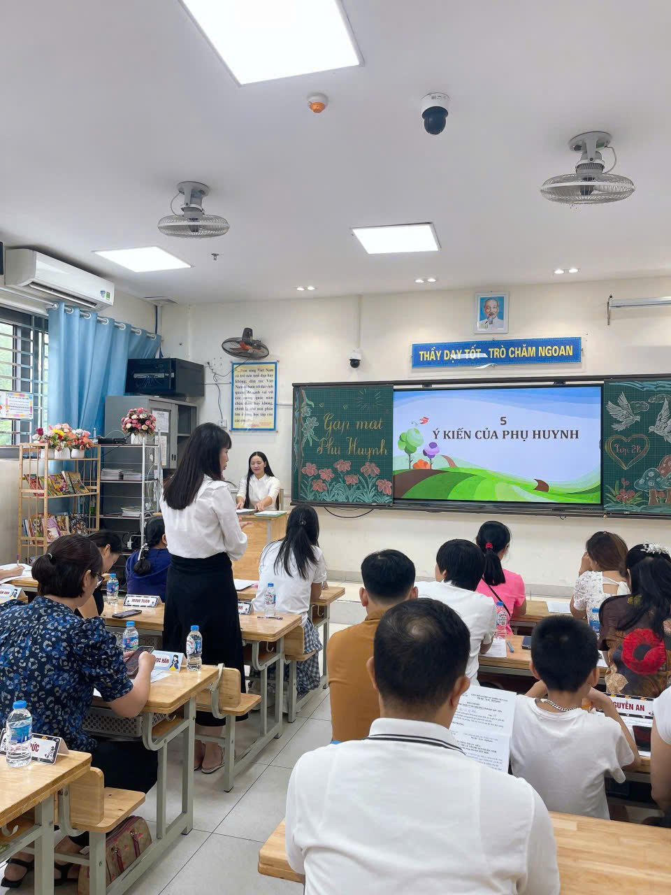 Cô giáo chủ nhiệm đã mở đầu buổi họp bằng báo cáo tổng quan về tình hình nhà trường và lớp học. Cô đã chia sẻ những thành tích nổi bật của trường trong năm học vừa qua, đồng thời giới thiệu những hoạt động dự kiến sẽ diễn ra trong năm học mới. Đặc biệt, cô đã nhấn mạnh những điểm mạnh và những khó khăn của lớp 2B, từ đó đưa ra những phương hướng giáo dục phù hợp. Để tạo động lực học tập cho các em học sinh, cô giáo đã đưa ra những chỉ tiêu phấn đấu thi đua cụ thể trong năm học mới. Các chỉ tiêu này không chỉ tập trung vào thành tích học tập mà còn hướng đến việc phát triển toàn diện các em về thể chất, tinh thần và kỹ năng sống.