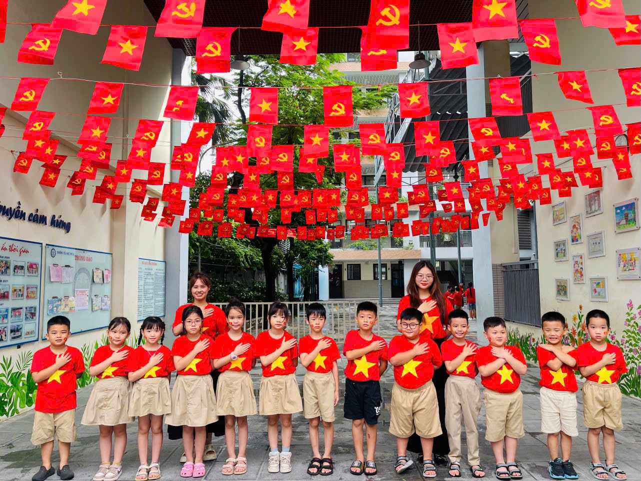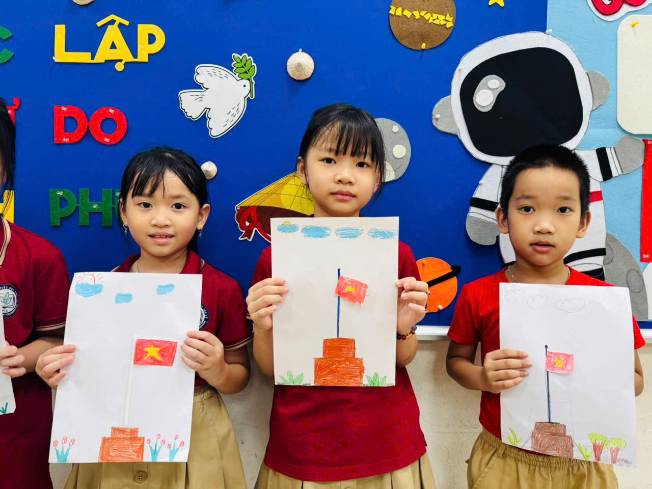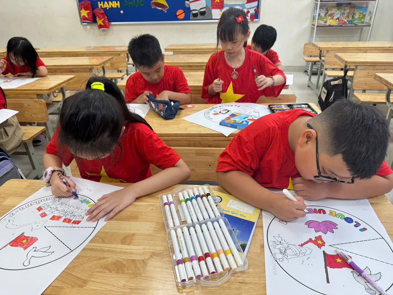 Không chỉ vậy, trong không gian mùa thu lịch sử, các bạn nhỏ lớp 2C đã được hòa mình vào khí thế cả nước bằng nhiều hoạt động ý nghĩa và lan tỏa. Từng lớp học rực rỡ sắc cờ đỏ sao vàng, từng hành lang tràn đầy không khí hân hoan. Từng ánh mắt trong veo và nụ cười hồn nhiên, nâng niu những lá cờ, những dải băng rôn đỏ thắm – như những nhịp tim trong trẻo đang nối dài mạch nguồn lịch sử cha ông.