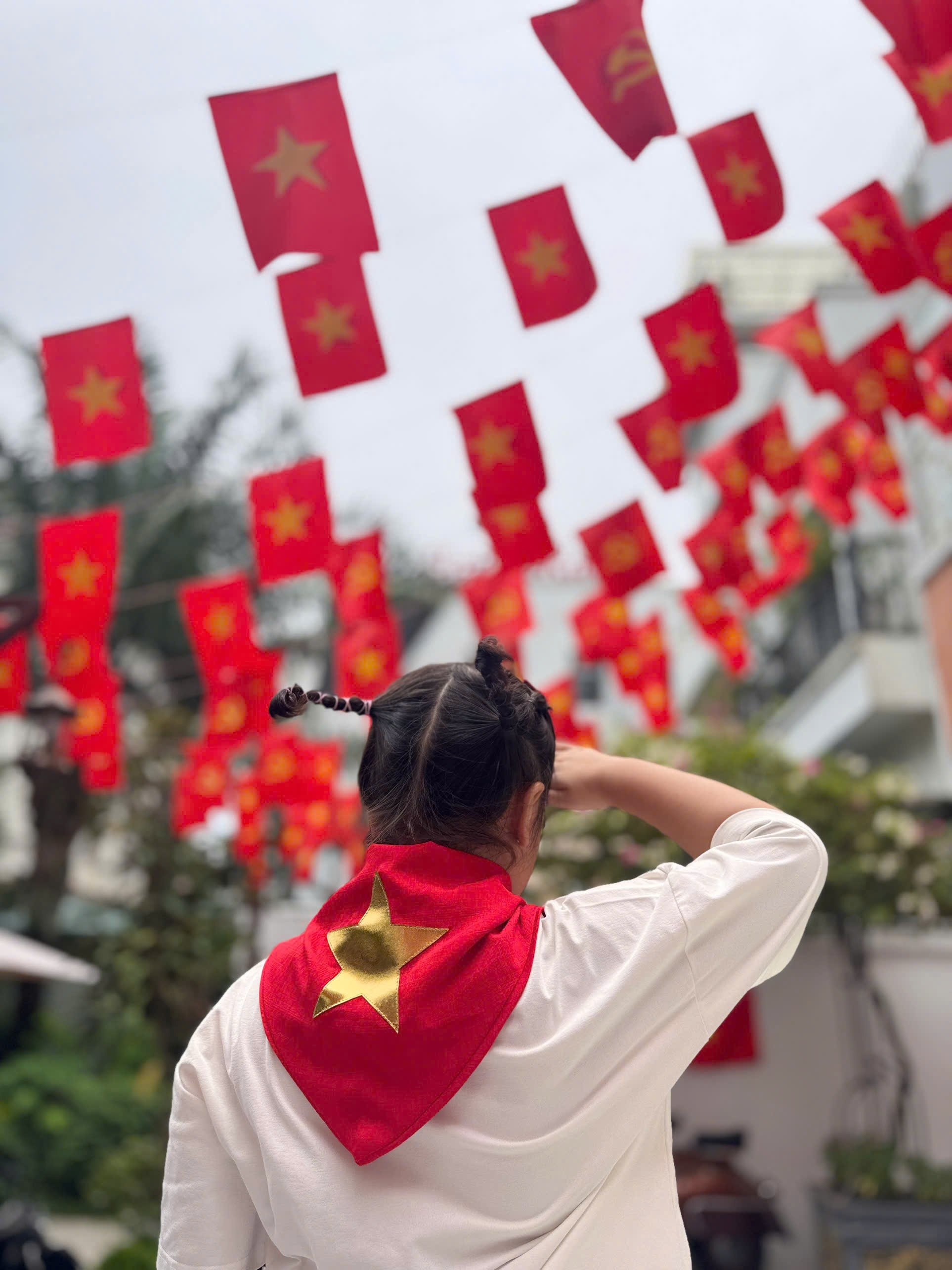 Không thể thiếu trong dịp lễ trọng đại này là những bức ảnh rực rỡ sắc đỏ vàng. Các em học sinh đã cùng nhau diện những chiếc áo cờ đỏ sao vàng, tươi cười rạng rỡ dưới nắng thu dịu nhẹ, lưu giữ lại những khoảnh khắc đầy tự hào về tình yêu Tổ quốc và niềm tự hào dân tộc.
