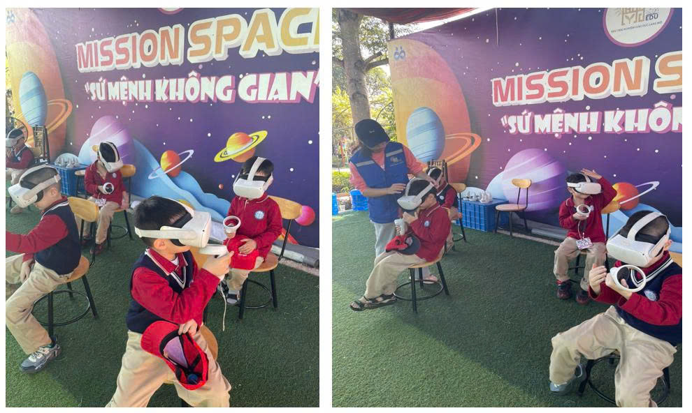 Tại khu STEMLab, các bạn học sinh được hóa thân thành “nhà khoa học nhí” được trải nghiệm thực tế ảo VR và tìm hiểu thế giới ảo 360°. Hoạt động giúp các con hiểu thêm về ứng dụng của khoa học, công nghệ và trí tuệ nhân tạo trong đời sống, đồng thời phát huy khả năng tư duy logic và sáng tạo.