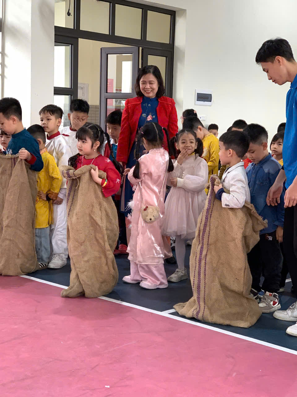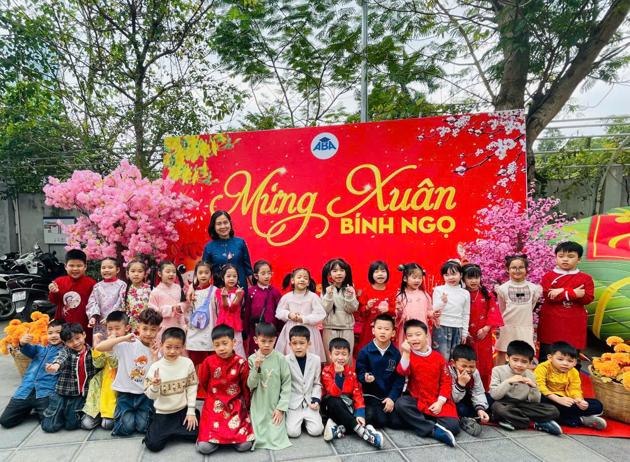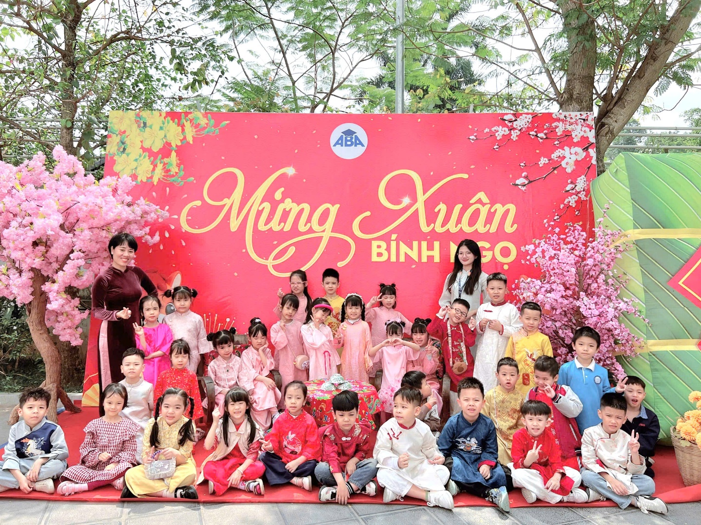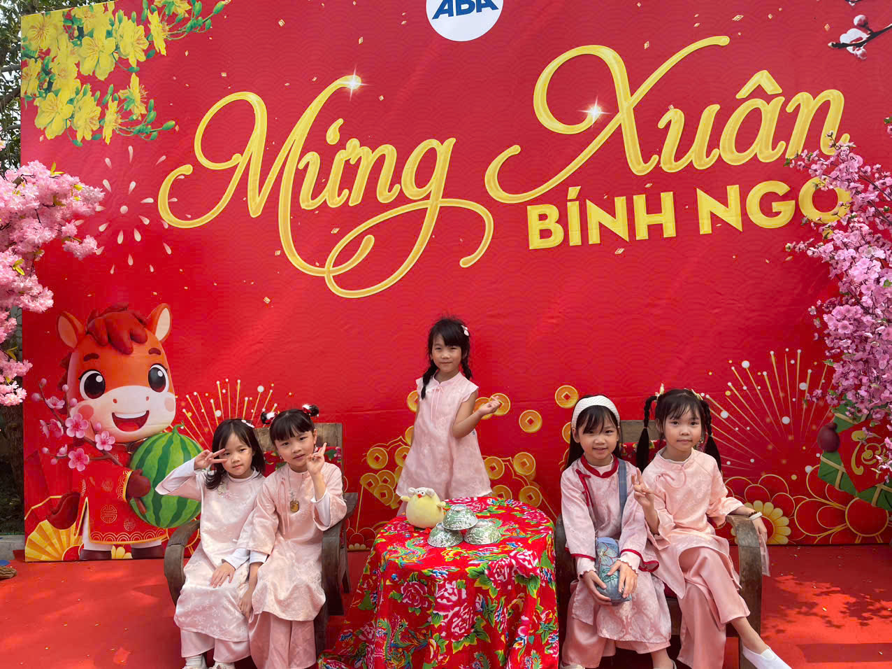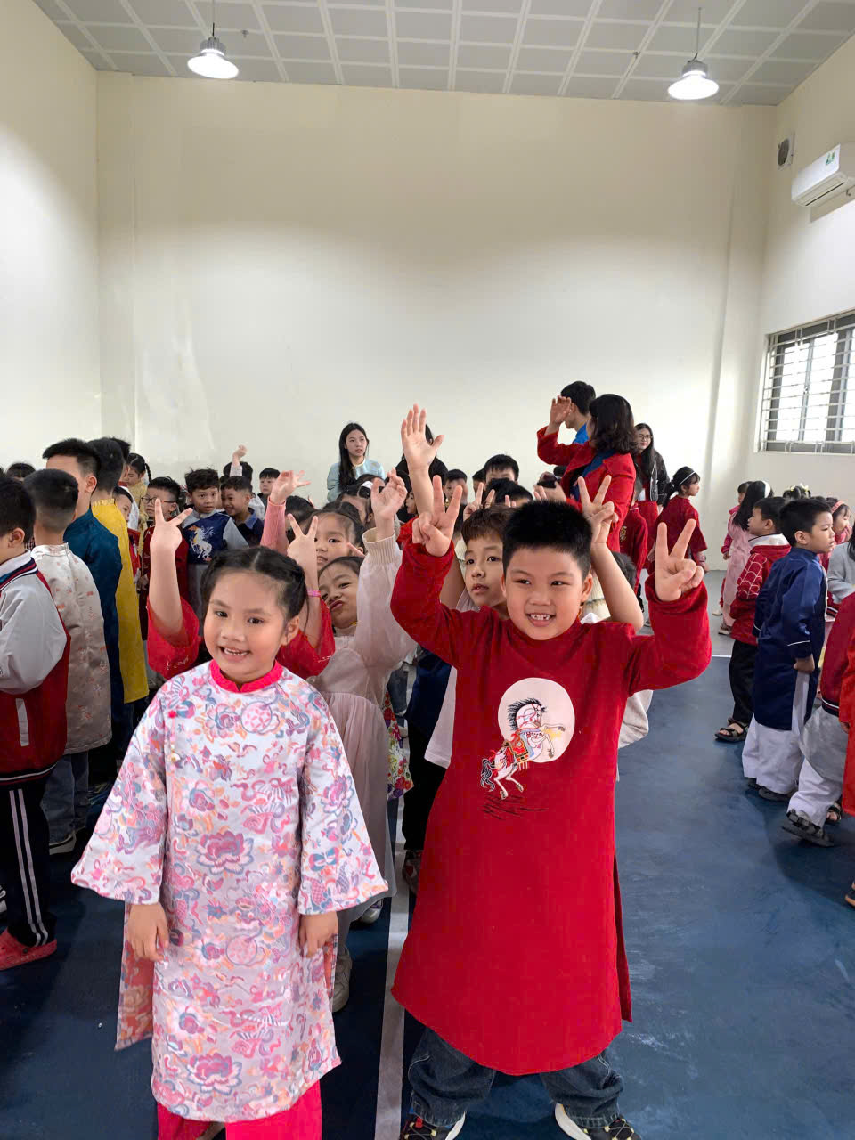 Các em học sinh trong trang phục áo dài truyền thống đã tham gia biểu diễn văn nghệ, trò chơi dân gian và các hoạt động trải nghiệm như làm tranh Đông Hồ, viết thư pháp… Khuôn viên trường được trang hoàng rực rỡ với cành đào, nhành mai, câu đối đỏ, đèn lồng và những tiểu cảnh Tết truyền thống.