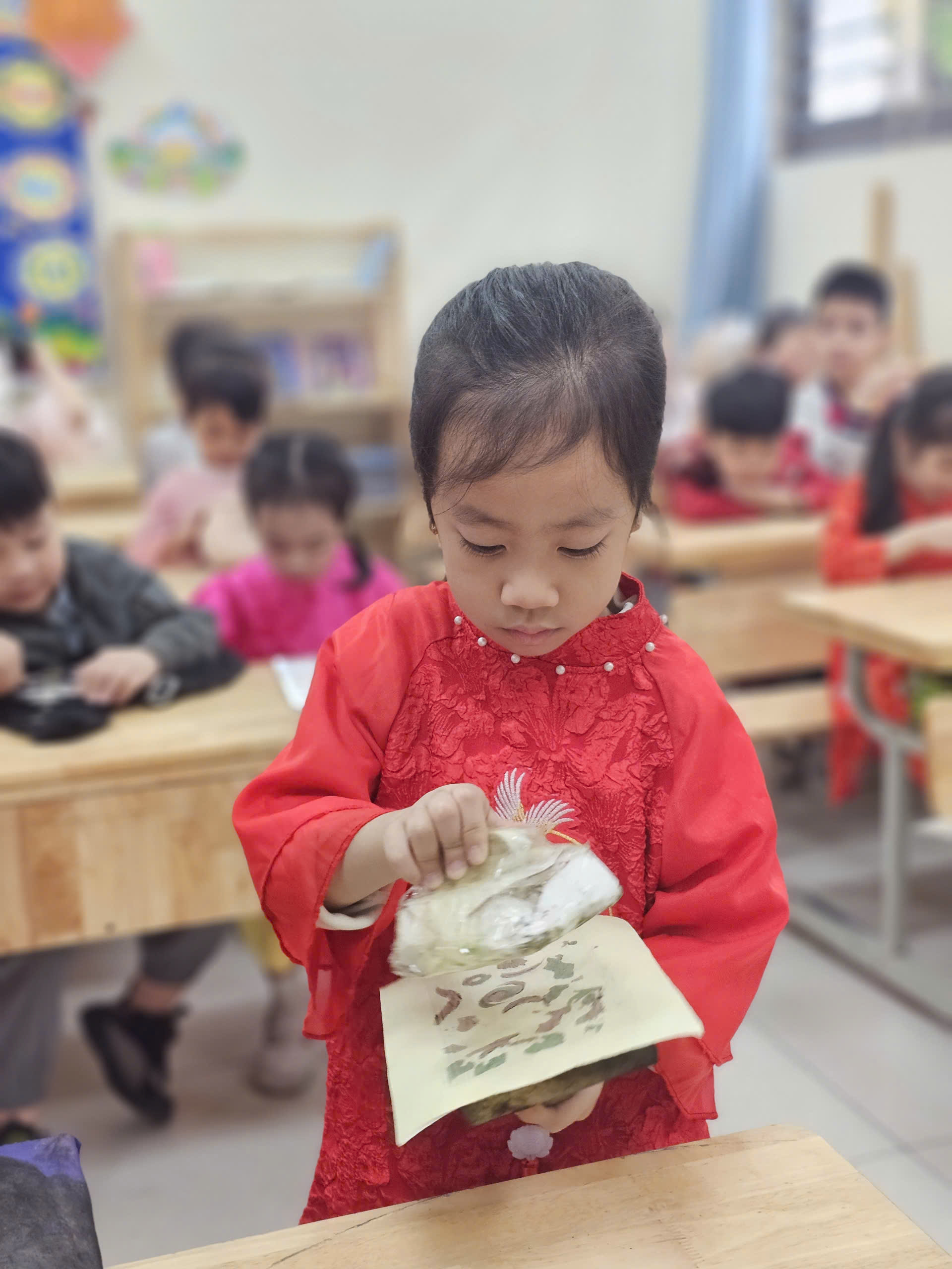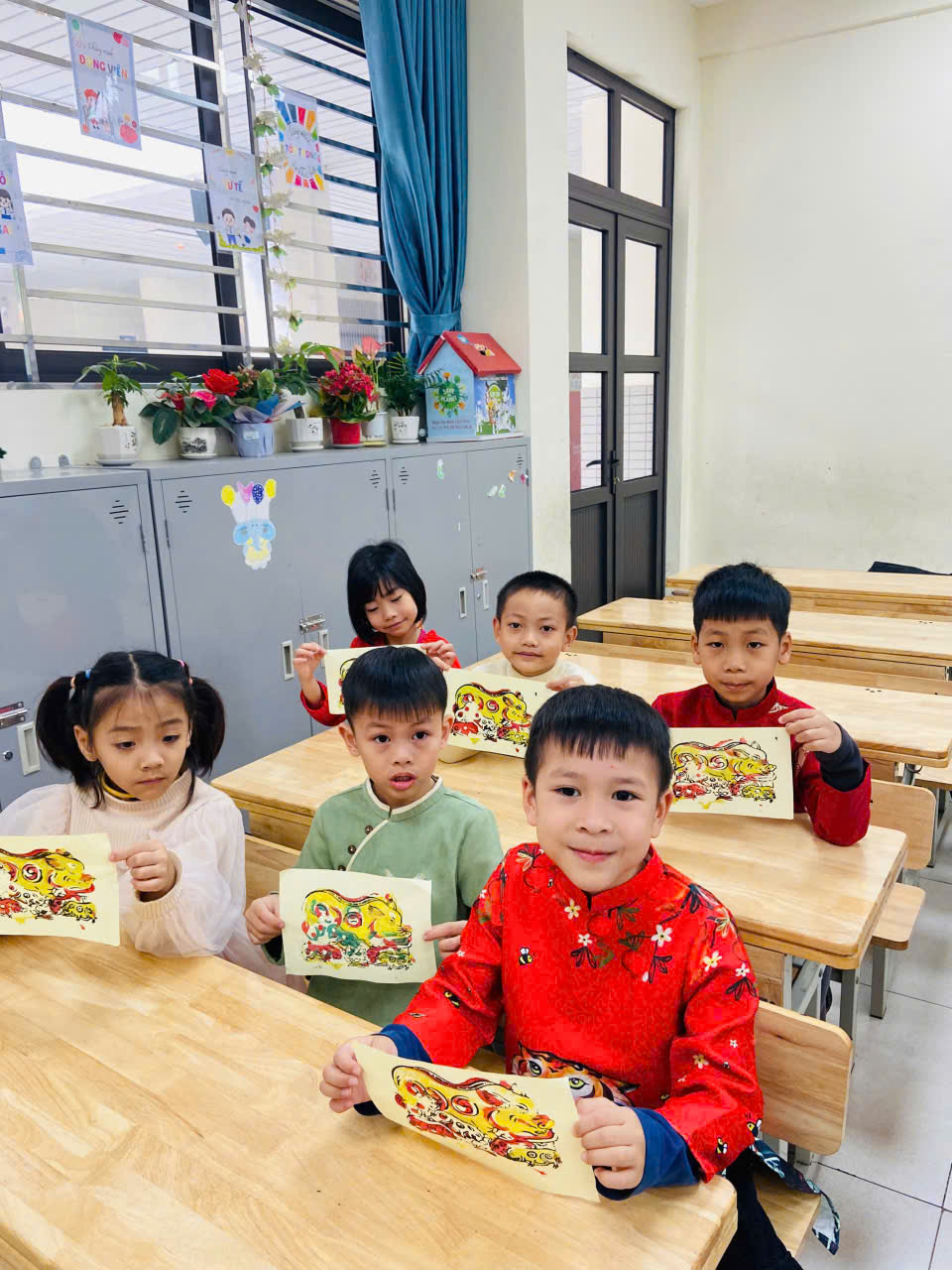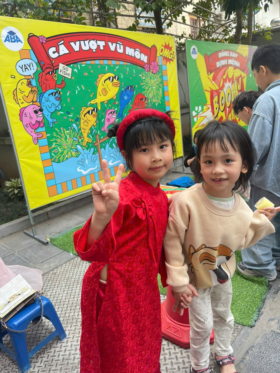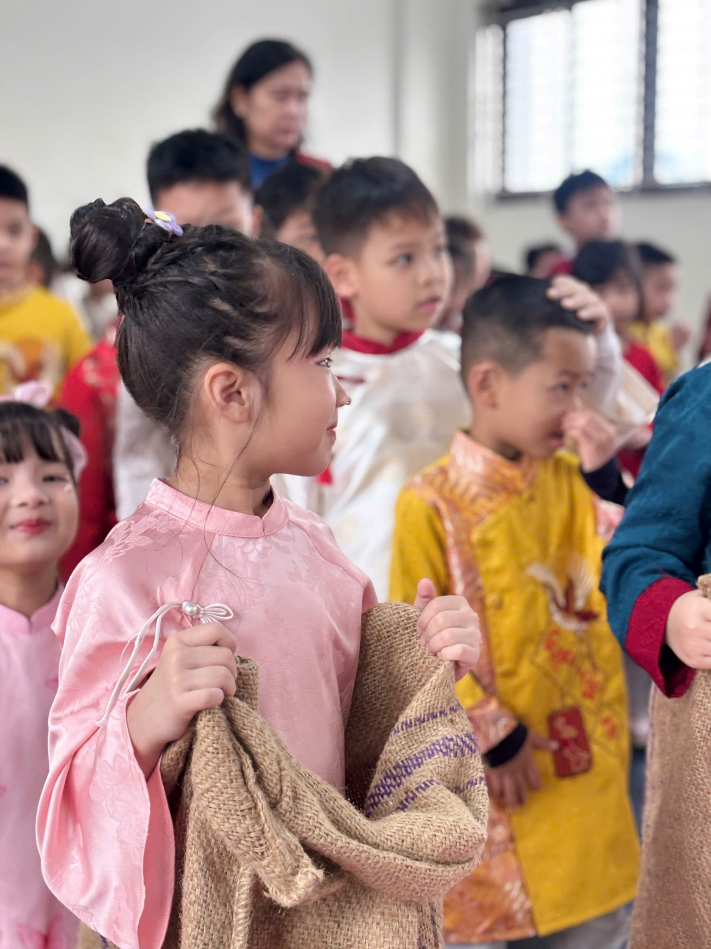 Các em học sinh trong trang phục áo dài truyền thống đã tham gia biểu diễn văn nghệ, trò chơi dân gian và các hoạt động trải nghiệm như làm tranh Đông Hồ, viết thư pháp… Khuôn viên trường được trang hoàng rực rỡ với cành đào, nhành mai, câu đối đỏ, đèn lồng và những tiểu cảnh Tết truyền thống.