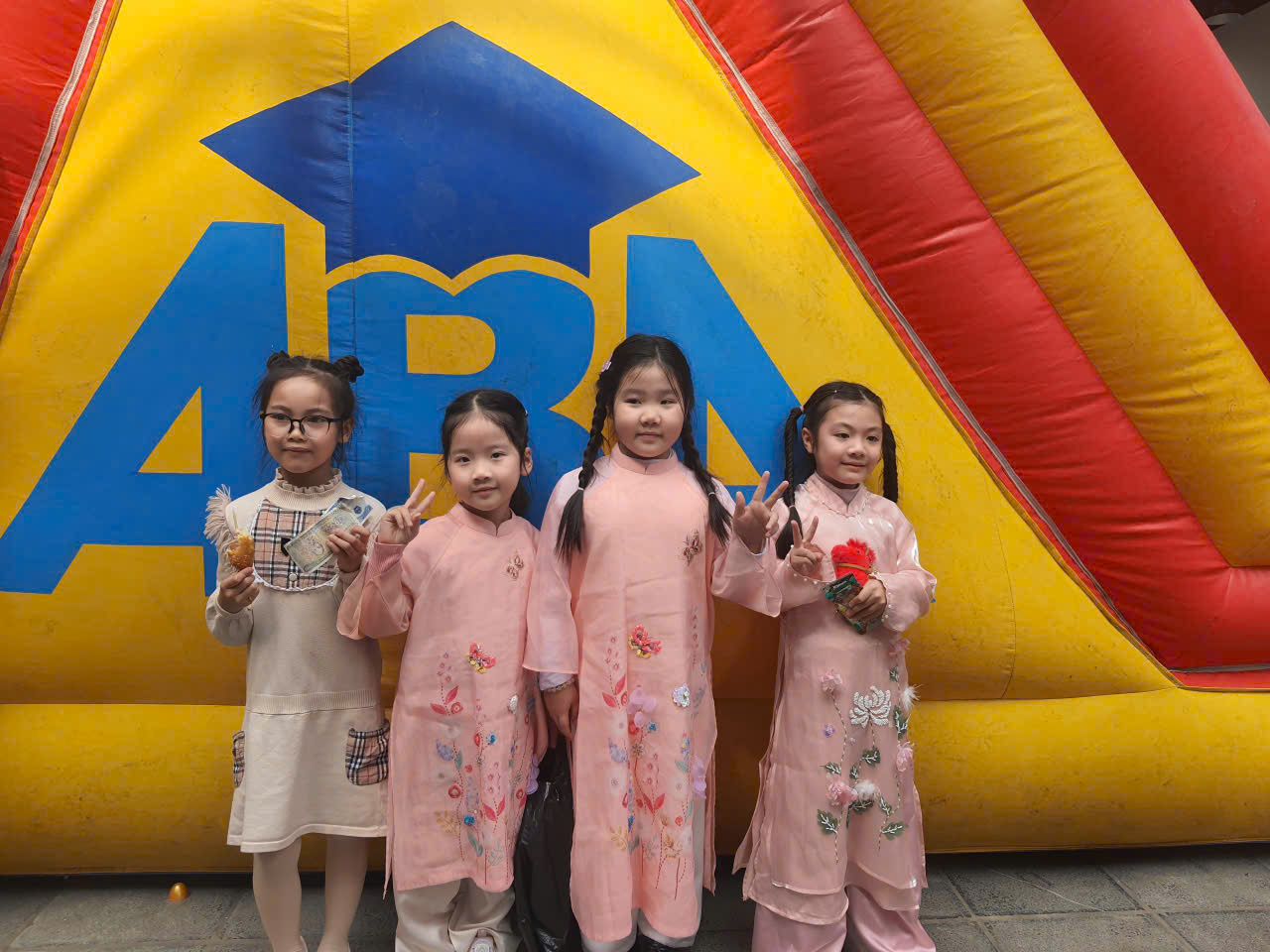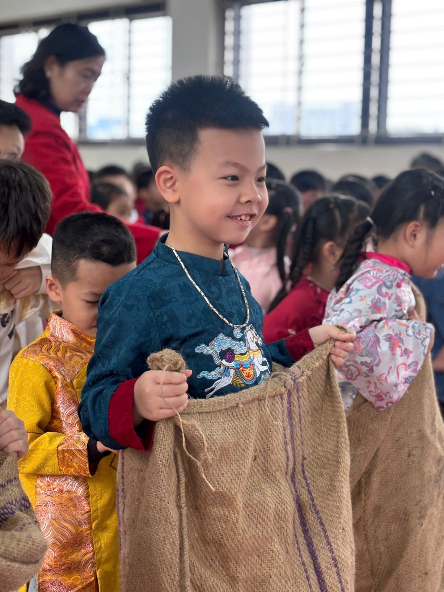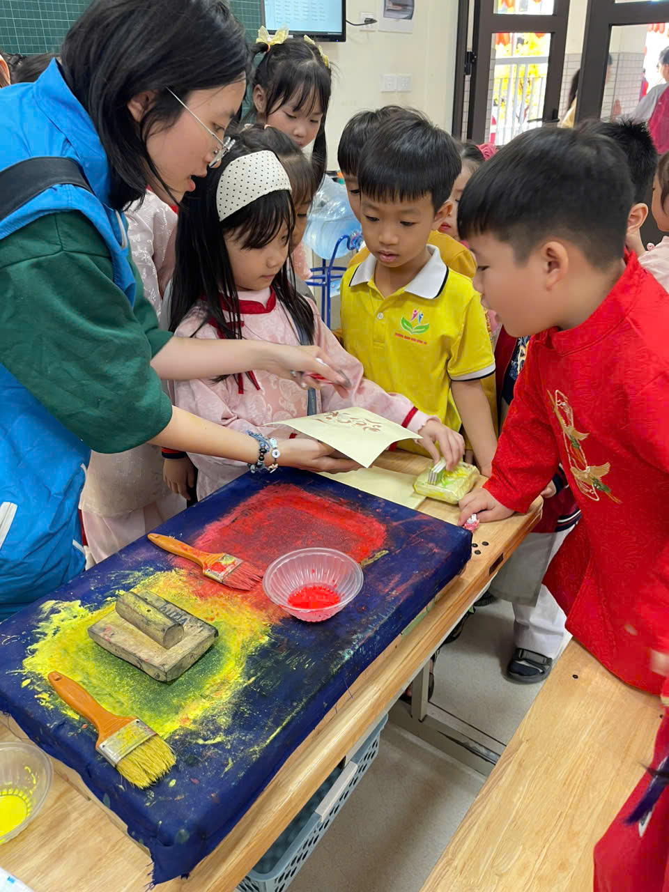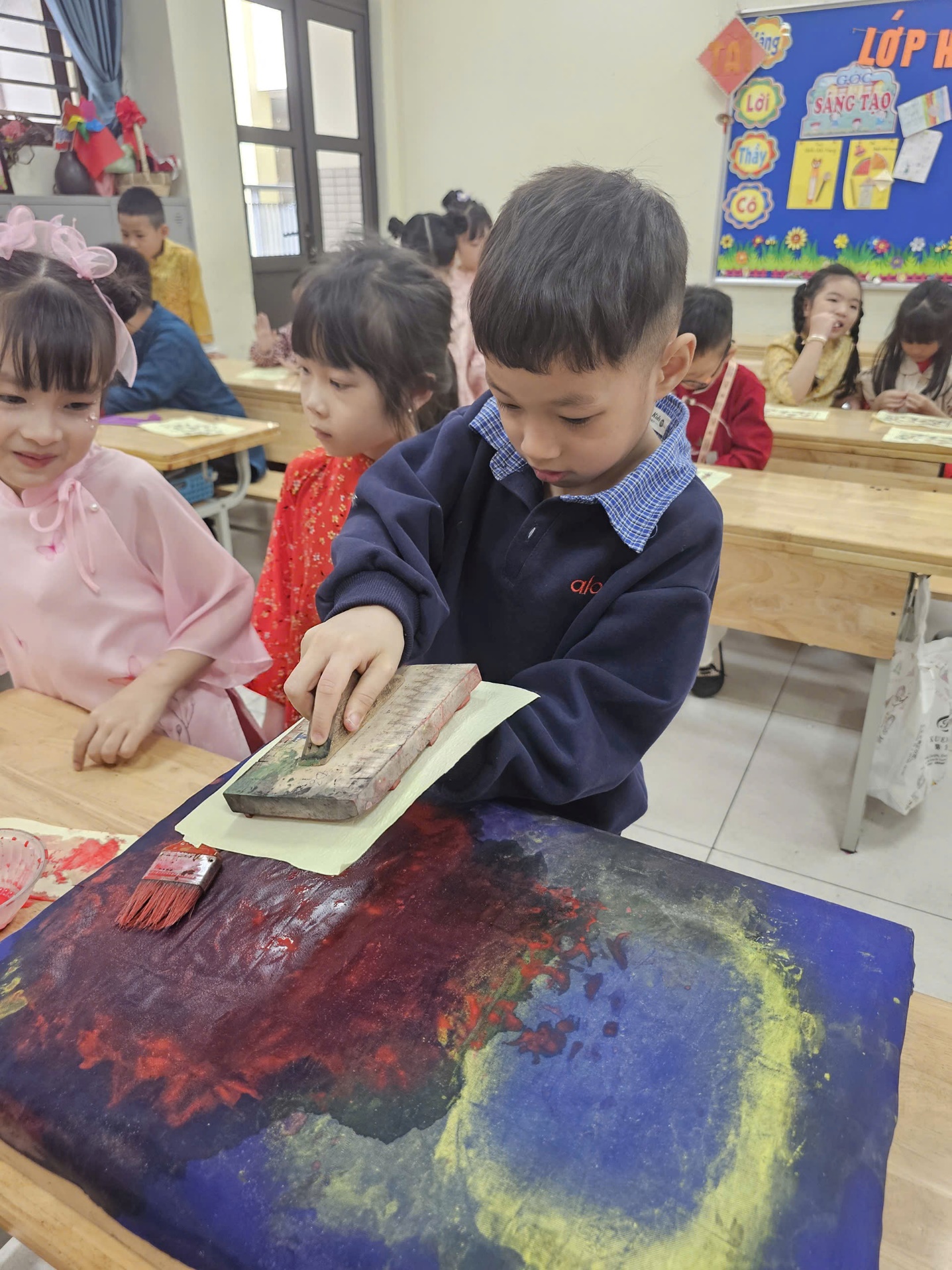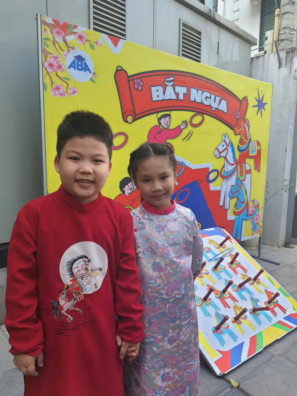 Các em học sinh trong trang phục áo dài truyền thống đã tham gia biểu diễn văn nghệ, trò chơi dân gian và các hoạt động trải nghiệm như làm tranh Đông Hồ, viết thư pháp… Khuôn viên trường được trang hoàng rực rỡ với cành đào, nhành mai, câu đối đỏ, đèn lồng và những tiểu cảnh Tết truyền thống.