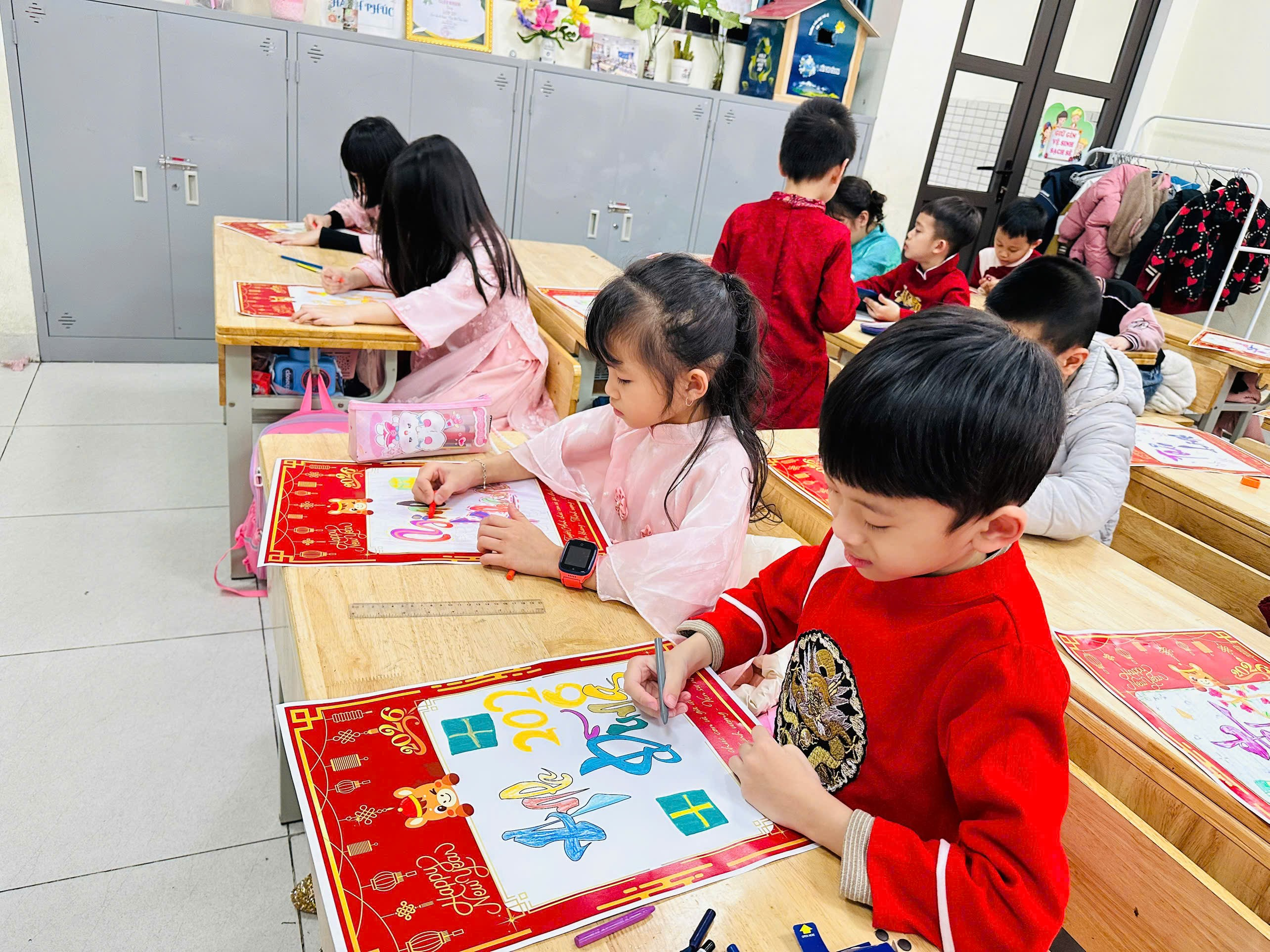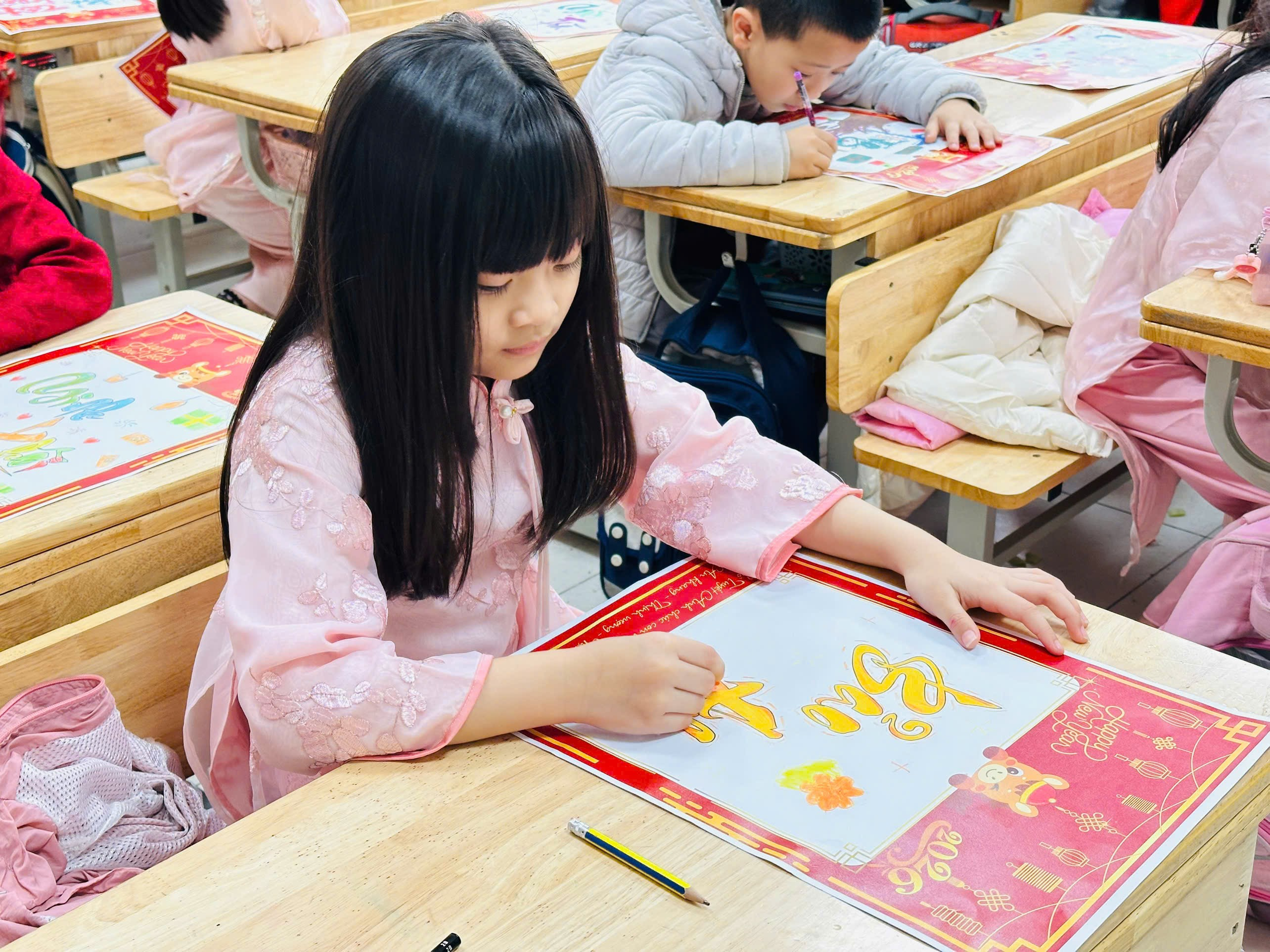 Ngay từ khi bước vào lớp, các em đã cảm nhận được không khí xuân ngập tràn với sắc đỏ may mắn và những lời chúc tốt đẹp. Hoạt động được mong chờ nhất chính là tô màu tên thư pháp. Mỗi bạn nhỏ đều được nhận một tấm bìa ghi tên mình bằng nét chữ thư pháp mềm mại, uyển chuyển. Các em hào hứng lựa chọn màu sắc yêu thích, cẩn thận tô từng nét chữ, gửi gắm vào đó ước mơ về một năm mới chăm ngoan, học giỏi. Những cái tên rực rỡ sắc màu không chỉ đẹp mắt mà còn mang ý nghĩa chúc phúc đầu xuân đầy yêu thương.