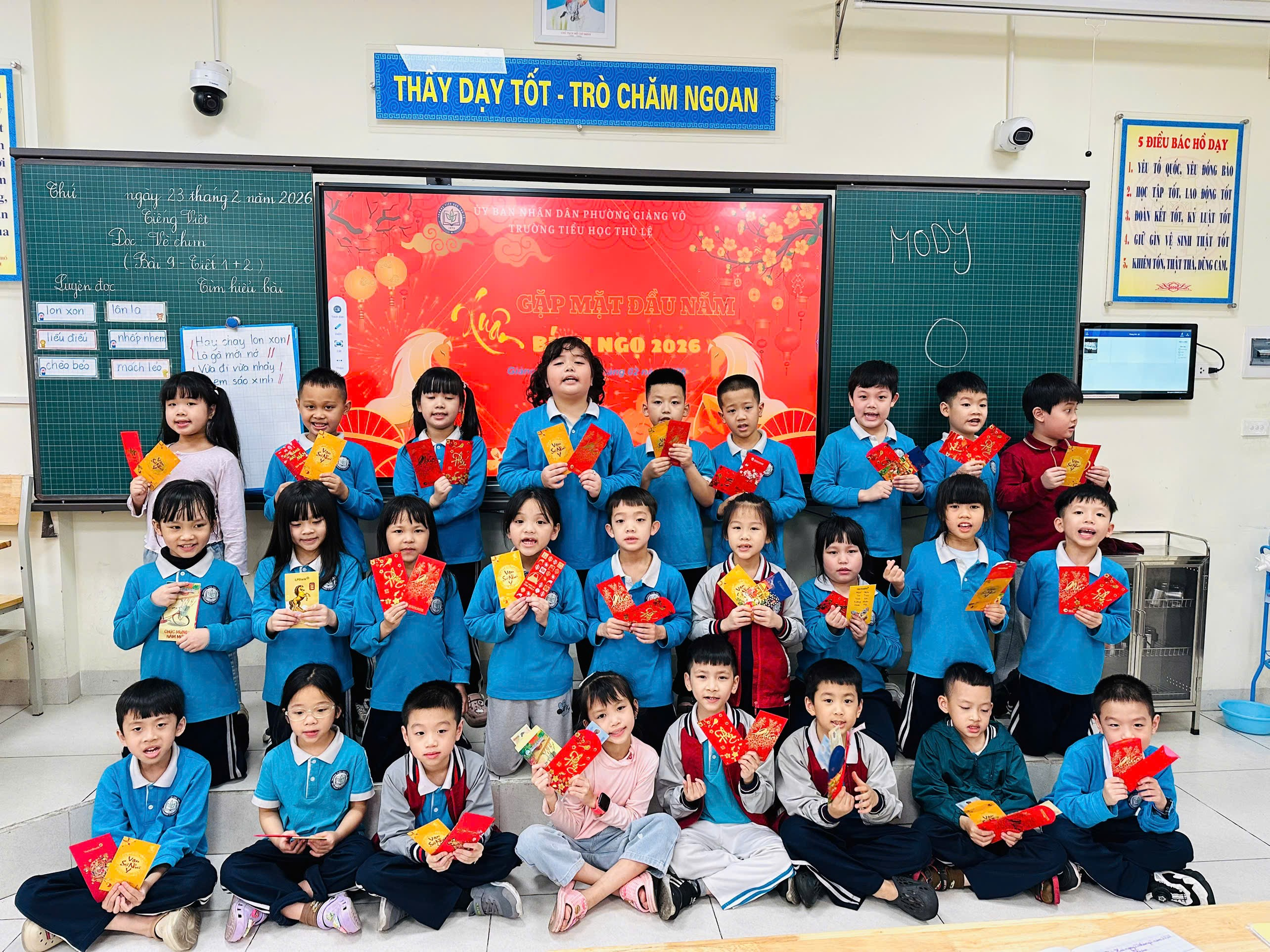 Bên cạnh đó, hoạt động lì xì đầu năm khiến cả lớp vỡ òa trong niềm vui. Những phong bao đỏ, xanh, vàng xinh xắn được trao tận tay từng học sinh, kèm theo lời chúc: chăm ngoan hơn, tự tin hơn và đạt nhiều thành tích tốt trong năm mới. Nụ cười rạng rỡ, ánh mắt háo hức của các em đã làm cho không khí lớp học càng thêm ấm áp.
