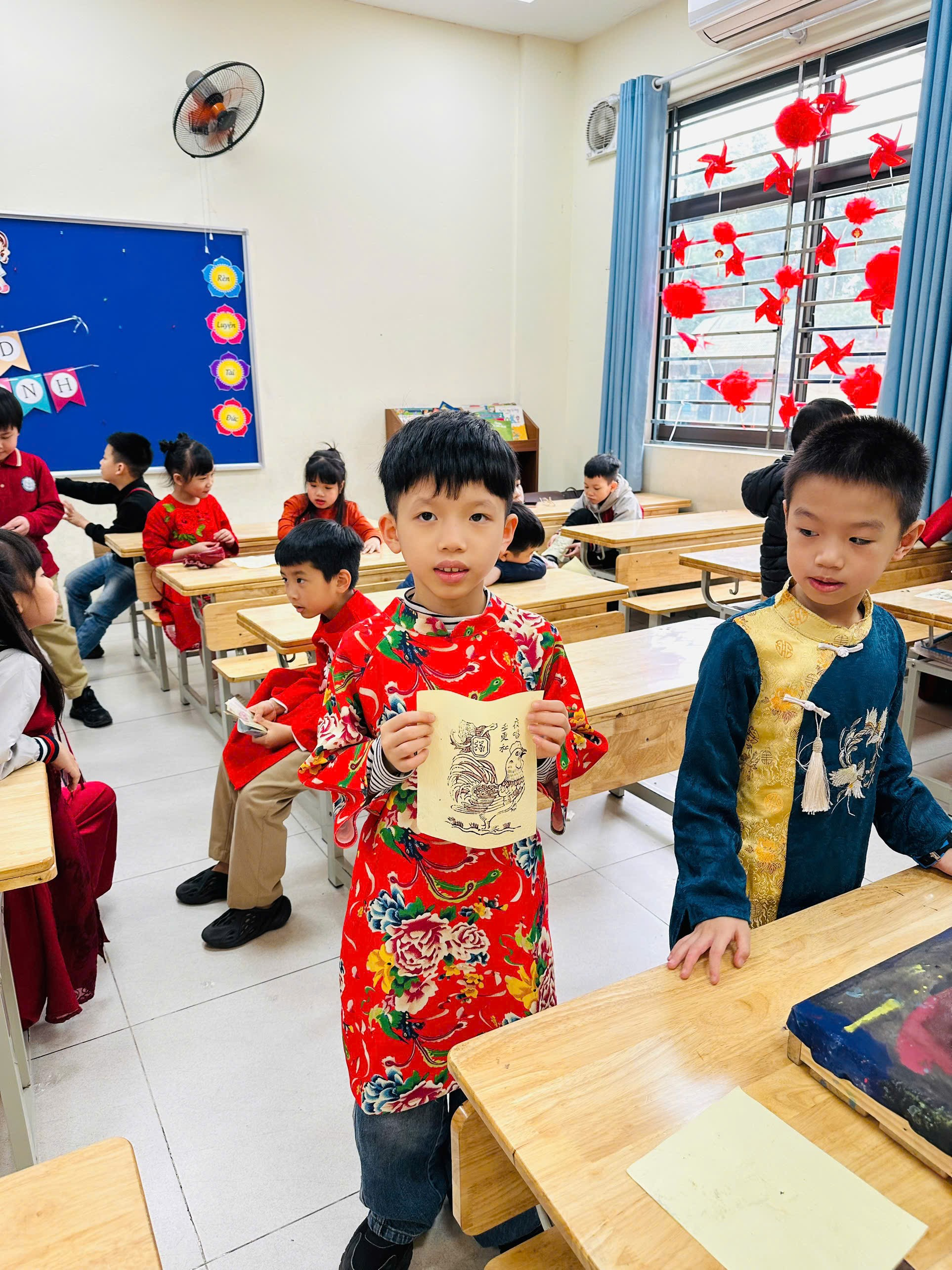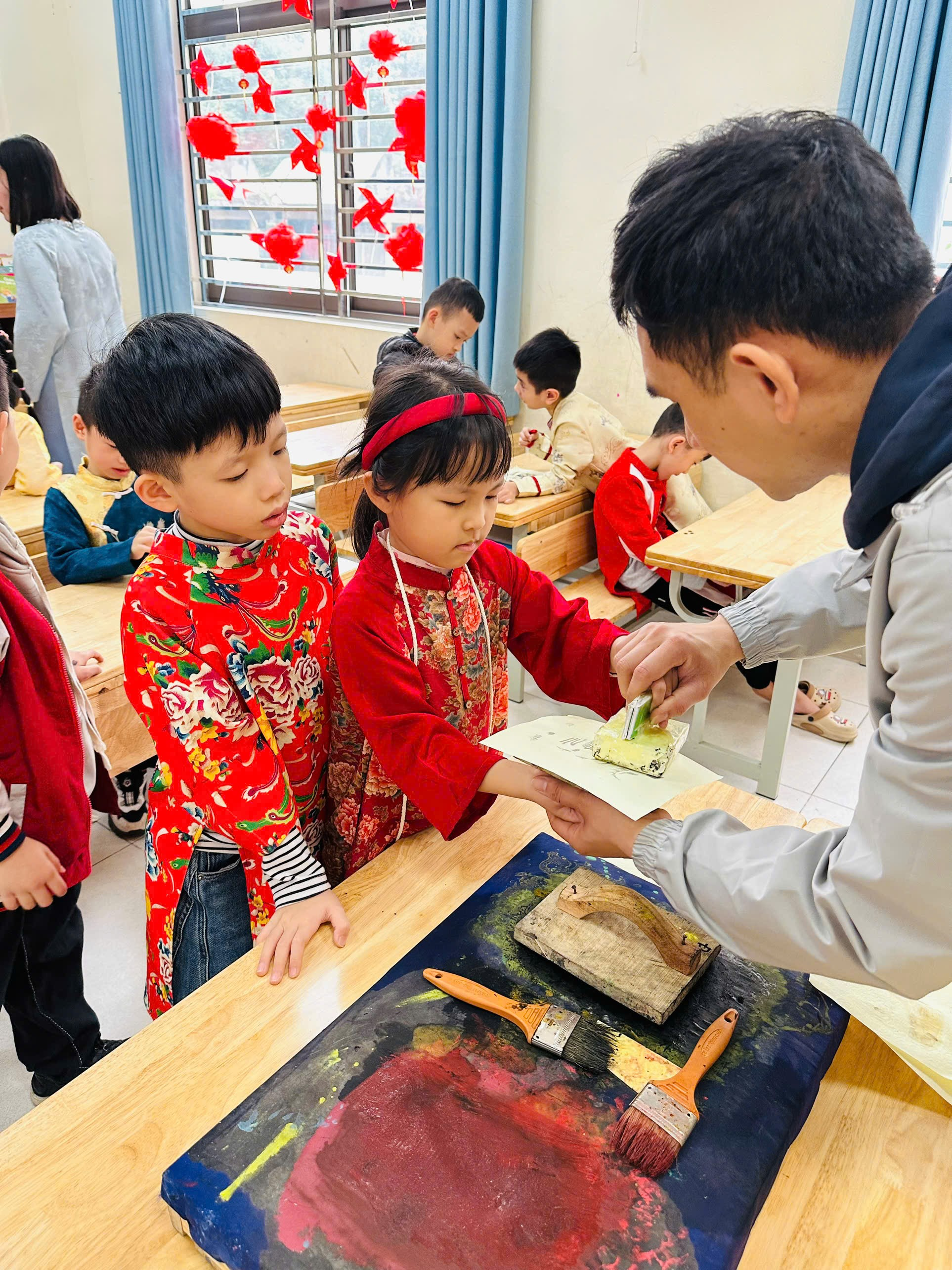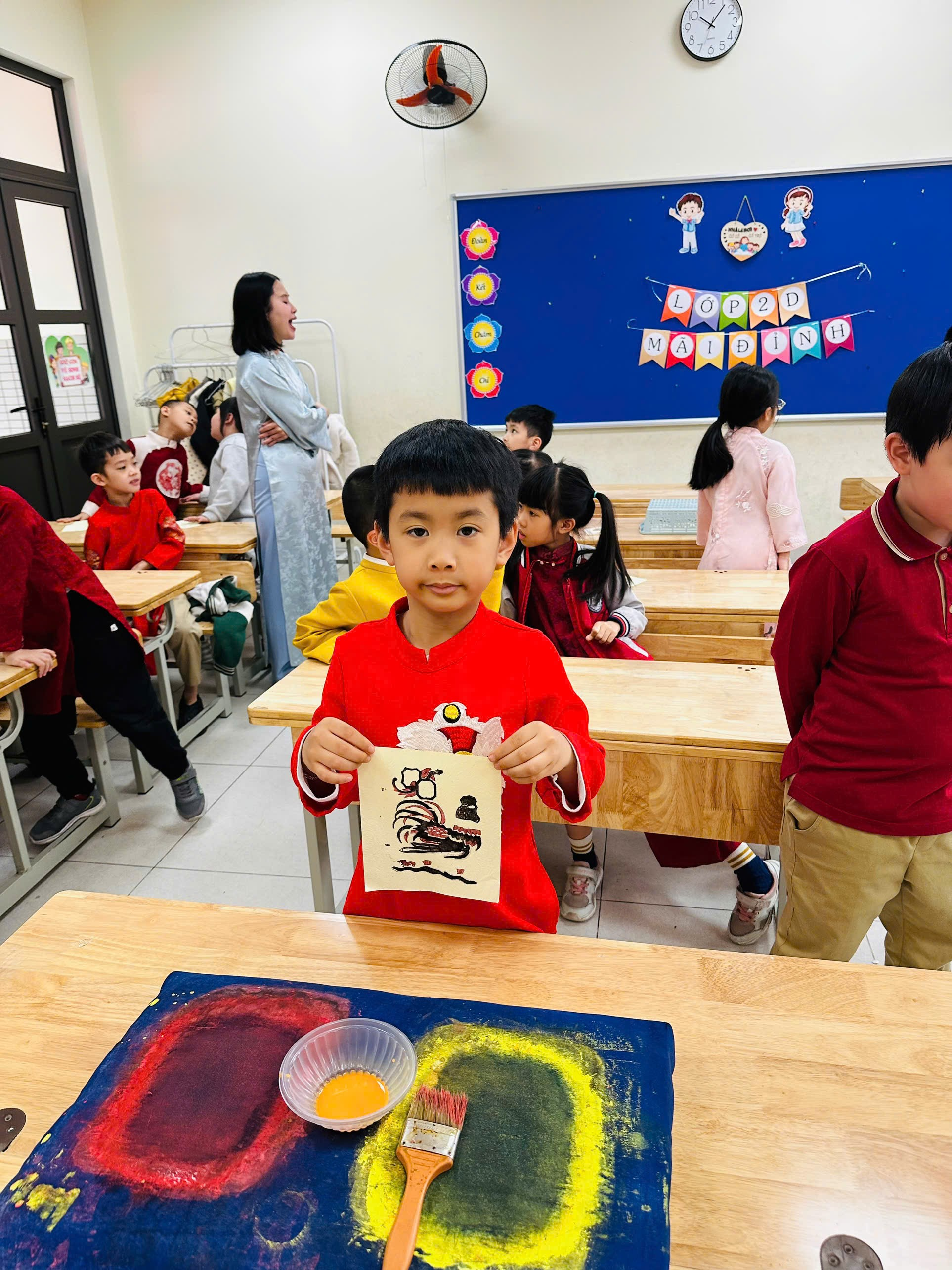 Không chỉ được xem biểu diễn, các bạn nhỏ lớp 2D còn trực tiếp tham gia nhiều hoạt động trải nghiệm hấp dẫn. Các con hào hứng thử sức với in tranh Đông Hồ, tìm hiểu nét đẹp của nghệ thuật dân gian truyền thống và tự tay tạo nên những bức tranh đầy màu sắc.