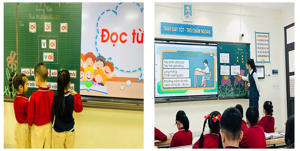 Sau phần khởi động đầy sôi nổi, cô và trò cùng bước vào bài học “oi, ôi, ơi”. Dưới sự hướng dẫn nhẹ nhàng, tận tâm của cô giáo, các em được luyện phát âm, đọc tiếng – từ – câu, tìm hiểu nghĩa của từ qua hình ảnh minh họa sinh động và trò chơi học tập hấp dẫn. Những tiếng đọc vang lên trong trẻo, rõ ràng; những đôi bàn tay nhỏ xinh chăm chỉ viết chữ; tất cả tạo nên một tiết học thật đáng nhớ.