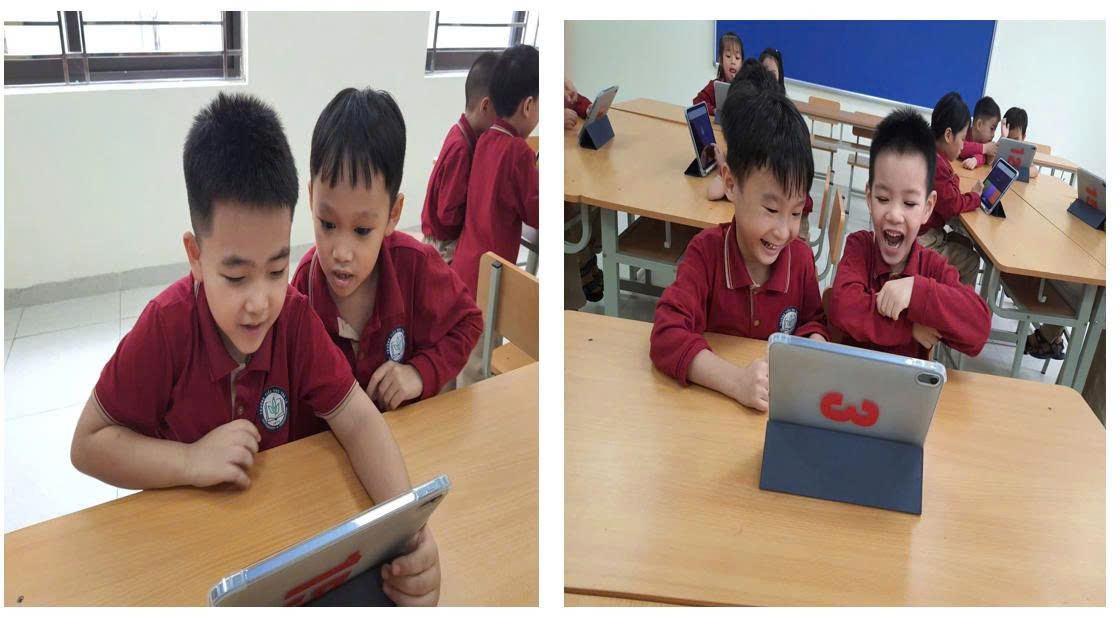 Tiếp nối niềm hứng khởi đó, lớp 1C bước sang tiết Toán tích hợp iPad với nội dung “Phép cộng trong phạm vi 10”. Đây là hoạt động học tập hiện đại, giúp các em tiếp cận kiến thức một cách trực quan và sinh động hơn. Với chiếc iPad trên tay, học sinh được tham gia các trò chơi luyện tập, giải toán qua hình ảnh, và thi đua chọn đáp án đúng. Mỗi lần có bạn trả lời chính xác, cả lớp lại vỗ tay reo vui, khích lệ nhau học tốt hơn.
