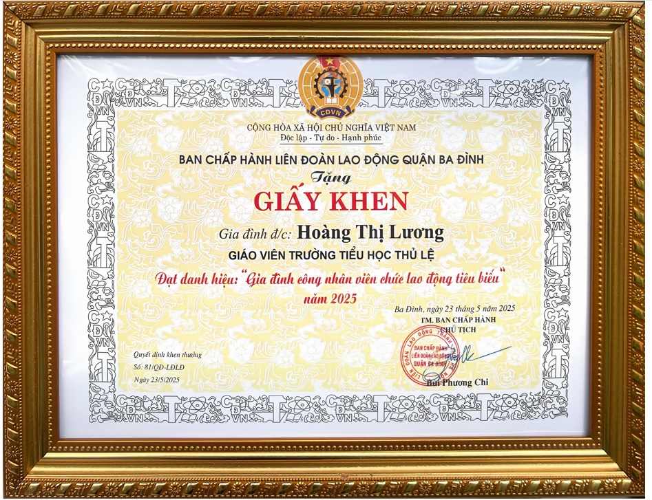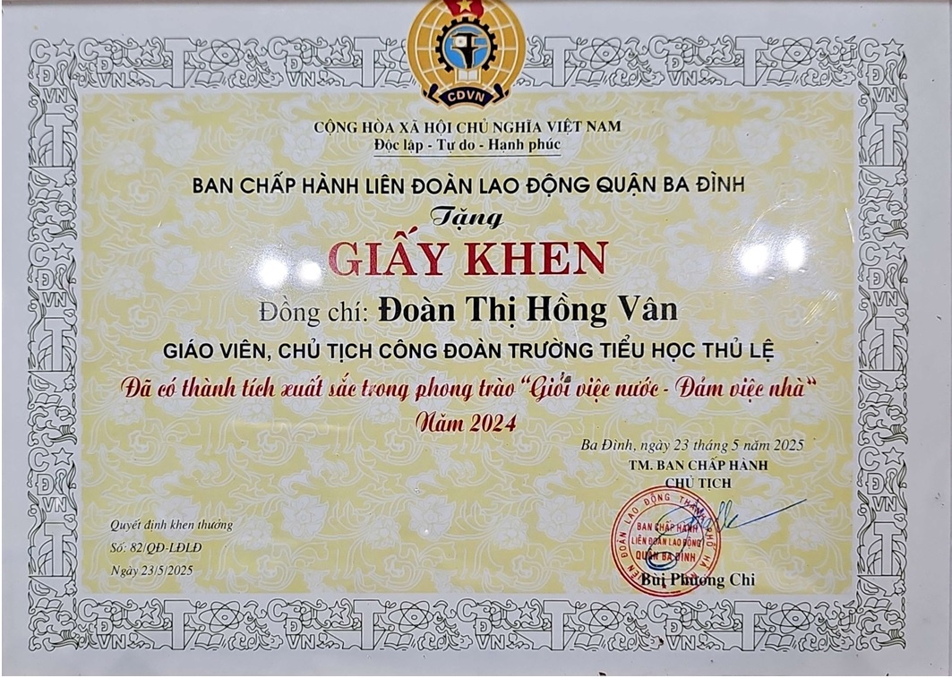 Bên thềm Ngày Nhà giáo Việt Nam 20/11/2025, trường Tiểu học Thủ Lệ xin lan tỏa niềm vui và chúc mừng 2 cô giáo vinh dự nhận giấy khen của Liên đoàn Lao động quận Ba Đình vì thành tích “Giỏi việc nước – Đảm việc nhà” và “Gia đình công nhân viên chức lao động tiêu biểu năm 2024”.
