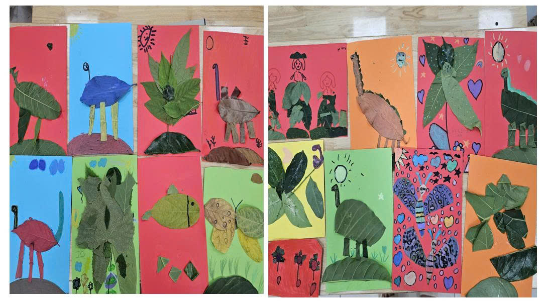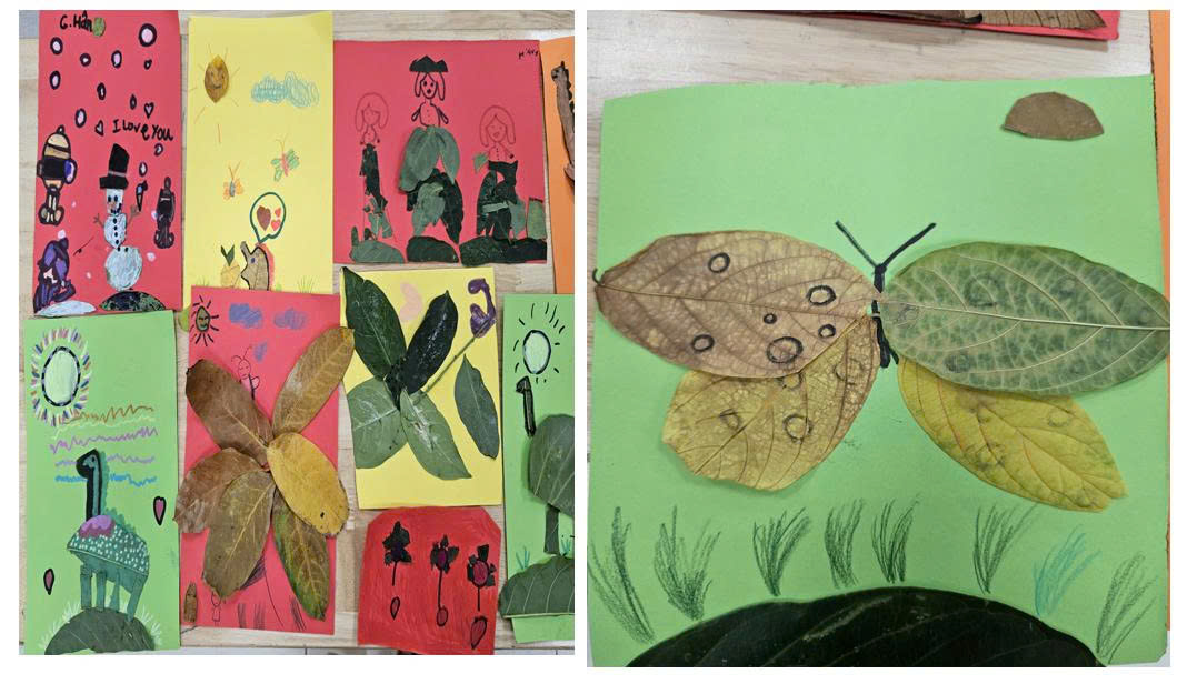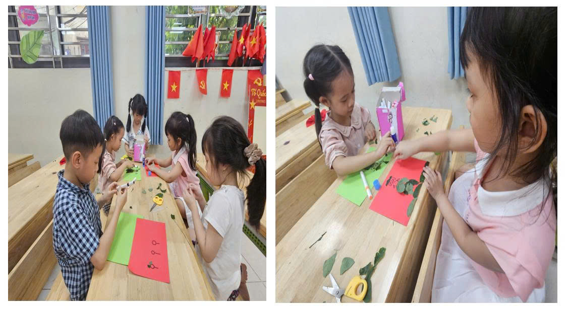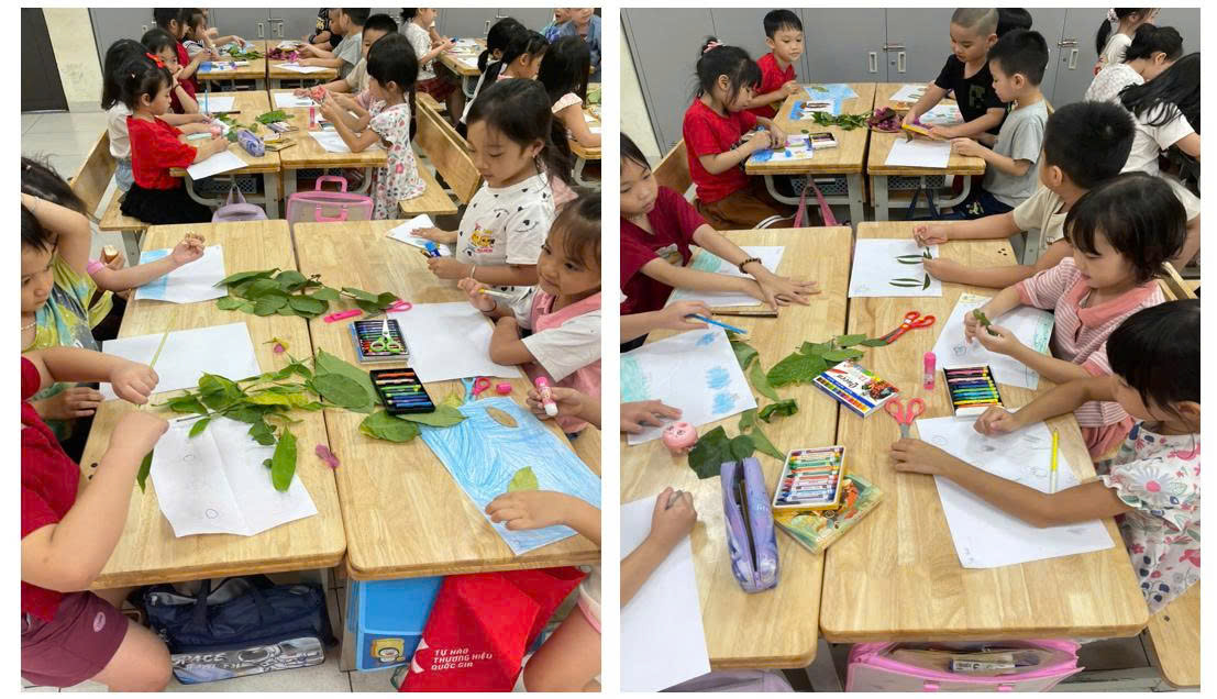 Từ những chiếc lá,dưới đôi bàn tay khéo léo và trí tưởng tượng phong phú, các em đã biến chúng thành những bức tranh sinh động: chú cá tung tăng trong làn nước, đàn chim tung cánh trên bầu trời, hay những bông hoa đầy sắc màu.