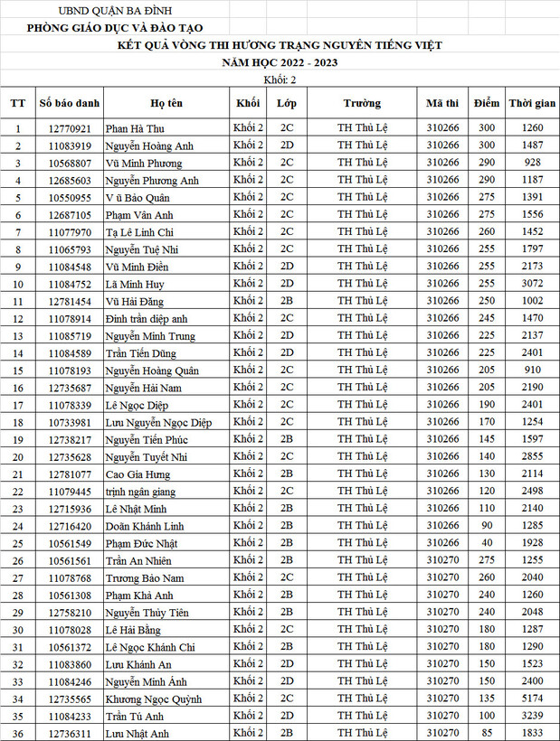 Ban tổ chức cuộc thi Trạng nguyên Tiếng Việt Trường Tiểu học Thủ Lệ trân trọng thông báo kết quả vòng thi Hương của các sĩ tử khối 2: