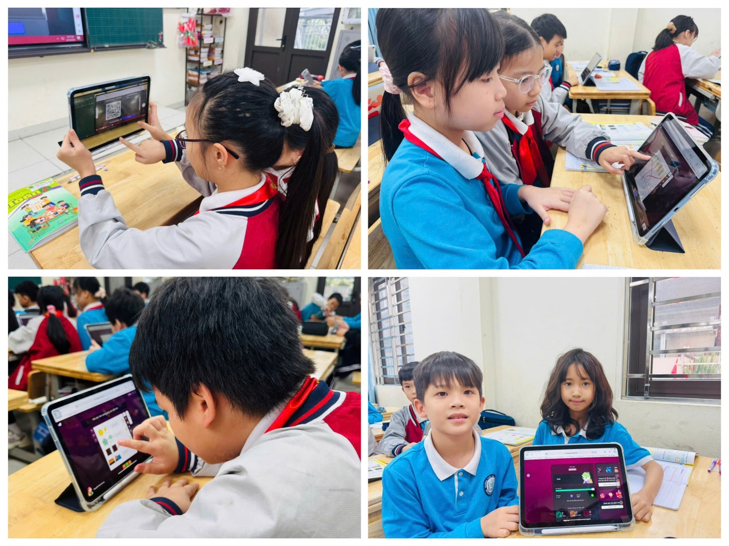 Với iPad, các con được nhìn thấy phân số hiện lên sinh động qua hình ảnh, phần tô màu, chia phần, kéo – thả, chọn đáp án… Nhiều bạn thích thú vì “con hiểu nhanh hơn”, “con làm đúng bài”, có bạn còn mỉm cười vì lần đầu thấy Toán “giống như một trò chơi mà vẫn học được bài”. Điều đáng quý là các con tự tin hơn khi trình bày, mạnh dạn chia sẻ cách làm, và vui vẻ hợp tác cùng bạn để kiểm tra kết quả trên màn hình.