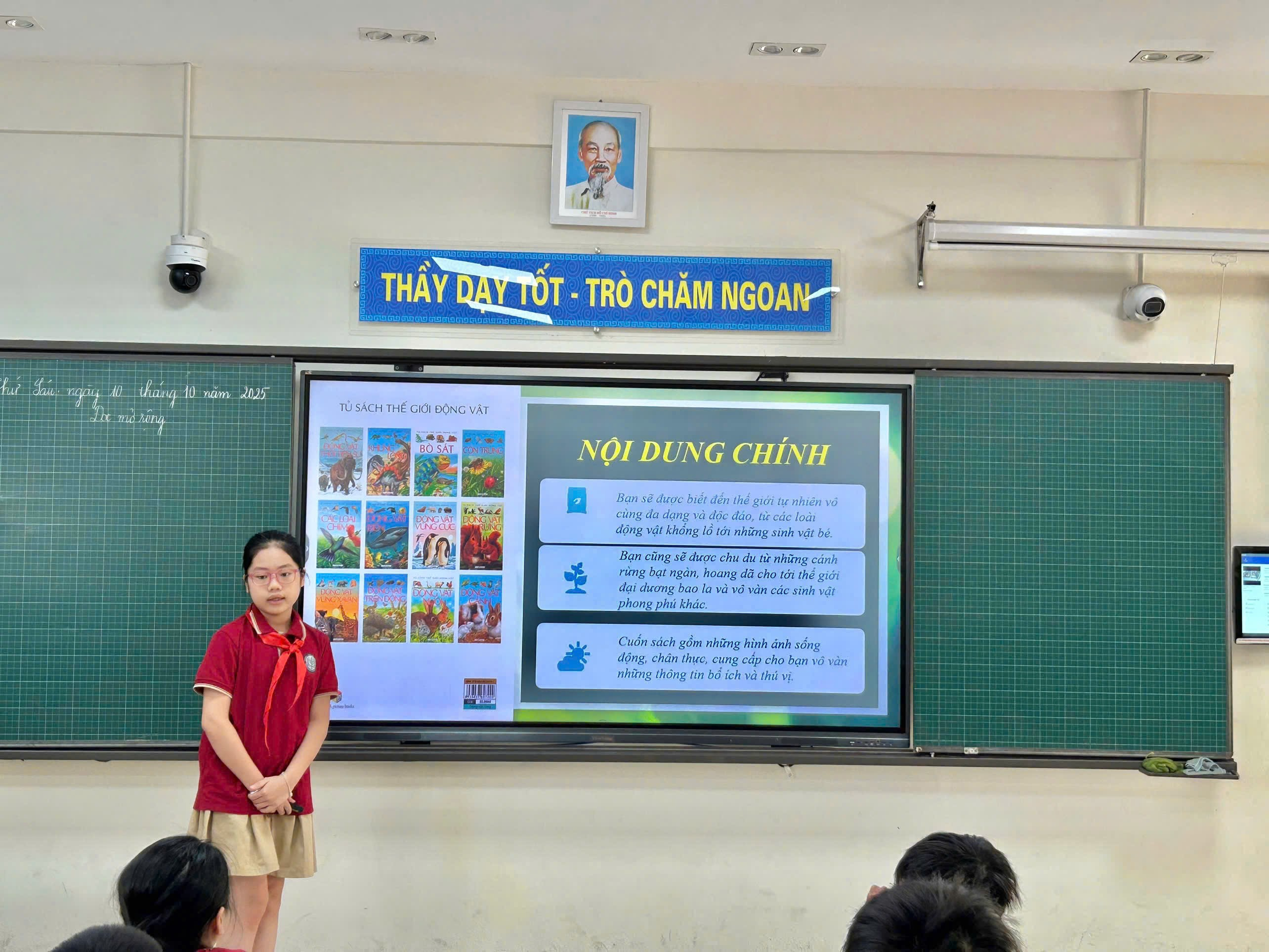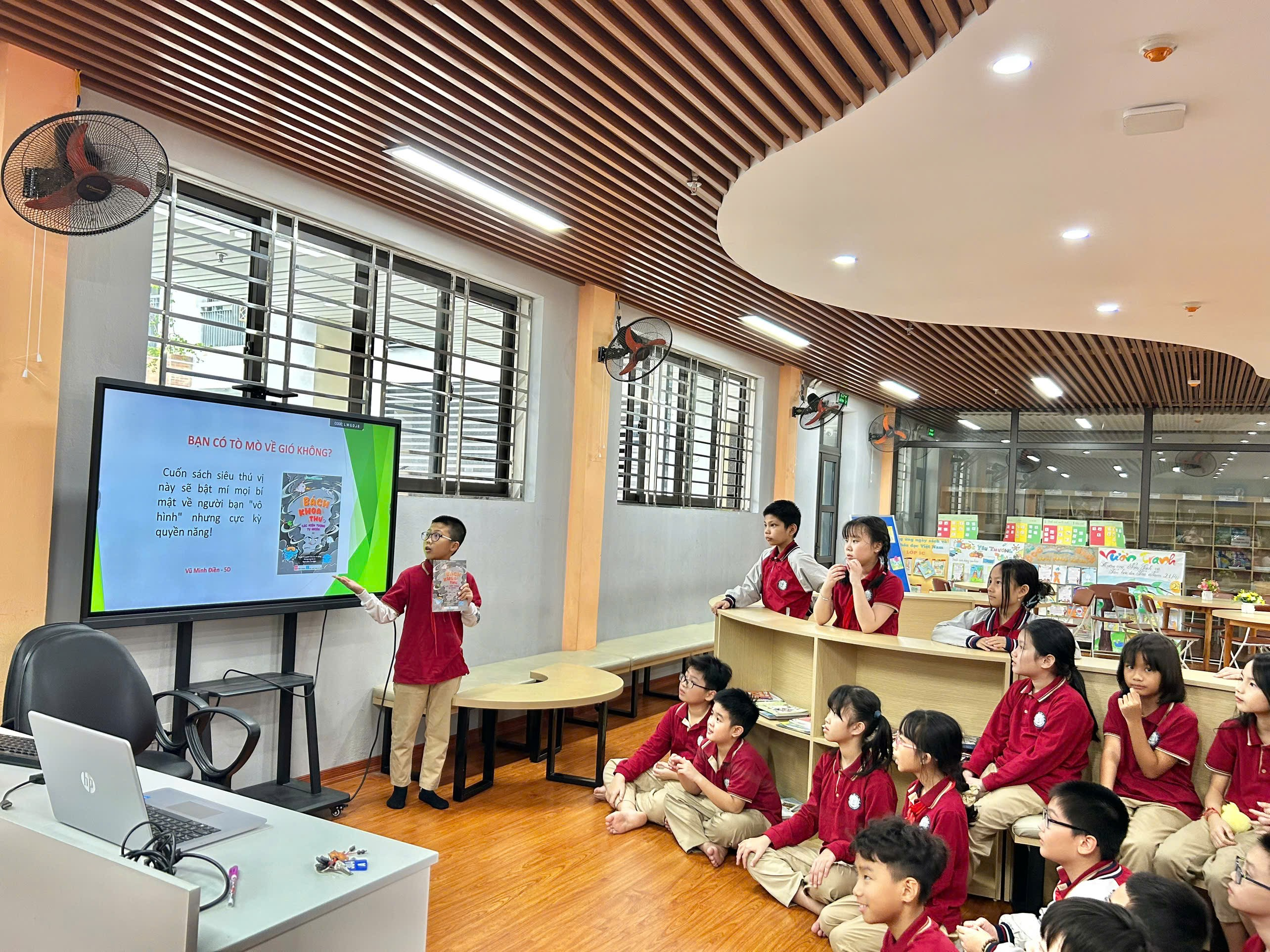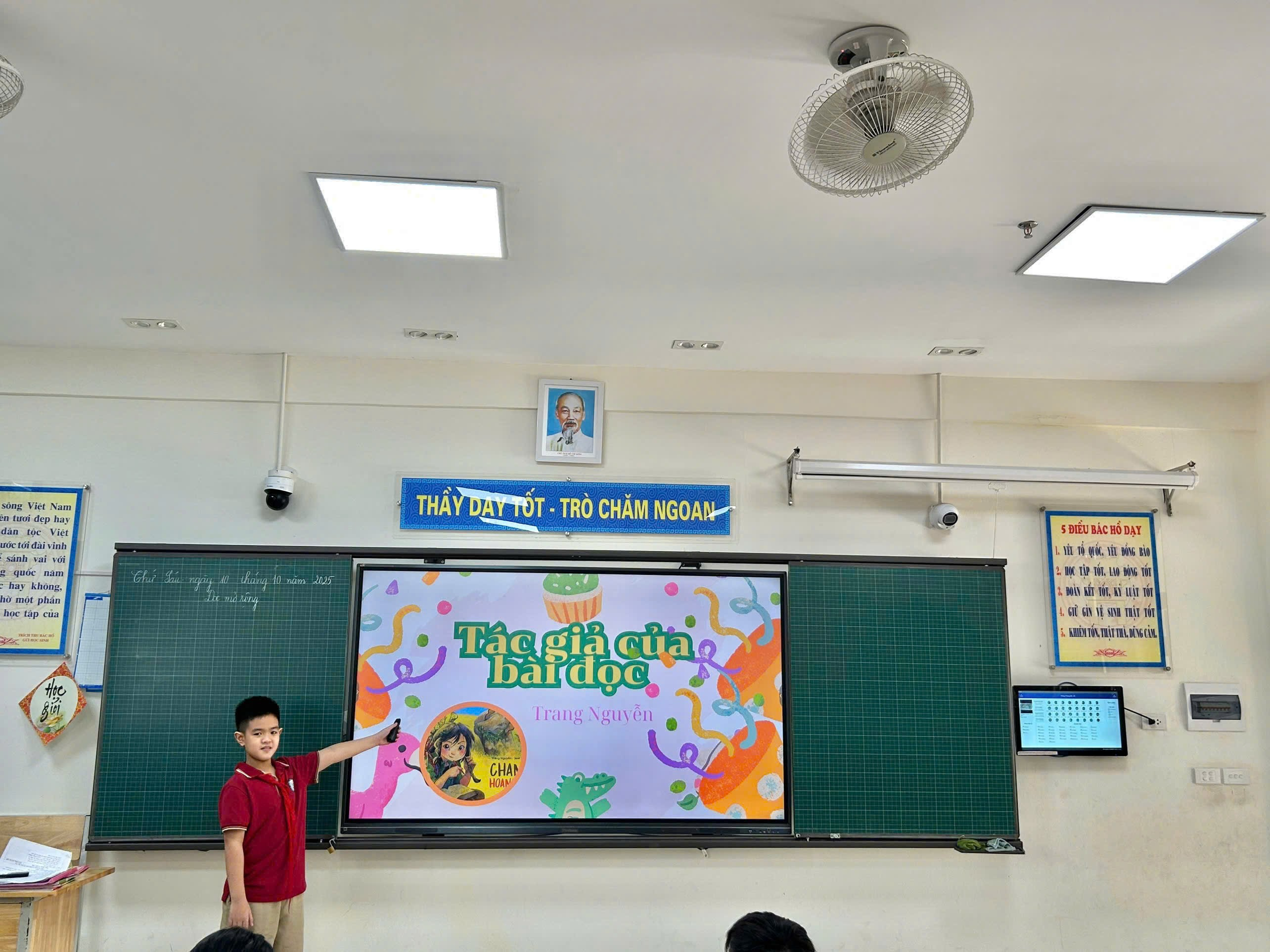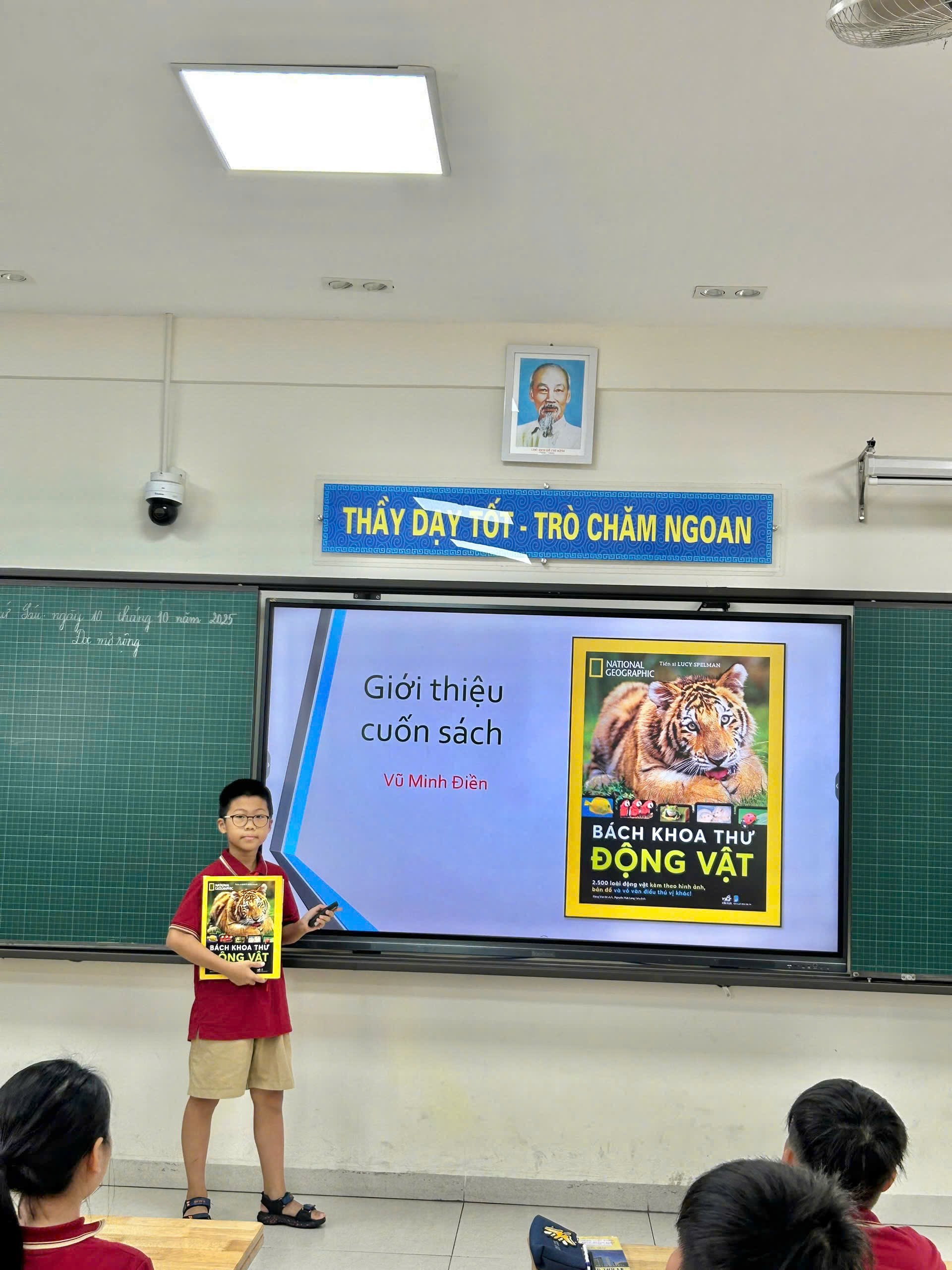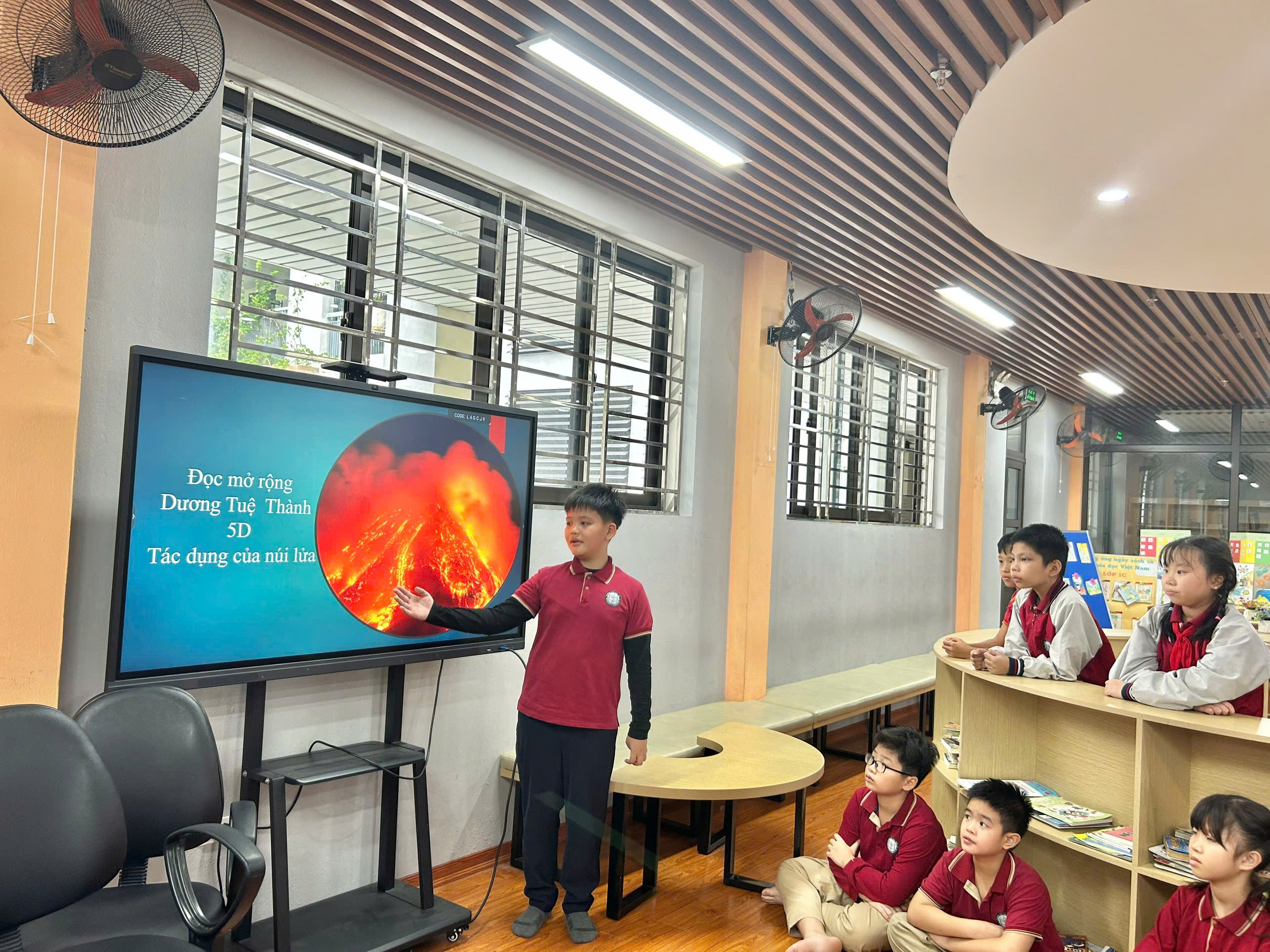 Đọc mở rộng thú vị ở chỗ nó giúp các bạn học sinh tiếp thu kiến thức, phát triển kỹ năng ngôn ngữ một cách tự nhiên và giảm căng thẳng. Thay vì phân tích sâu từng từ, từng bài đọc, đọc mở rộng giúp các bạn tập trung vào việc thưởng thức câu chuyện, mỗi học sinh được thoải mái tiếp nhận từ vựng mới và ngữ pháp trong ngữ cảnh thực tế. Điều này biến việc đọc thành một trải nghiệm thư giãn nhưng hiệu quả để mở rộng vốn từ và củng cố kiến thức đã học. Mỗi tuần sẽ có từng chủ đề cho từng tiết Đọc mở rộng, cô giáo khuyến khích các bạn học sinh về nhà đọc sách, tìm kiếm thông tin của cuốn sách từ Internet phục vụ cho chủ đề của bài học, sau đó được tự thiết kế video, hình ảnh trên phần mềm Canva, PowerPoint để giới thiệu về cuốn sách và những điều thú vị của cuốn sách mà mình đã đọc: Sau đây mời thầy cô và các bạn cùng xem lại những hình ảnh trong 7 tuần học vừa qua của cô trò lớp 5D nhé!