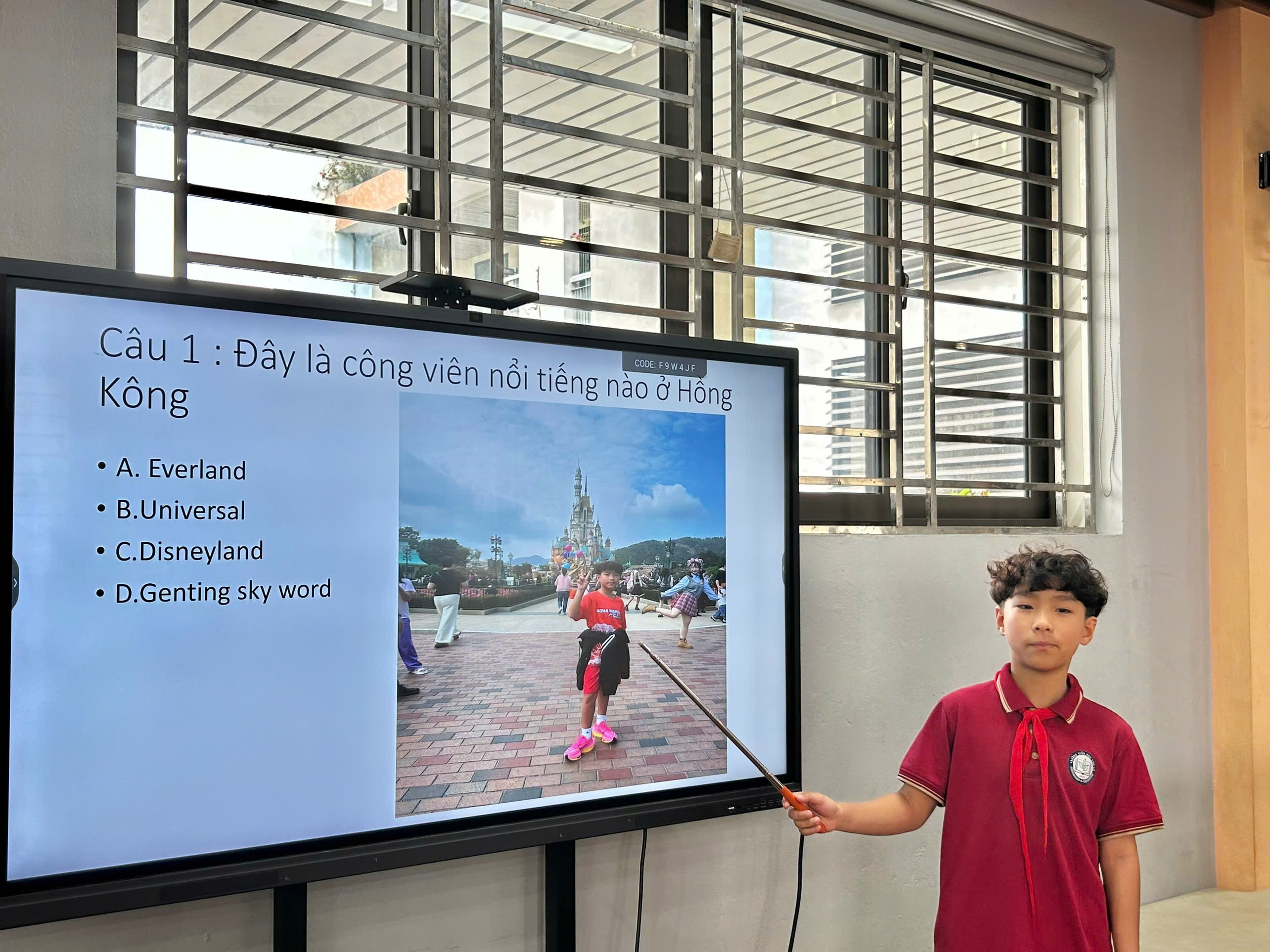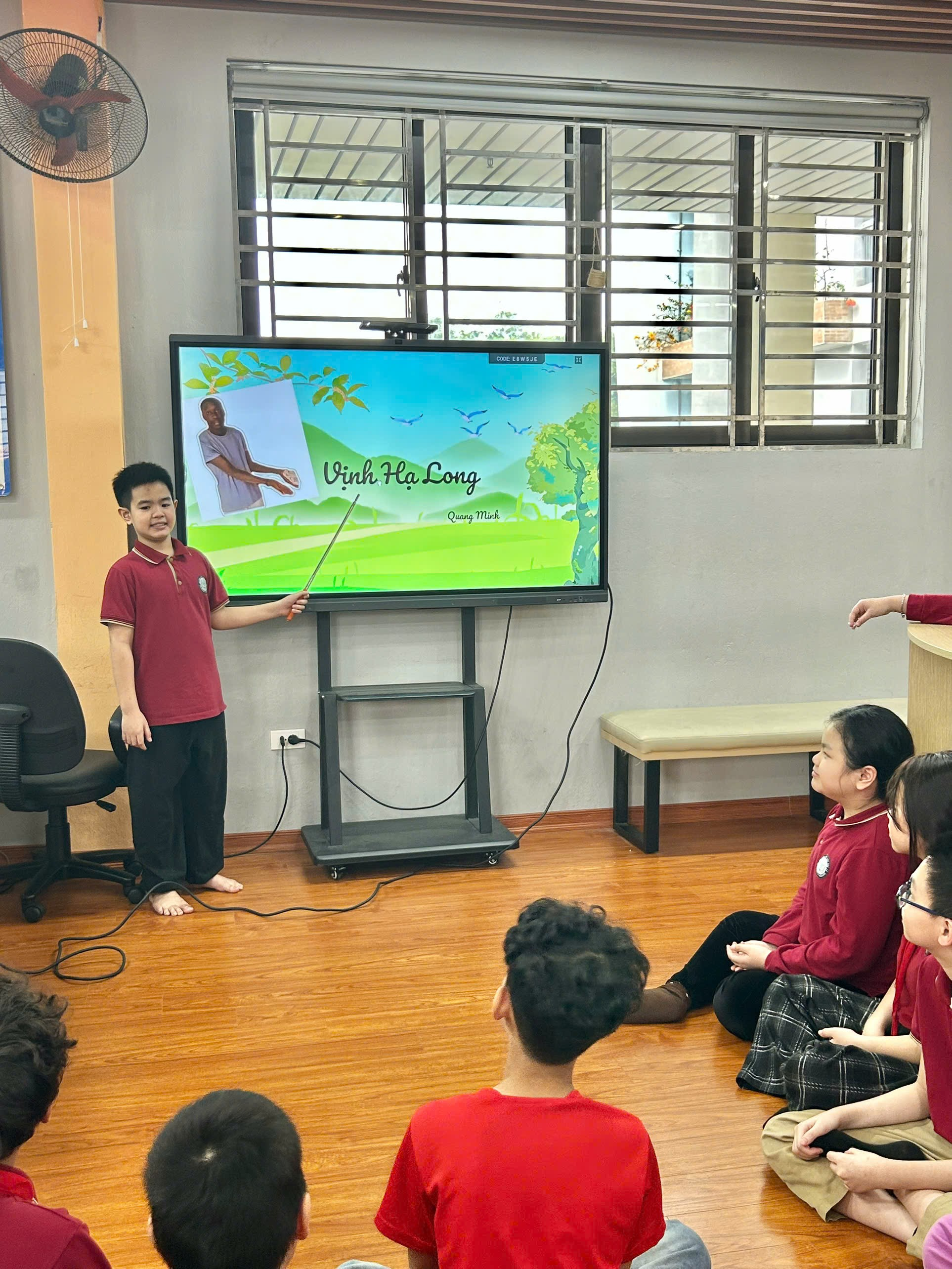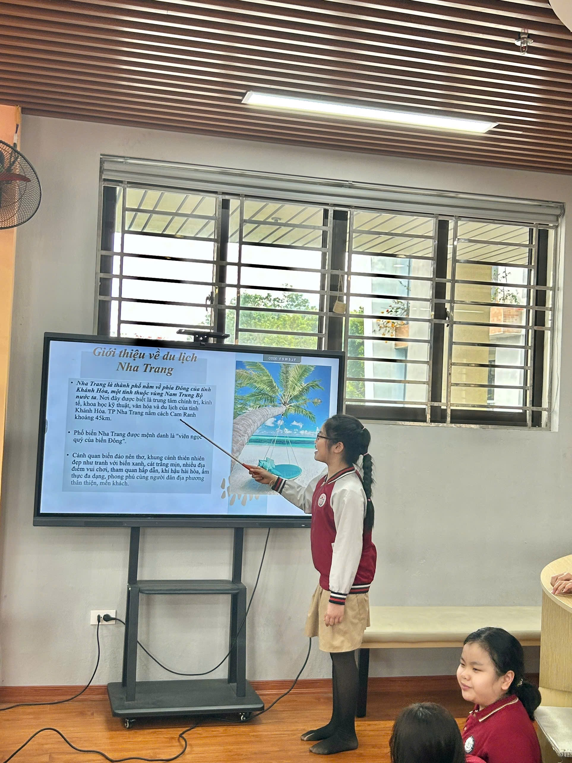 Mỗi phần trình bày đều được chuẩn bị công phu với hình ảnh minh họa sinh động, nội dung phong phú và cách thể hiện sáng tạo. Các con tự tin chia sẻ hiểu biết, trải nghiệm cá nhân cũng như những điều thú vị tìm hiểu được về lịch sử, văn hóa và đặc trưng của từng địa danh. Không chỉ dừng lại ở việc nói, học sinh còn rèn luyện kỹ năng lắng nghe tích cực, đặt câu hỏi và phản hồi ý kiến bạn một cách lịch sự, xây dựng.