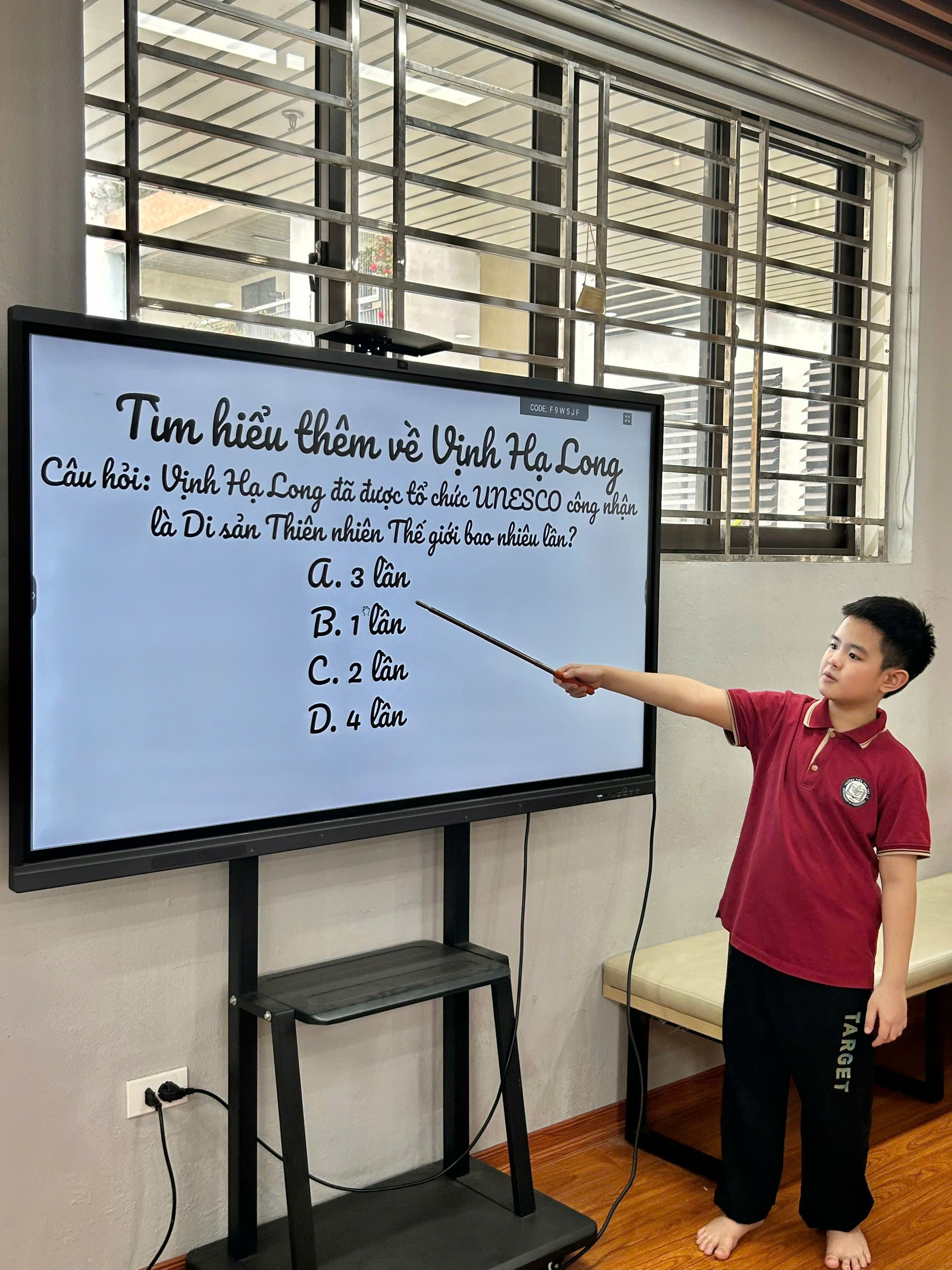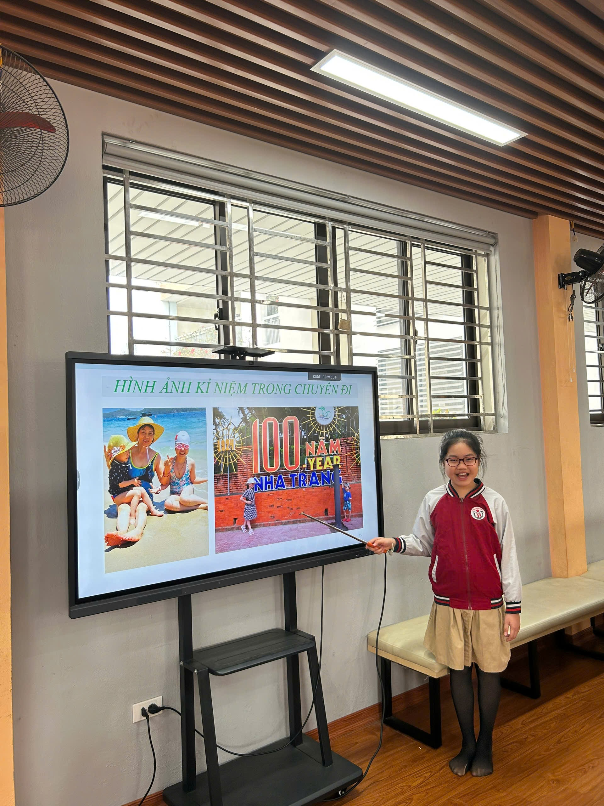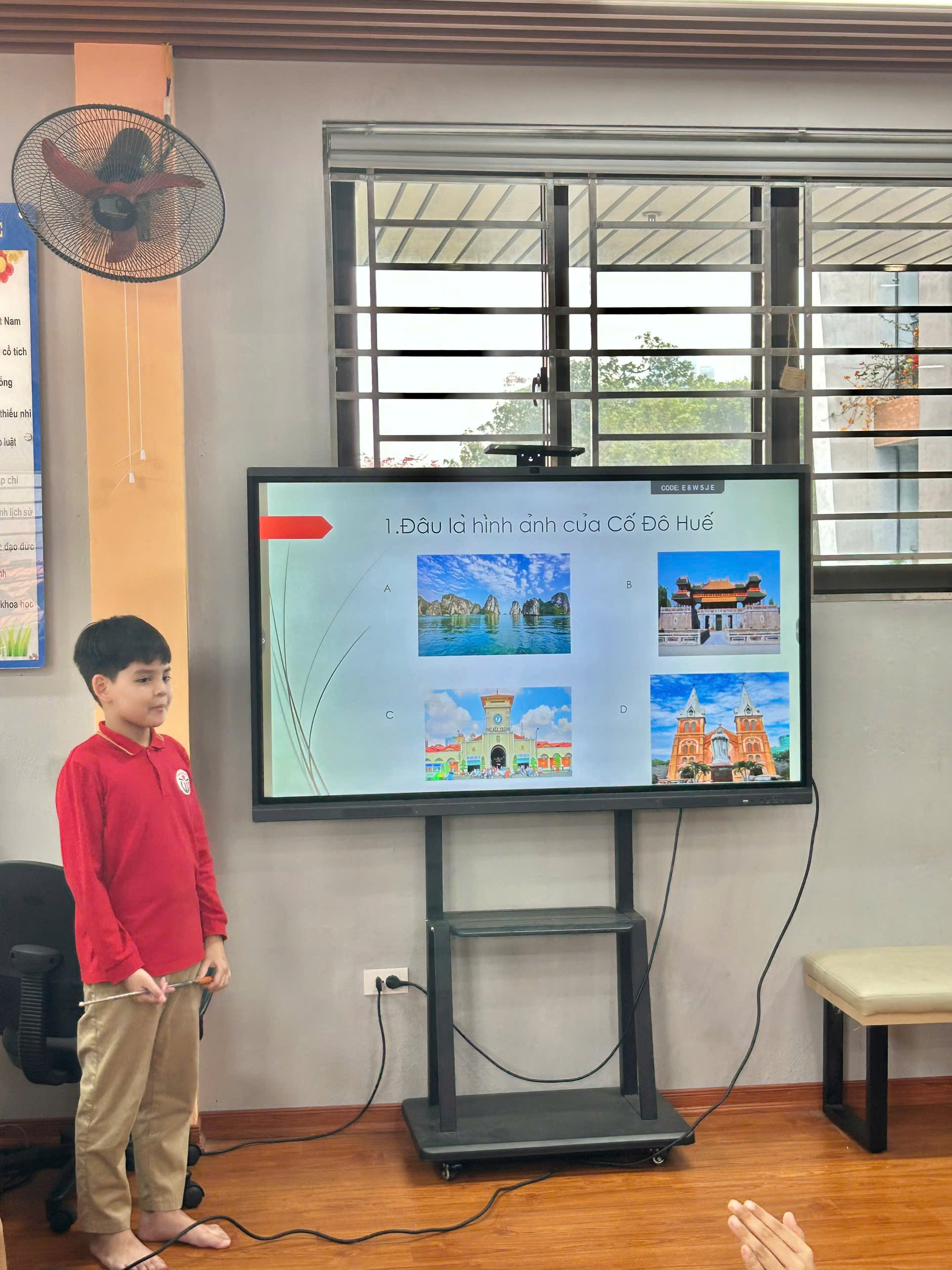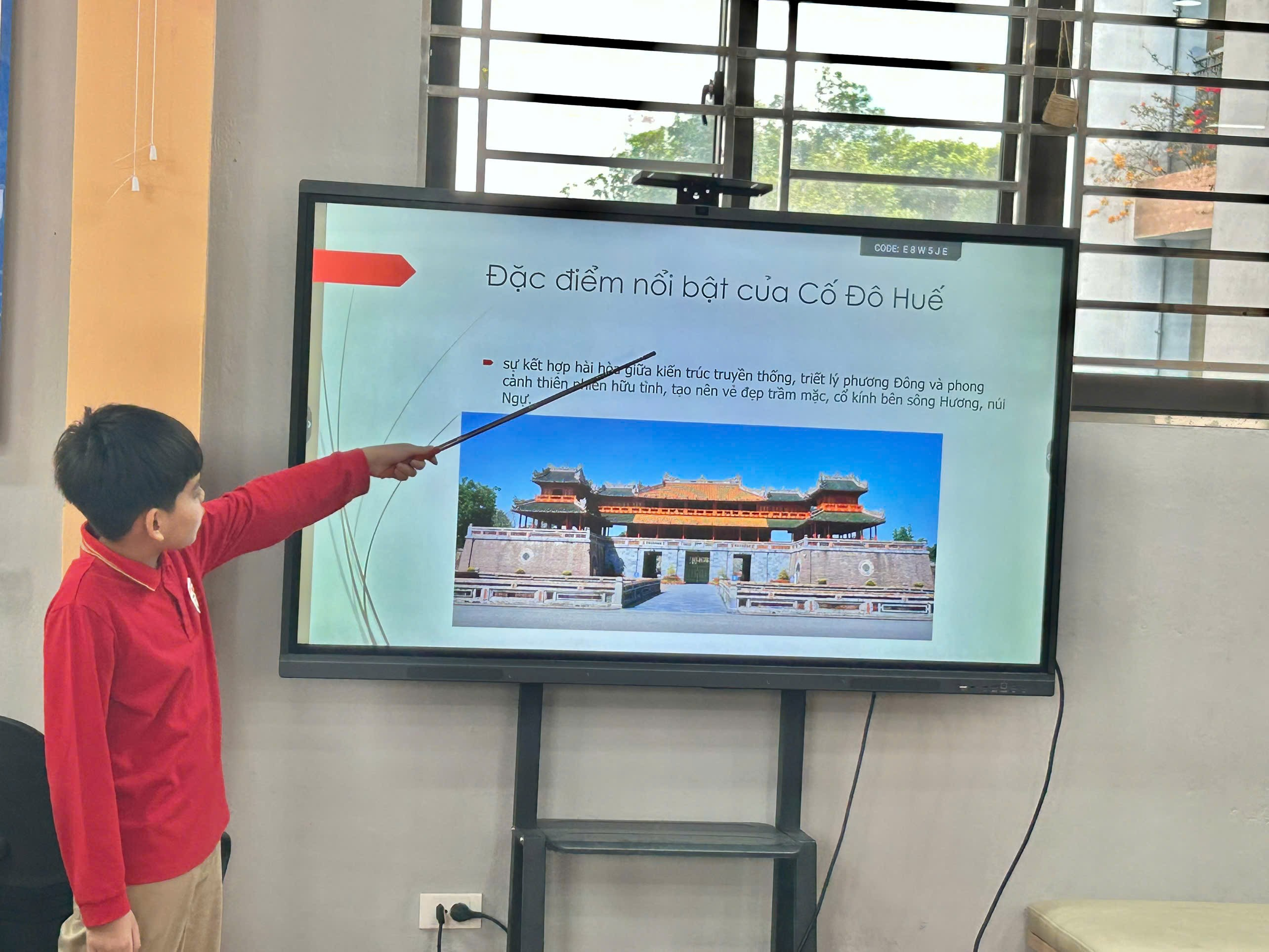 Mỗi phần trình bày đều được chuẩn bị công phu với hình ảnh minh họa sinh động, nội dung phong phú và cách thể hiện sáng tạo. Các con tự tin chia sẻ hiểu biết, trải nghiệm cá nhân cũng như những điều thú vị tìm hiểu được về lịch sử, văn hóa và đặc trưng của từng địa danh. Không chỉ dừng lại ở việc nói, học sinh còn rèn luyện kỹ năng lắng nghe tích cực, đặt câu hỏi và phản hồi ý kiến bạn một cách lịch sự, xây dựng.