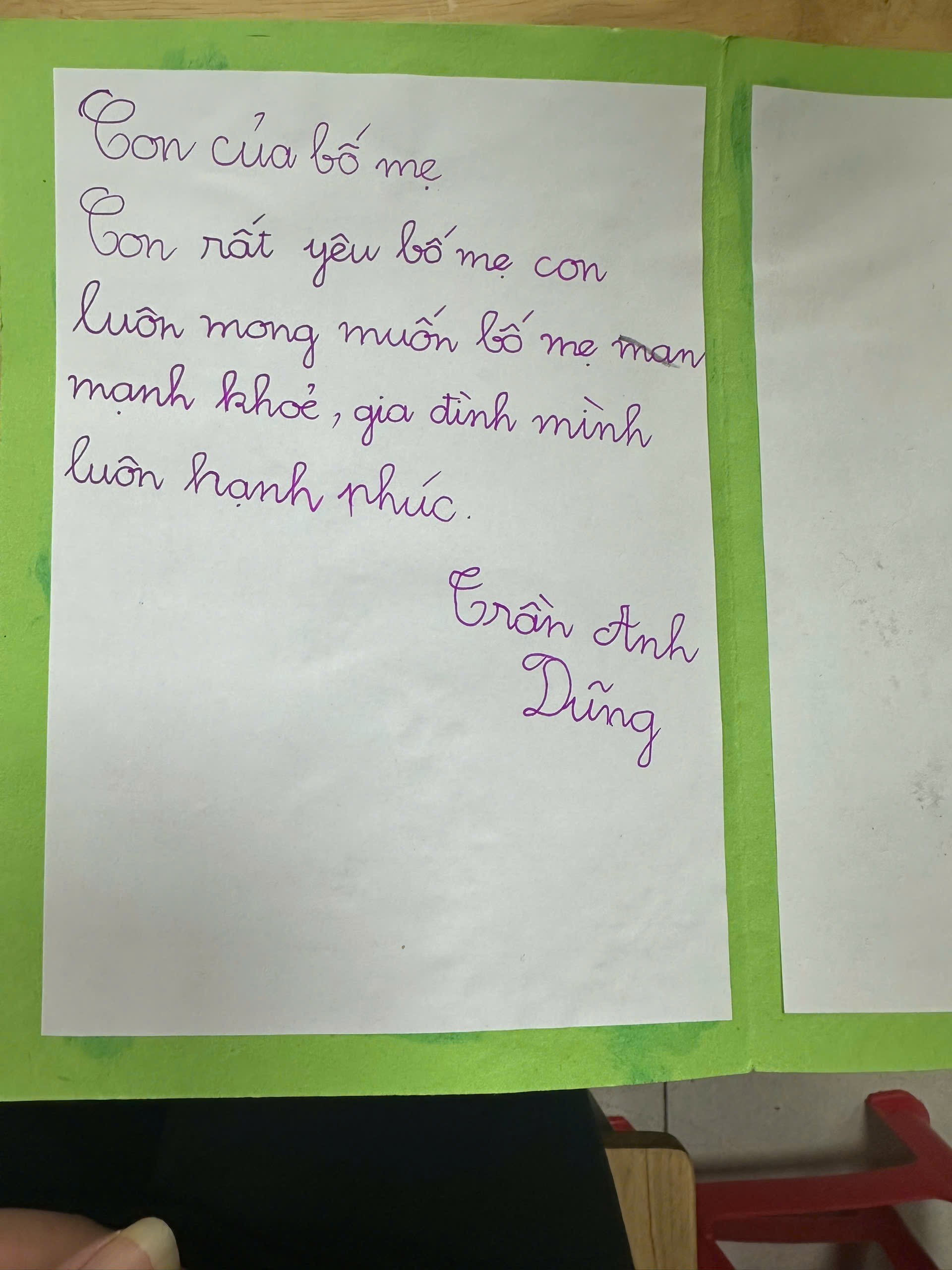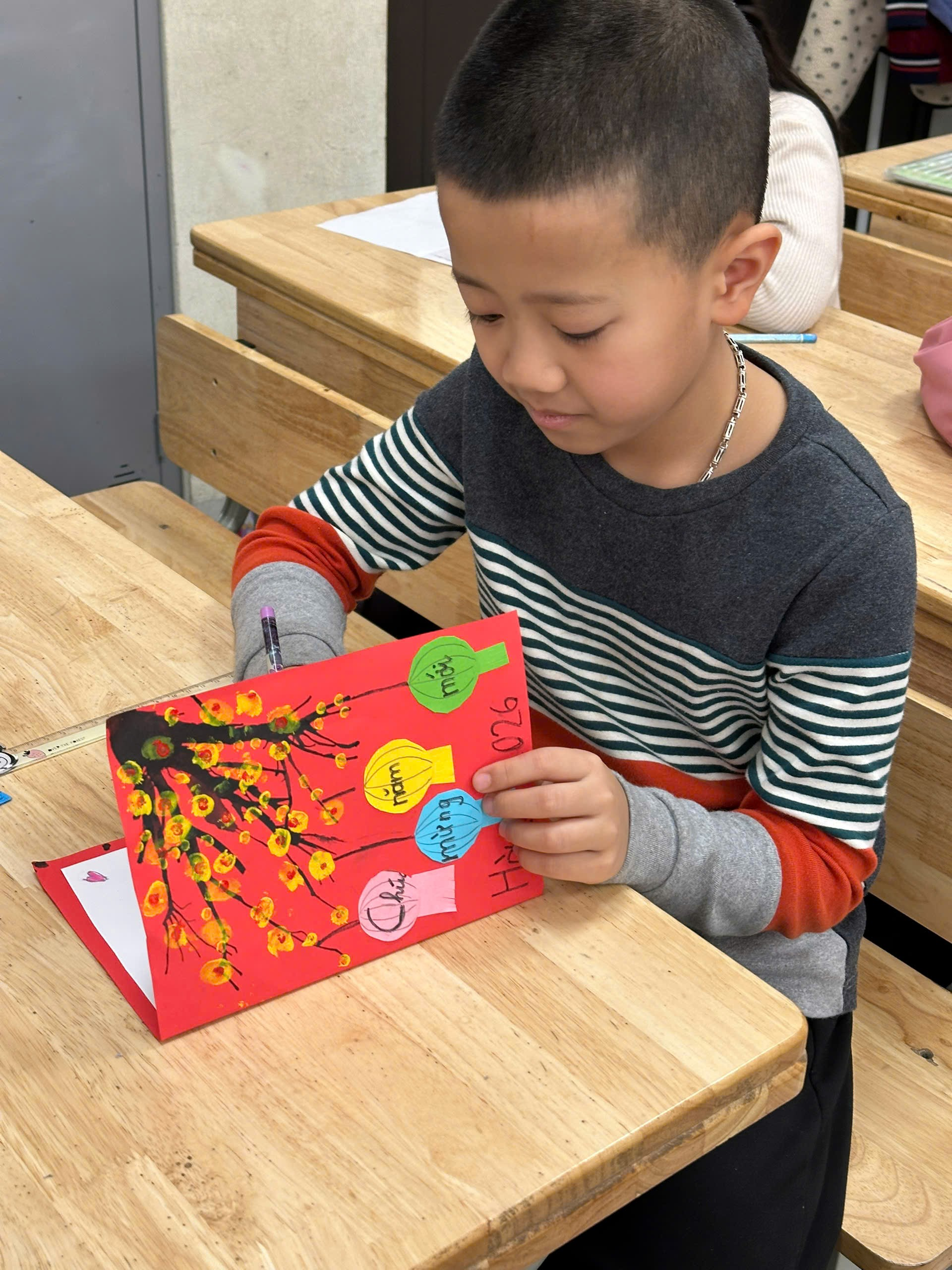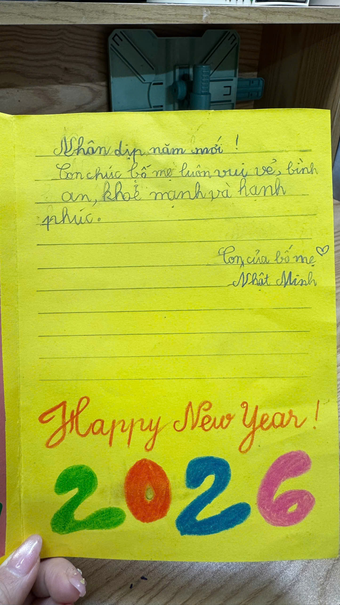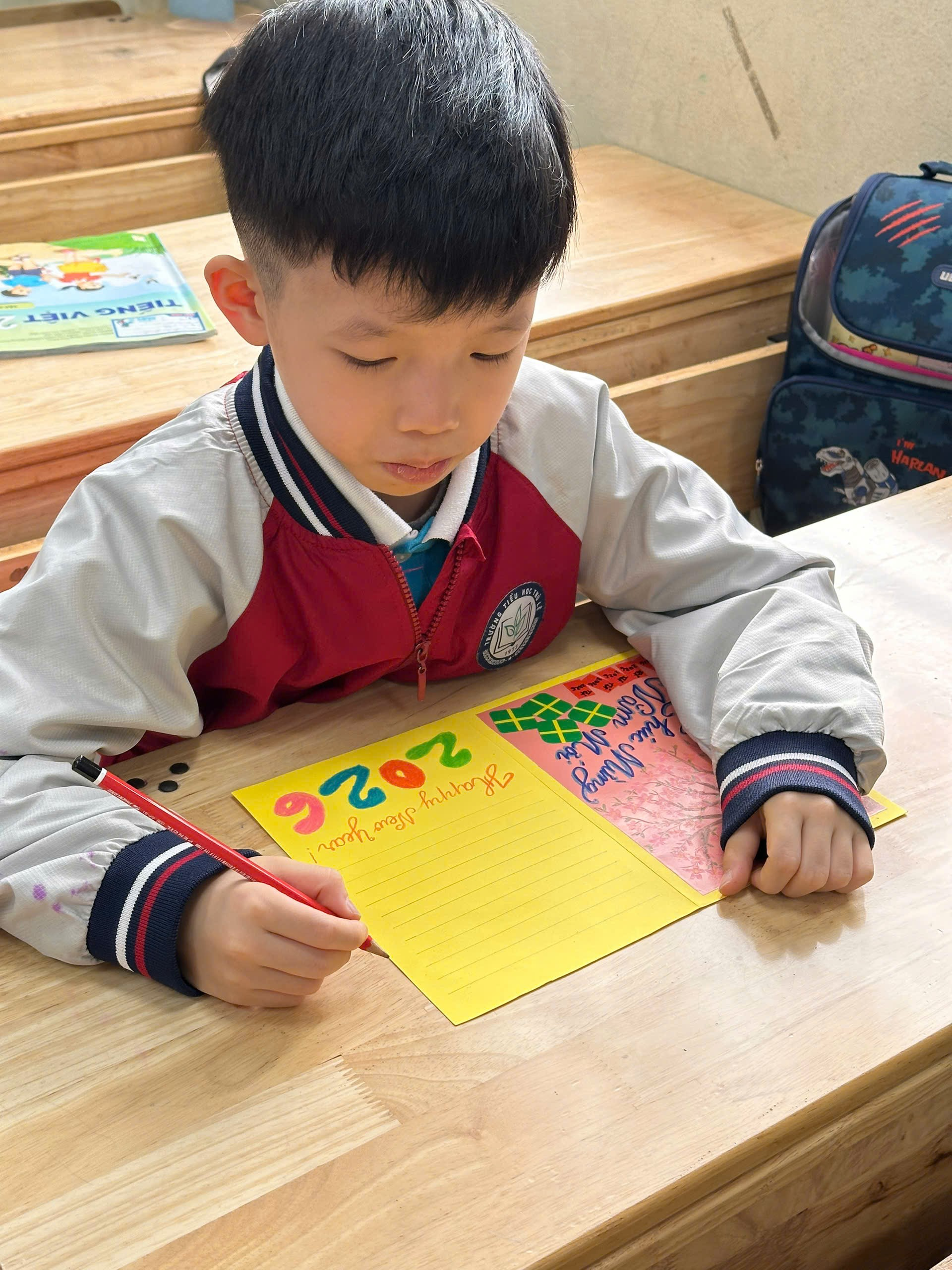 Không chỉ dừng lại ở việc làm thiệp, các em còn tập viết những lời chúc Tết giản dị mà chan chứa yêu thương để gửi đến ông bà, cha mẹ, người thân hay những người bạn ở xa. Mỗi lời chúc tuy còn nét chữ non nớt nhưng lại thể hiện được tình cảm chân thành và sự cố gắng của các con trong từng câu chữ.