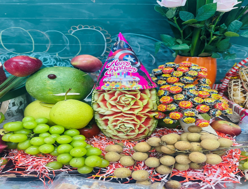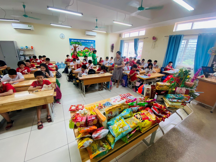 Học sinh lớp 5C cùng cô giáo và bố mẹ bày mâm cỗ rất sinh động