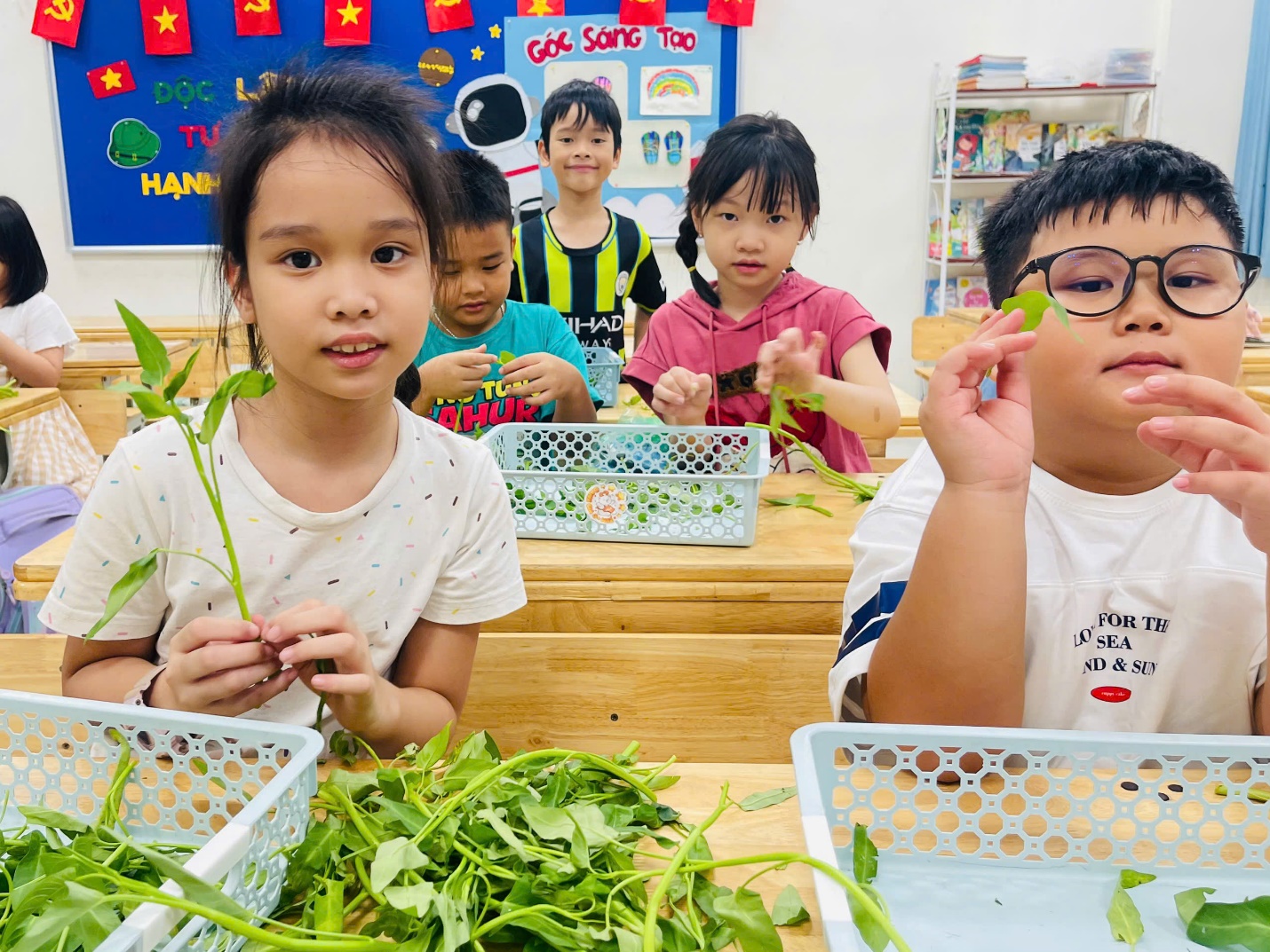 Ai bảo nhặt rau là buồn chán? Ở lớp, chúng mình vừa được cô giáo hướng dẫn cách nhặt rau để có thể giúp đỡ bố mẹ, lại vừa được trò chuyện ríu rít thật vui.