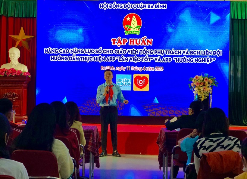 Thầy giáo Trần Minh Cường – Giảng viên Khoa Kỹ năng nghiệp vụ Đội – Trường Lê Duẩn hướng dẫn nội dung Nâng cao năng lực số cho giáo viên TPT và BCH Liên đội.