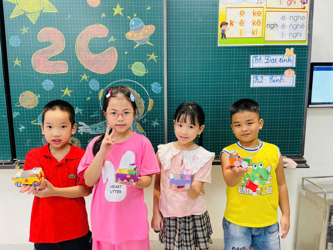 Tại nơi đây, các em biết biến ý tưởng thành sản phẩm thực tế – từ vòng tay tình bạn, tranh cầu vồng đến “siêu xe” từ vỏ hộp sữa.