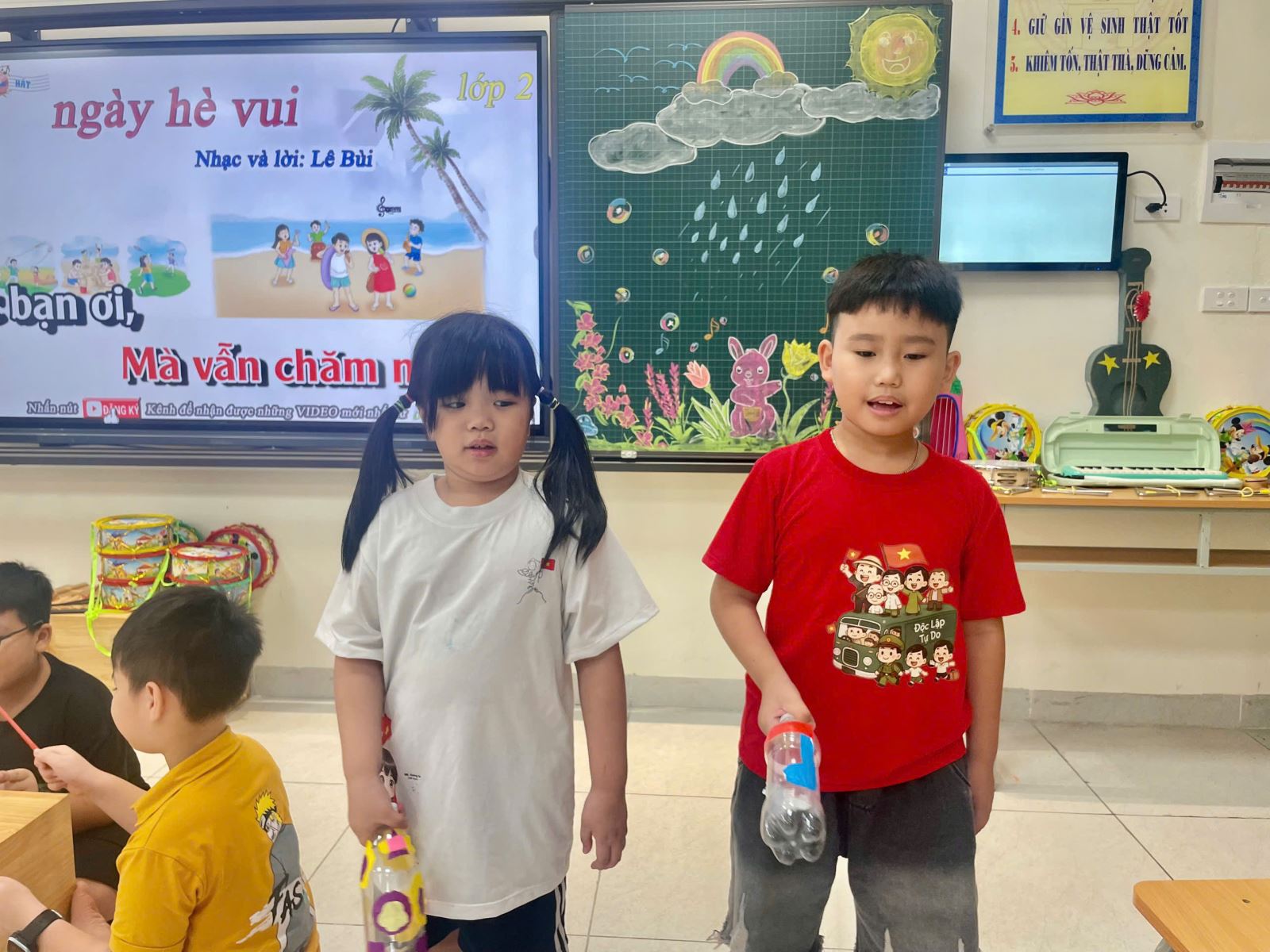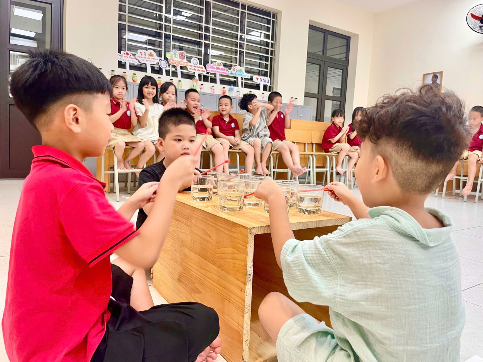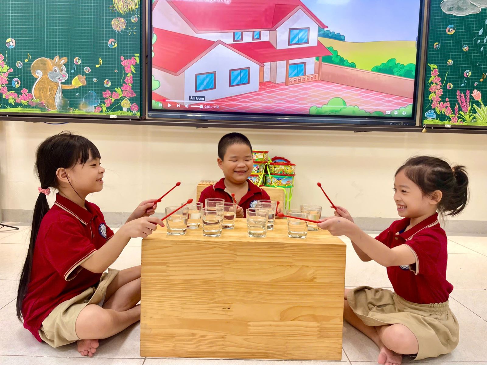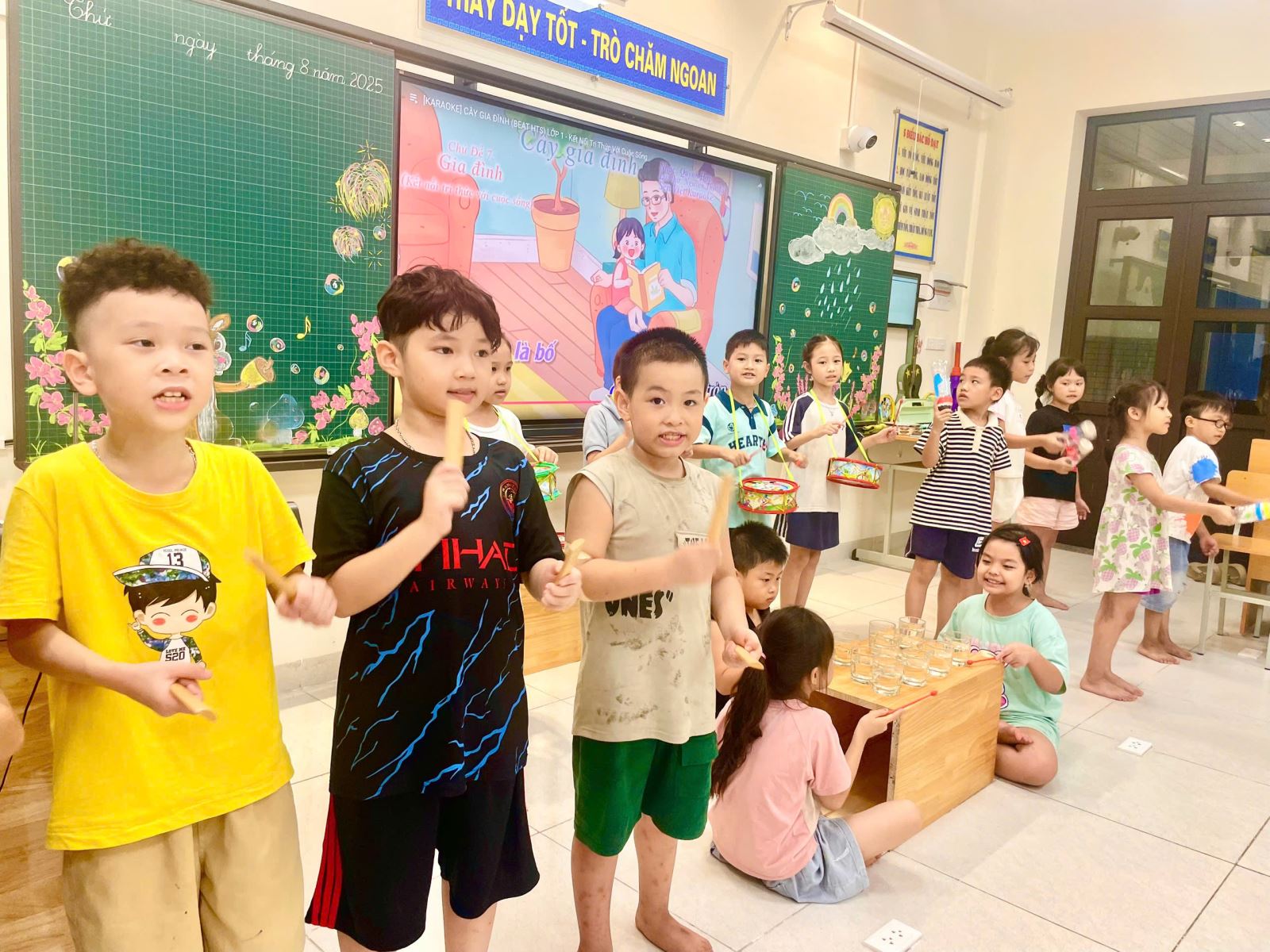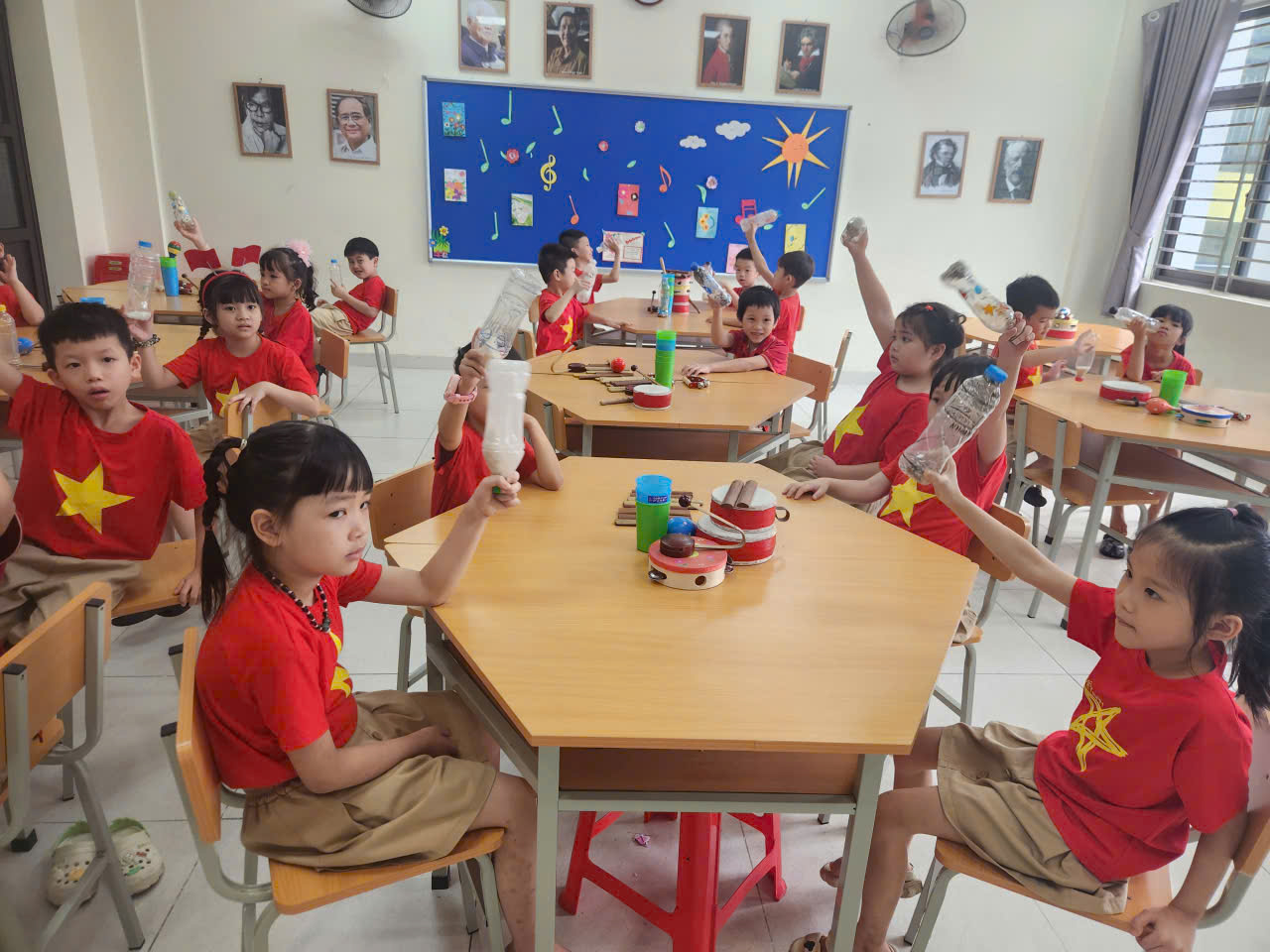 Không chỉ dừng lại ở ca hát hay nhảy múa, các em còn được khám phá thế giới âm thanh xung quanh, từ tiếng lá cây xào xạc, tiếng nước chảy róc rách đến những âm thanh quen thuộc hàng ngày. Đặc biệt, các em đã sáng tạo ra nhạc cụ từ những đồ vật gần gũi như cốc thủy tinh, chai nhựa, đũa tre…, để tạo nên những giai điệu độc đáo và giàu tính nghệ thuật.