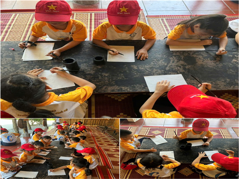 Chuyến đi bắt đầu với hoạt động viết chữ Nho, giúp các em học sinh khám phá và tìm hiểu về một nét văn hóa truyền thống của dân tộc. Các em được hướng dẫn cách cầm bút, viết những chữ Nho cơ bản dưới sự chỉ dẫn tận tình của các thầy cô. Đây là một cơ hội quý báu để các em tìm hiểu thêm về lịch sử và văn hóa của ông cha ta, đồng thời phát triển khả năng tập trung và kiên nhẫn.