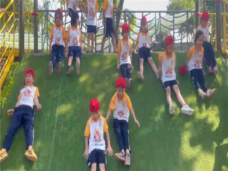 Sau những giờ phút học hỏi lý thuyết, các em được tham gia các trò chơi vận động ngoài trời, đặc biệt là trò trượt cỏ và trượt rip lai. Các trò chơi này giúp các em thỏa sức vui chơi, vận động và tăng cường sự dẻo dai, linh hoạt. Mỗi lần trượt xuống đồi cỏ, tiếng cười của các em vang vọng cả khu vực, tạo nên một không khí vui tươi, náo nhiệt.