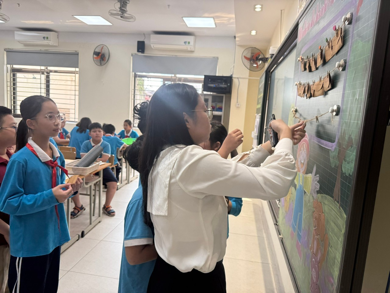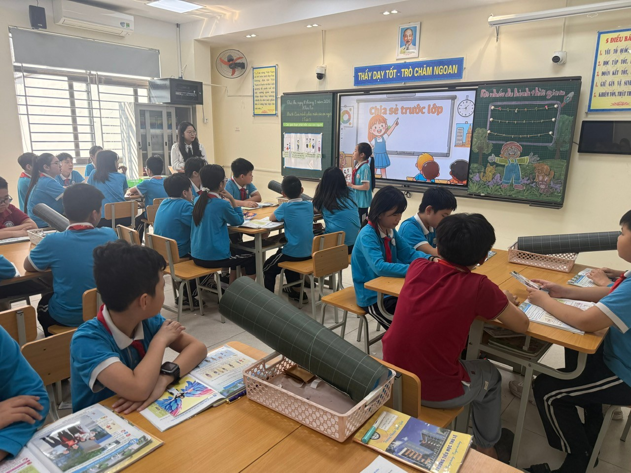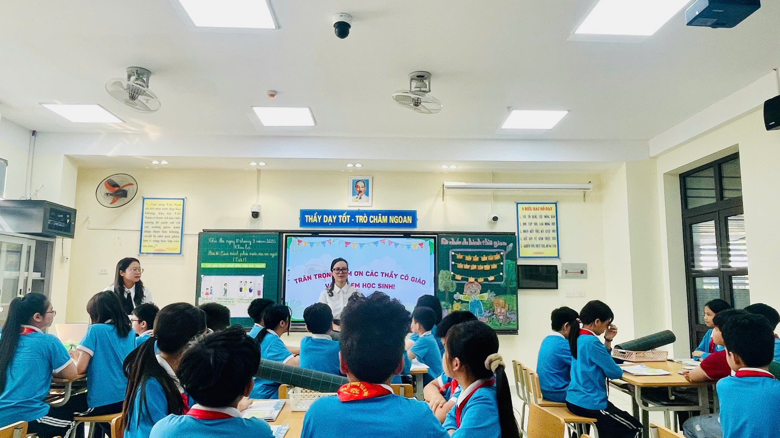 Xuyên suốt tiết dạy, cô giáo và các em học sinh đã linh hoạt sử dụng các phương pháp dạy học tích cực: phương pháp thảo luận, phương pháp thuyết trình,… Cùng với đó, việc áp dụng AI trong bài giảng điện tử đã giúp cho các hình ảnh thêm sinh động, nhiều màu sắc, khơi gợi sự tìm tòi, tăng khả năng tập trung và chủ động tiếp thu kiến thức của các em học sinh.