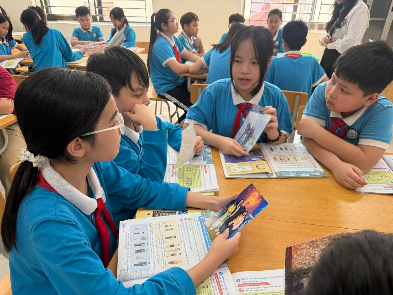Trong phần khám phá, học sinh được làm việc theo nhóm, sắp xếp các hình ảnh và thẻ chữ tương ứng tìm hiểu các giai đoạn phát triển của con người cùng độ tuổi đặc trưng của từng giai đoạn. Các em tích cực trao đổi, thảo luận và tự tin trình bày kết quả trước lớp, khiến không khí học tập trở nên sôi nổi và hào hứng.