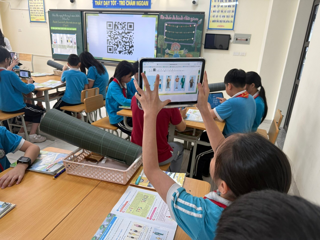 Đến phần luyện tập, học sinh tiếp tục làm việc theo nhóm đôi, sử dụng iPad để sắp xếp các hình ảnh về quá trình phát triển của con người theo đúng trình tự từ tuổi ấu thơ. Việc ứng dụng công nghệ đã giúp hoạt động học tập trở nên sinh động và hấp dẫn hơn.