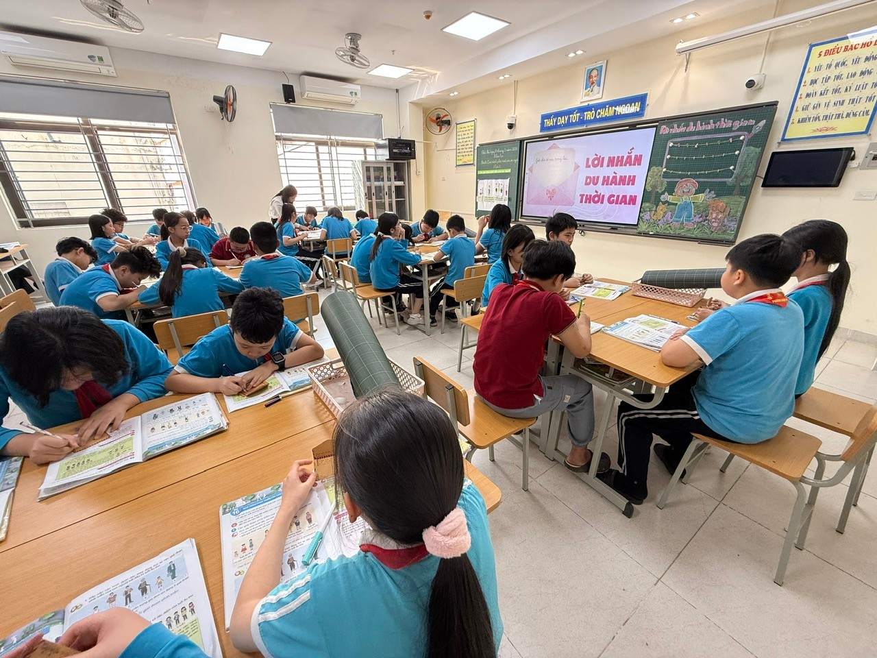 Kết thúc tiết học, cô giáo tổ chức hoạt động viết lời nhắn gửi đến chính mình trong tương lai. Trên những tấm thiệp nhỏ, các em gửi gắm những ước mơ hồn nhiên: trở thành bác sĩ chữa bệnh cho mọi người, làm phi công đưa bố mẹ đi du lịch khắp nơi, hay đơn giản là lớn lên trở thành một người tốt, biết yêu thương gia đình.