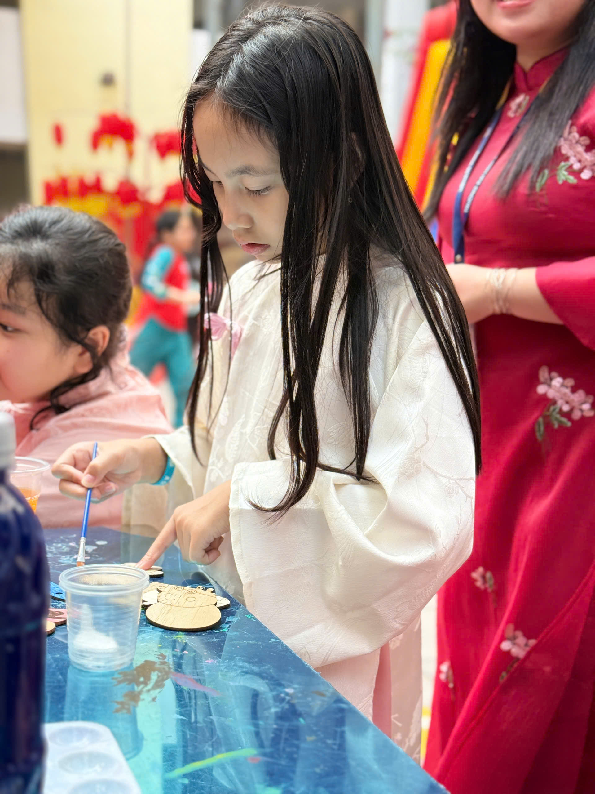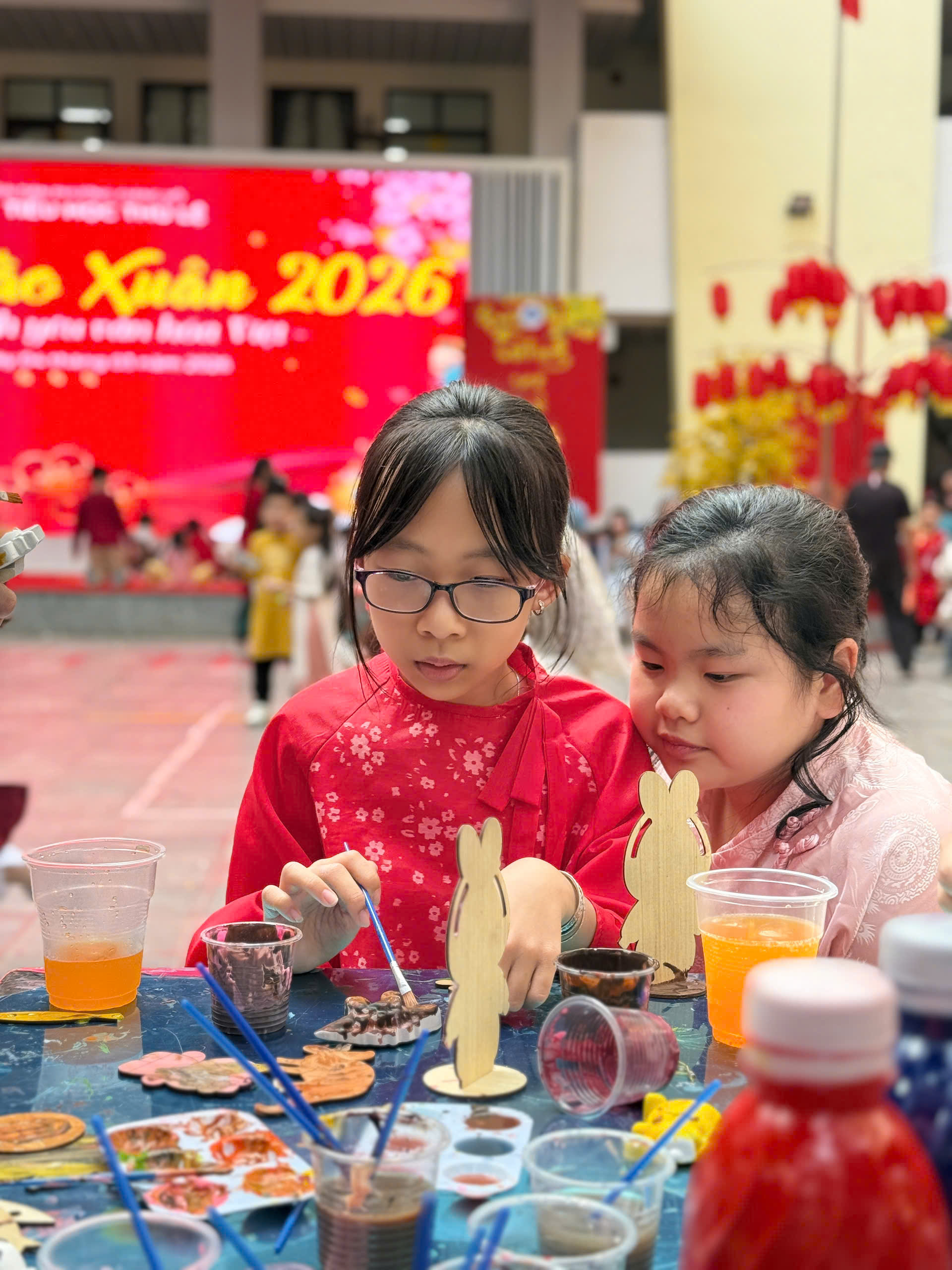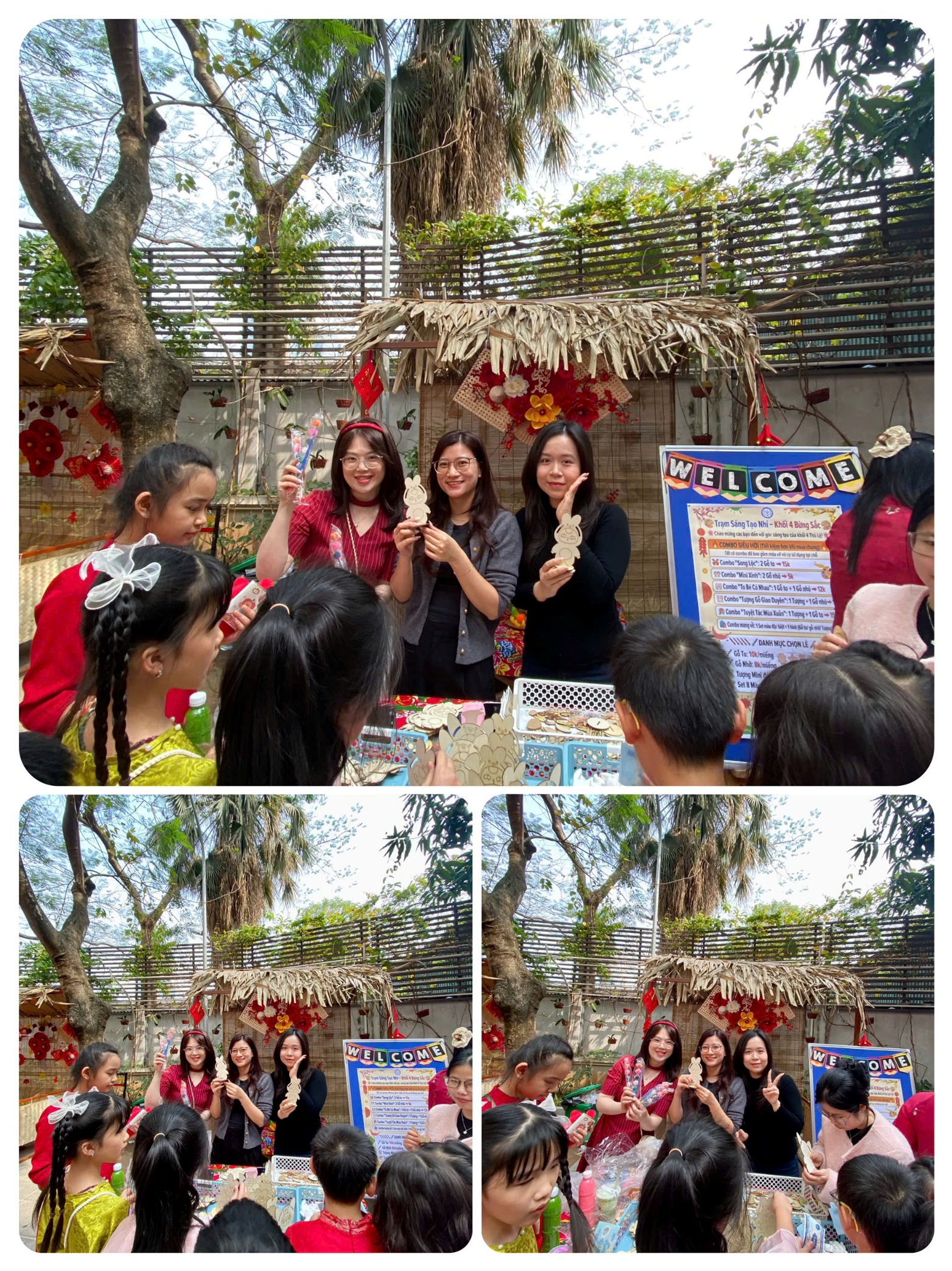 Buổi chiều, các cô giáo chủ nhiệm khối 4 đã cùng nhau trang trí gian hàng, tạo nên một không gian trải nghiệm ấm áp, bắt mắt và rất “mùa xuân”. Gian hàng nổi bật với hoạt động tô màu gỗ, tô tượng (nhiều mẫu hình ngộ nghĩnh, thú vị), thu hút đông đảo học sinh đến tham quan, mua sản phẩm và trực tiếp tô vẽ tại chỗ.
