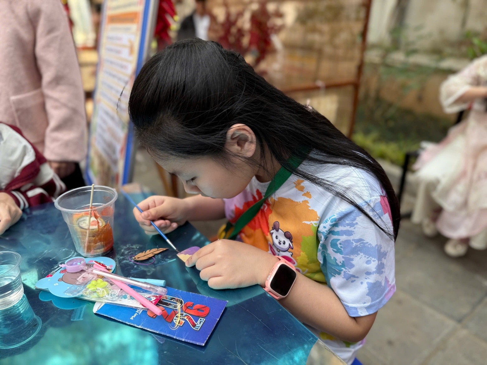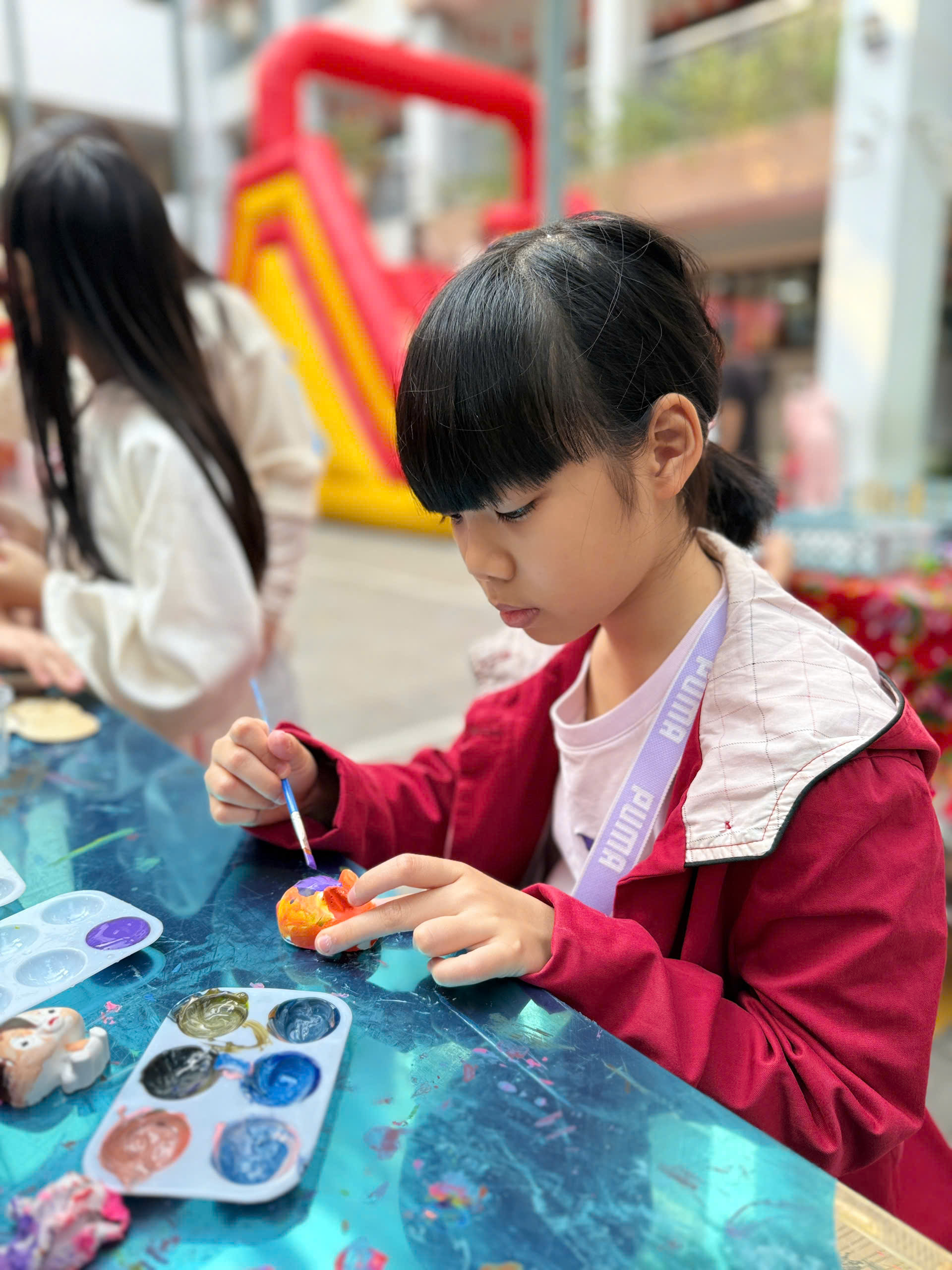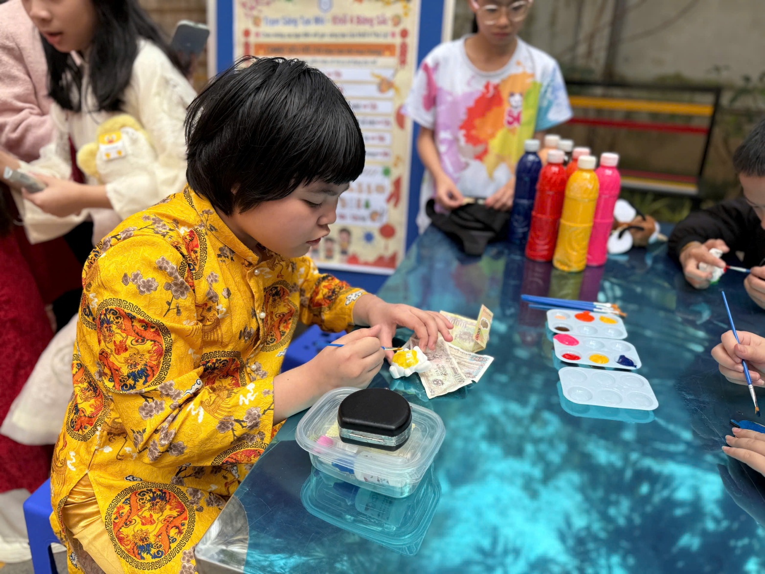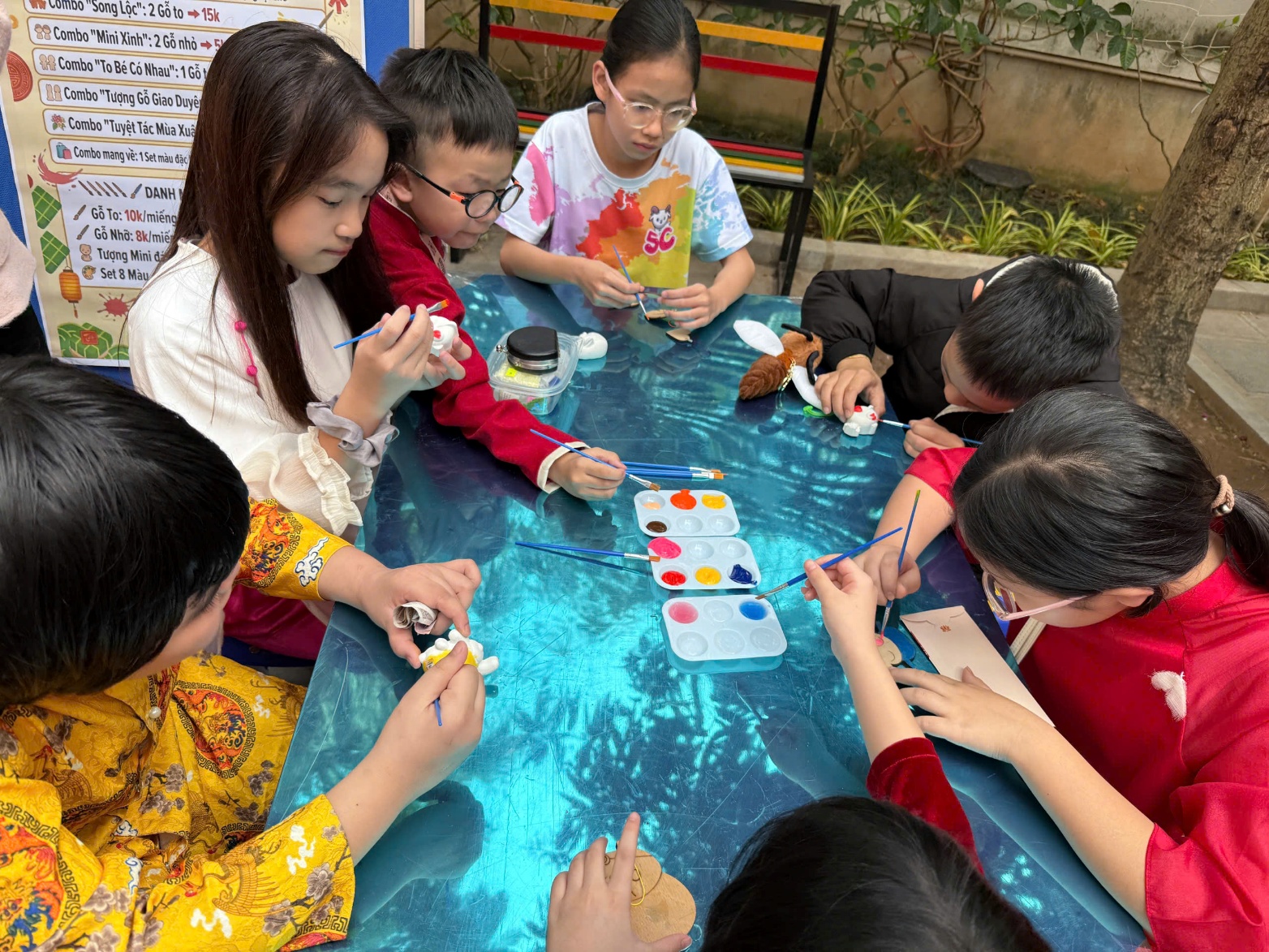 Buổi chiều, các cô giáo chủ nhiệm khối 4 đã cùng nhau trang trí gian hàng, tạo nên một không gian trải nghiệm ấm áp, bắt mắt và rất “mùa xuân”. Gian hàng nổi bật với hoạt động tô màu gỗ, tô tượng (nhiều mẫu hình ngộ nghĩnh, thú vị), thu hút đông đảo học sinh đến tham quan, mua sản phẩm và trực tiếp tô vẽ tại chỗ.