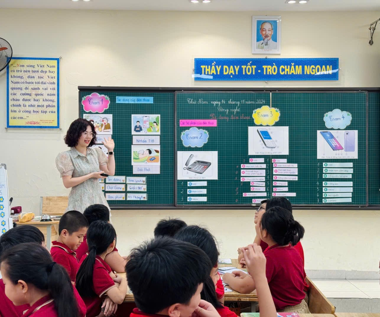 Tiết chuyên đề môn Công nghệ của cô giáo Hoàng Thị Hiền Anh và học sinh lớp 5A với bài học “Sử dụng điện thoại” diễn ra thật sôi nổi. Cô giáo Hiền Anh đã linh hoạt chia nội dung bài thành các trạm để học sinh lần lượt tìm hiểu về các nội dung như: tác hại của điện thoại và tìm hiểu các bộ phận của điện thoại. Tiết học gần gũi với liên tiếp các hoạt động giúp cho học sinh lớp 5A vô cùng thích thú và học tập rất tích cực.