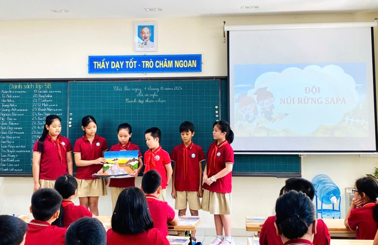 Bên cạnh đó là tiết Hội giảng môn Tiếng Việt – bài học “Nói và nghe: Cảnh đẹp thiên nhiên” của cô giáo Nguyễn Vũ Phương Uyên và học sinh lớp 5B đã được xây dựng bằng hình thức cuộc thi “Đại sứ du lịch” dưới sự dẫn dắt của MC Minh Quân. Học sinh lớp 5B đã có nội dung trình bày sinh động bằng tranh vẽ 3D và thiết kế nội dung trình chiếu bằng phần mềm Canva rất bắt mắt. Qua tiết học, các con đã có những hiểu biết về cảnh đẹp đất nước. Từ đó, các con biết yêu quê hương và giữ gìn vẻ đẹp thiên nhiên.