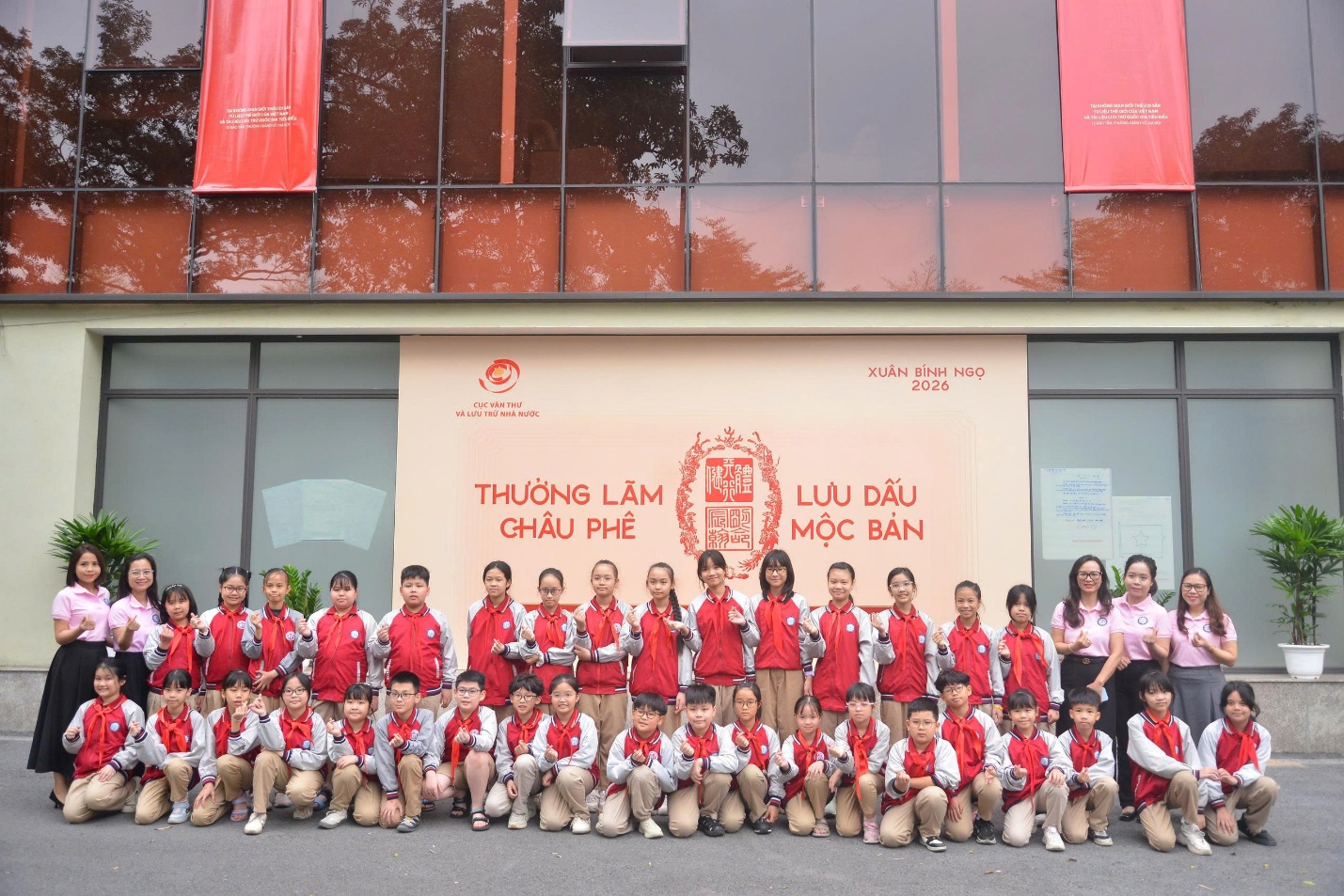 Ngày 3/3/2026, cô và trò lớp 4C Trường Tiểu học Thủ Lệ đã có chuyến tham quan, trải nghiệm đầy ý nghĩa tại sự kiện “Thưởng Lãm Châu Phê – Lưu dấu Mộc bản” do Cục Văn thư và Lưu trữ Nhà nước tổ chức.