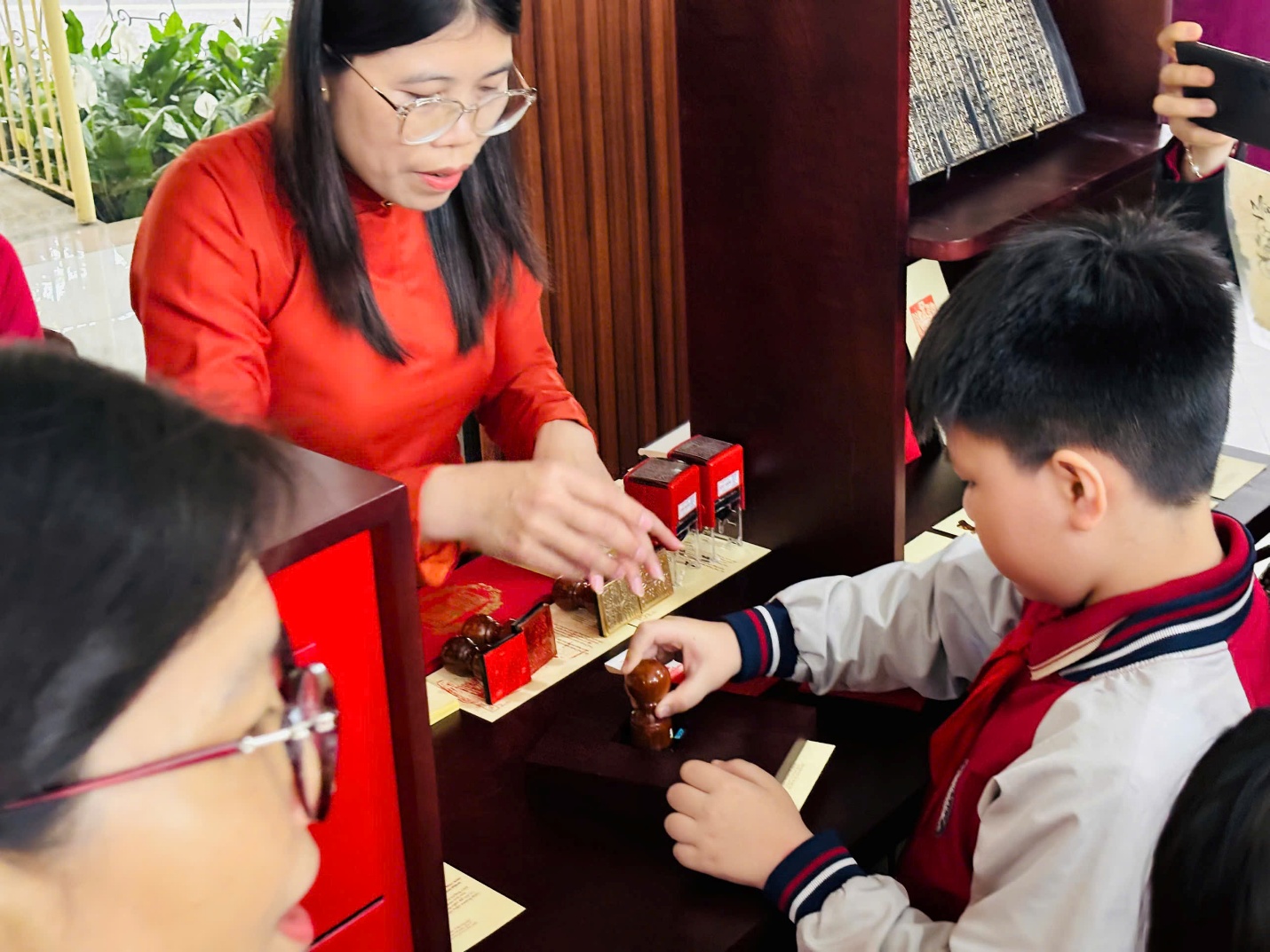 Điểm nhấn ấn tượng nhất của chương trình chính là hoạt động trải nghiệm “Lưu dấu Mộc bản”. Dưới sự hướng dẫn tận tình, các con học sinh lớp 4C được tự tay thực hiện kỹ thuật in dập mộc bản trên giấy dó, in ấn triện lên các tấm thiệp xuân và lưu giữ bản in ý nghĩa làm kỷ niệm. Mỗi sản phẩm hoàn thành không chỉ là thành quả lao động sáng tạo mà còn là “dấu ấn” văn hóa riêng của từng học sinh sau chuyến đi.