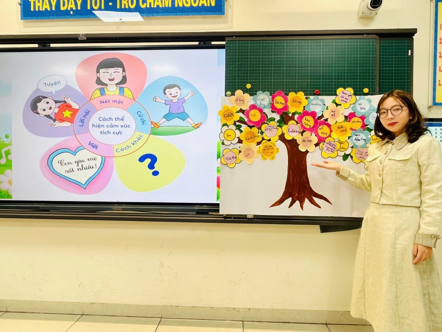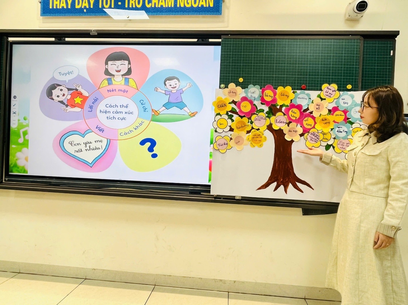 Tiếp nối, các em được tìm hiểu và chia sẻ những cách thể hiện cảm xúc tích cực thông qua lời nói, cử chỉ, nét mặt hay hành động cụ thể như: mỉm cười, khen ngợi bạn, ôm người thân, viết thiệp yêu thương… Qua đó, học sinh nhận thức rõ hơn về việc lan tỏa niềm vui và năng lượng tích cực đến mọi người xung quanh.
