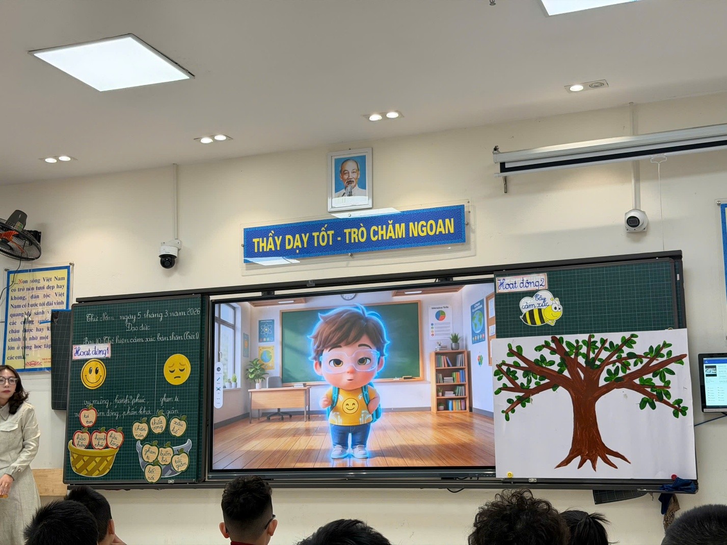 Ngay từ những phút đầu tiên, không khí lớp học đã trở nên sôi động với hoạt động khởi động “Vũ điệu cảm xúc cùng Đậu Nhỏ”. Sự xuất hiện bất ngờ của nhân vật AI “Đậu Nhỏ” đã thu hút sự chú ý và hứng thú của học sinh. Các em hào hứng tham gia vận động theo nhạc, từ đó khơi gợi những cảm xúc tích cực và tạo tâm thế sẵn sàng bước vào bài học.
