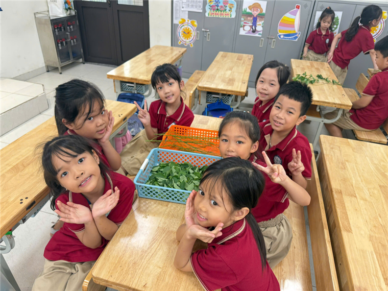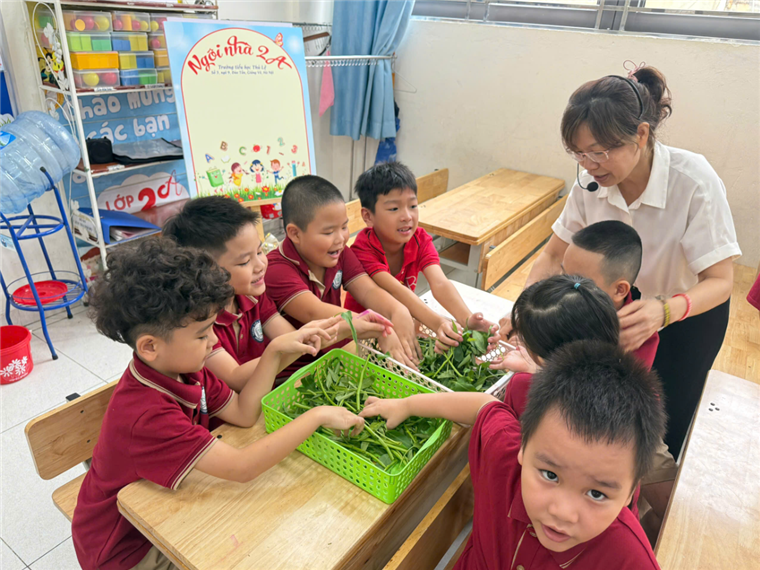 Dưới sự hướng dẫn của cô giáo, các bạn nhỏ lớp 2A đã cùng nhau tham gia hoạt động nhặt rau. Tưởng chừng là công việc giản dị trong đời sống hằng ngày, nhưng khi được trải nghiệm trực tiếp, các em lại vô cùng hào hứng. Từng cọng rau xanh được nâng niu, từng bàn tay nhỏ bé trở nên khéo léo hơn. Hoạt động ấy không chỉ mang lại niềm vui mà còn giúp các em hiểu giá trị của lao động và biết trân trọng bữa ăn sạch, an toàn.