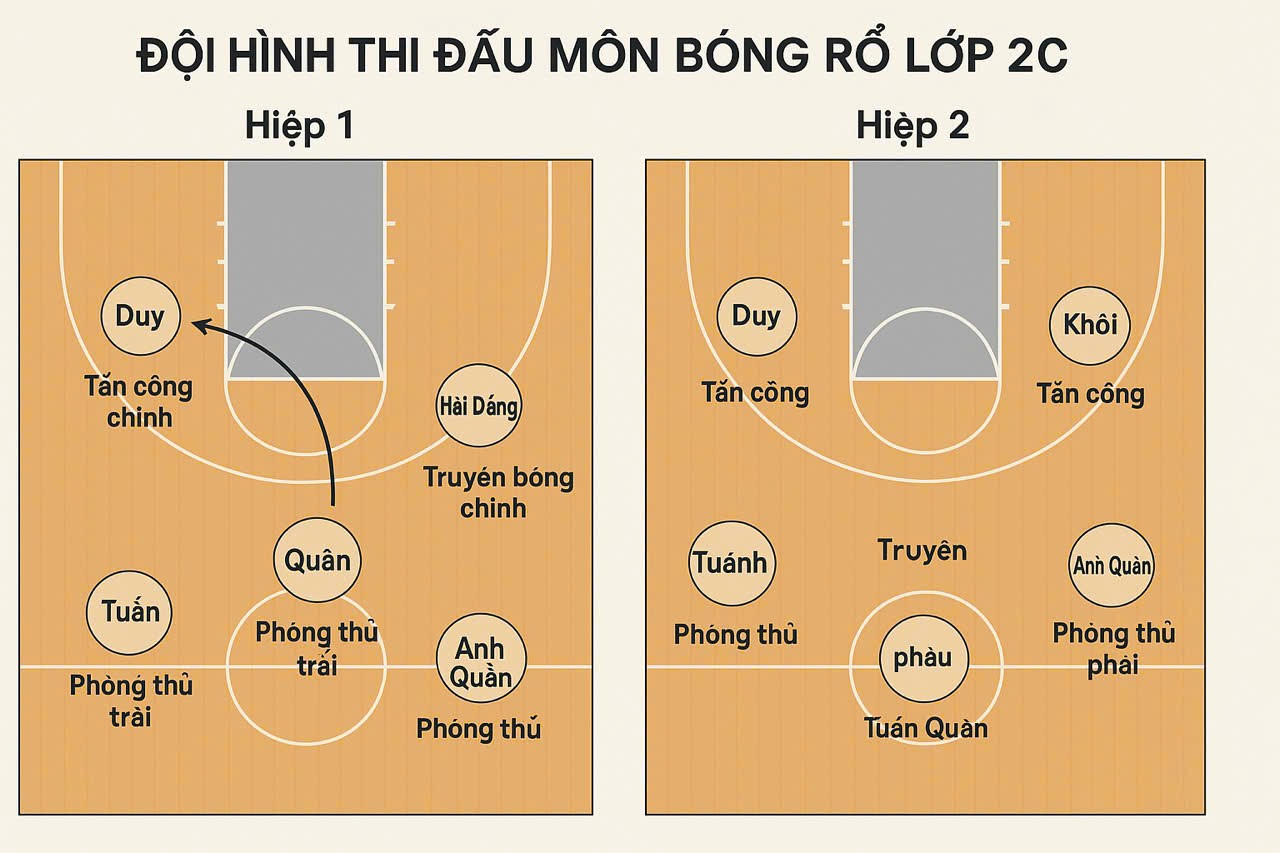 Lớp 2C triển khai chiến thuật “tấn công nhanh, phòng thủ vững”. Đức Duy cùng Hải Đăng chủ động dâng cao, phối hợp với Anh Quân làm trạm trung chuyển bóng. Tuấn Minh và Đỗ Khang tạo nên bức tường phòng ngự vững vàng, ngăn chặn hiệu quả các pha lên rổ từ đối thủ.