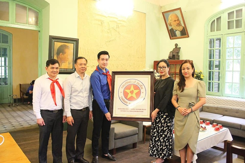 Đồng chí Đào Đức Việt - Phó Bí thư Thành đoàn, Chủ tịch Hội đồng Đội thành phố Hà Nội cùng Ban giám hiệu nhà trường tặng gia đình đồng chí cố Tổng Bí thư Lê Duẩn bức tranh kỉ niệm với dòng chữ: "Trường Lê Duẩn - 40 năm đồng hành cùng công tác Đoàn, Hội, Đội và phong trào thanh thiếu nhi Thủ đô".