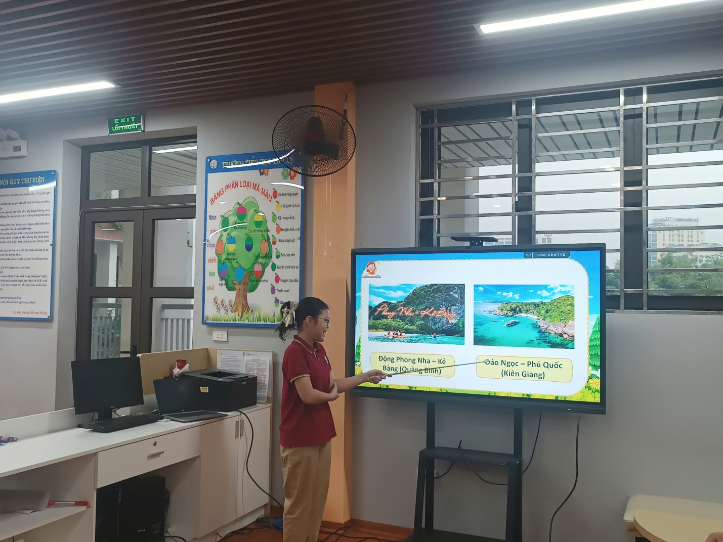 Mở đầu tiết học, cô giáo cùng các bạn được “chu du” qua màn ảnh nhỏ, khám phá những danh lam thắng cảnh nổi tiếng của đất nước như Vịnh Hạ Long, Phong Nha – Kẻ Bàng, Sa Pa, Đà Lạt, Tràng An… Ánh mắt các em ánh lên niềm tự hào và say mê khi ngắm nhìn vẻ đẹp hùng vĩ, thơ mộng của non sông gấm vóc Việt Nam.