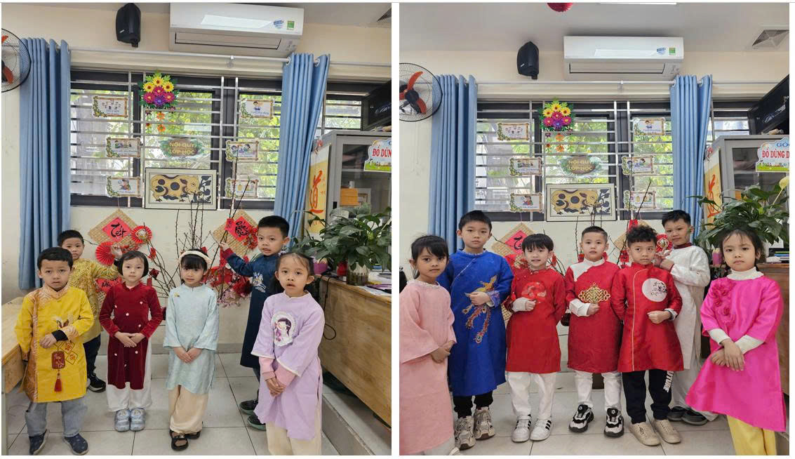 Song song với hoạt động tìm hiểu, mỗi lớp học đều được trang trí rực rỡ sắc xuân. Cành đào hồng thắm, mai vàng khoe sắc, bao lì xì đỏ tươi, câu đối xuân ý nghĩa… tất cả do chính tay cô và trò cùng chuẩn bị. Những góc xuân nhỏ xinh ấy đã biến lớp học thành một “ngôi nhà Tết” ấm áp, nơi các con được sống trong không khí đoàn viên và yêu thương.