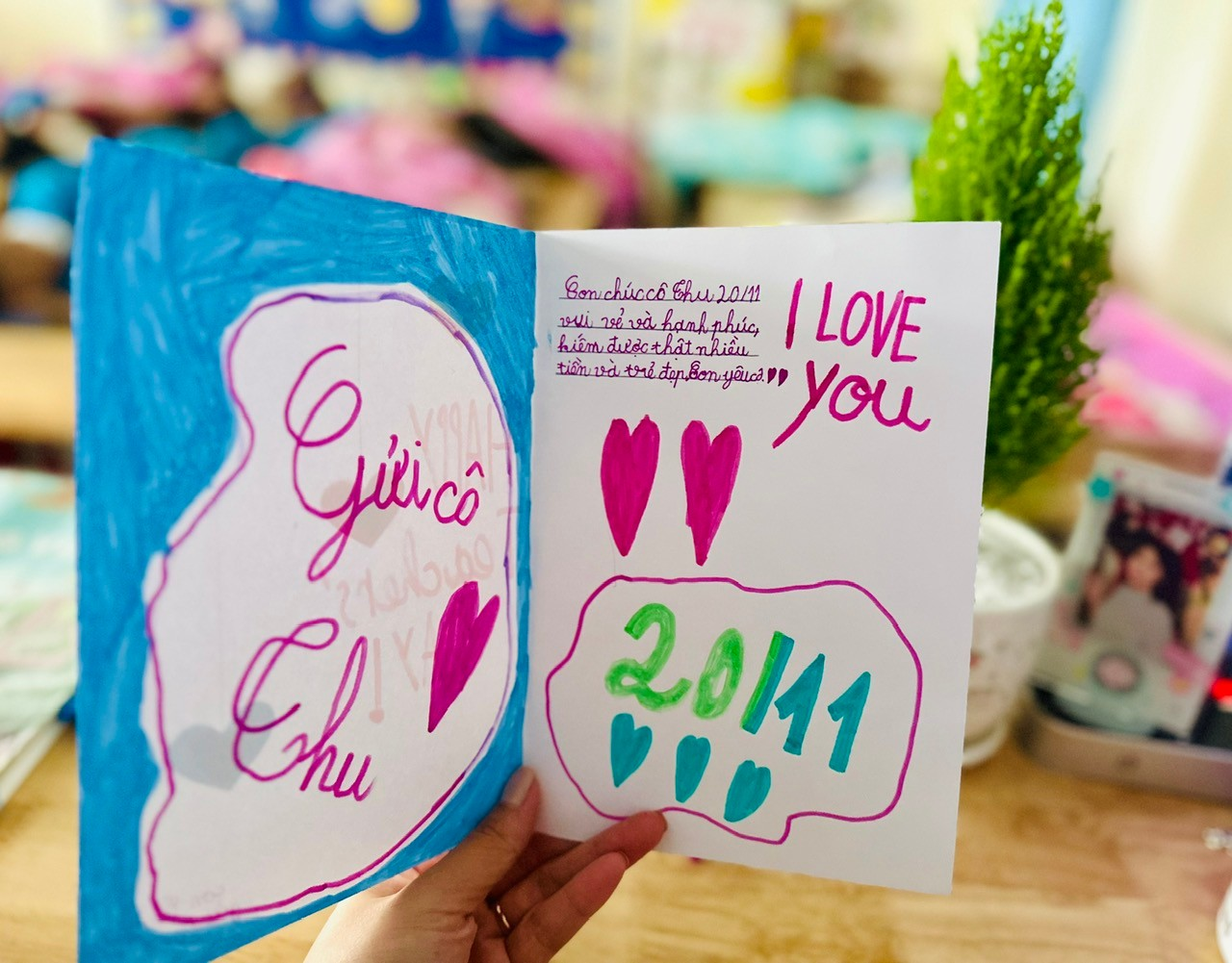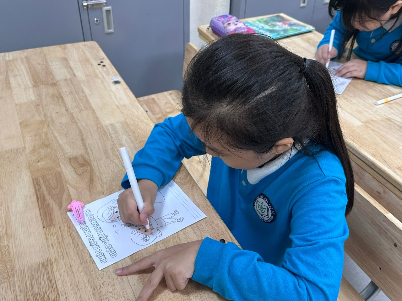 Với đôi bàn tay khéo léo, học sinh lớp 3A đã tự tay làm những tấm thiệp đầy màu sắc và sáng tạo. Mỗi tấm thiệp là một thông điệp yêu thương, chứa đựng lời chúc tốt đẹp mà các em dành tặng thầy cô – những người luôn tận tâm dìu dắt, đồng hành cùng các em mỗi ngày.