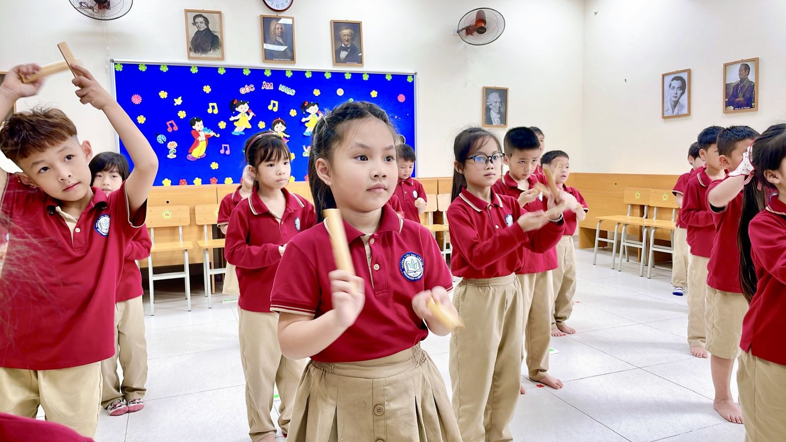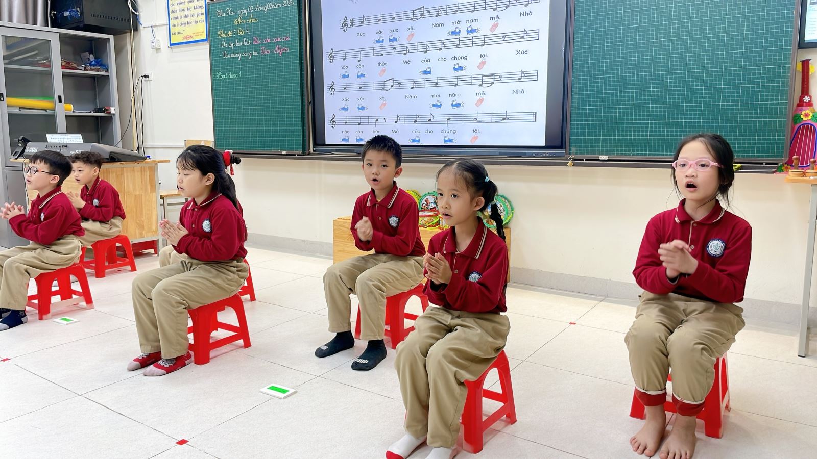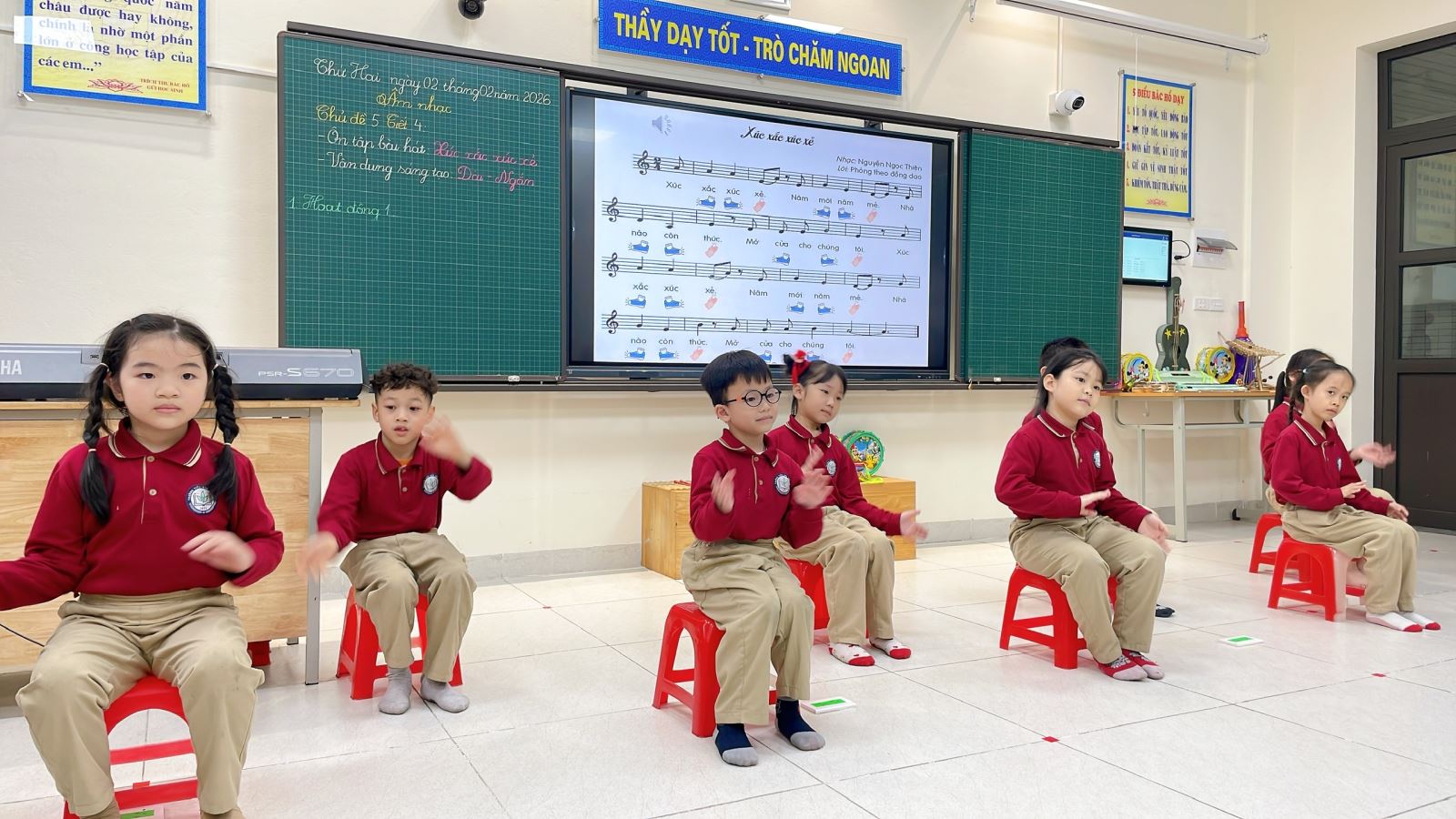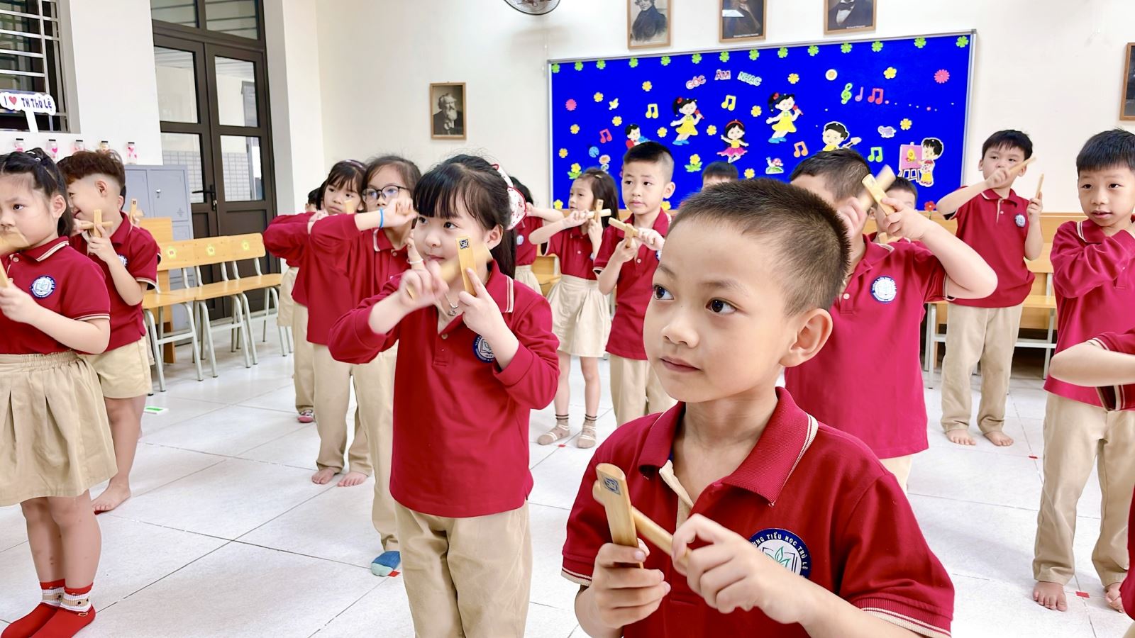 Thông qua hoạt động này, các em không chỉ rèn luyện khả năng cảm thụ âm nhạc, giữ nhịp và phối hợp vận động, mà còn phát triển sự tự tin, mạnh dạn thể hiện bản thân trước tập thể. Tiếng hát trong trẻo hòa cùng những nhịp gõ thanh phách rộn ràng đã mang lại một tiết học âm nhạc đầy ý nghĩa và niềm vui.