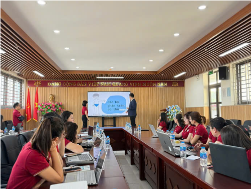 Giáo viên khối 1 cùng với giáo viên toàn trường trong buổi tập huấn sử dụng màn hình thông minh.