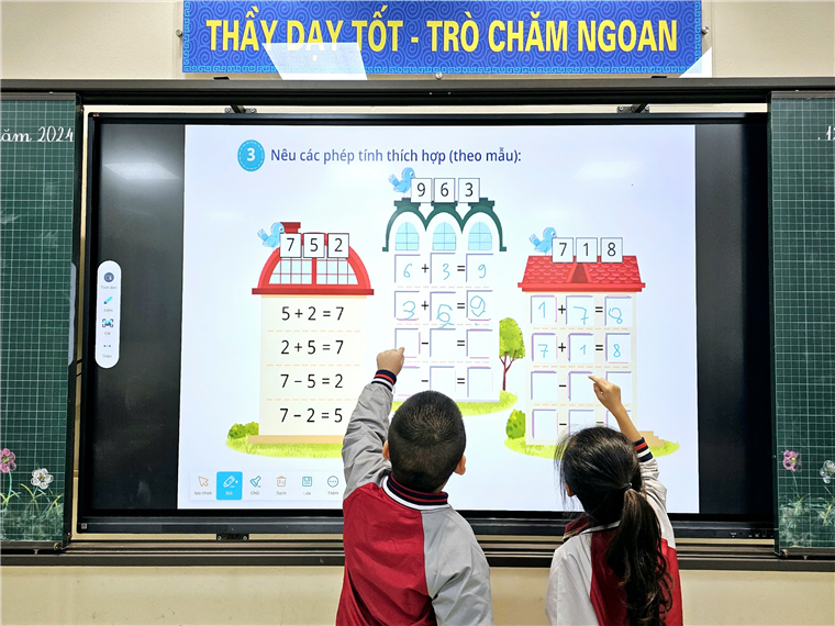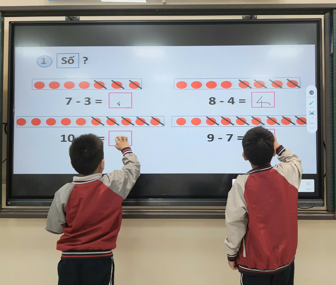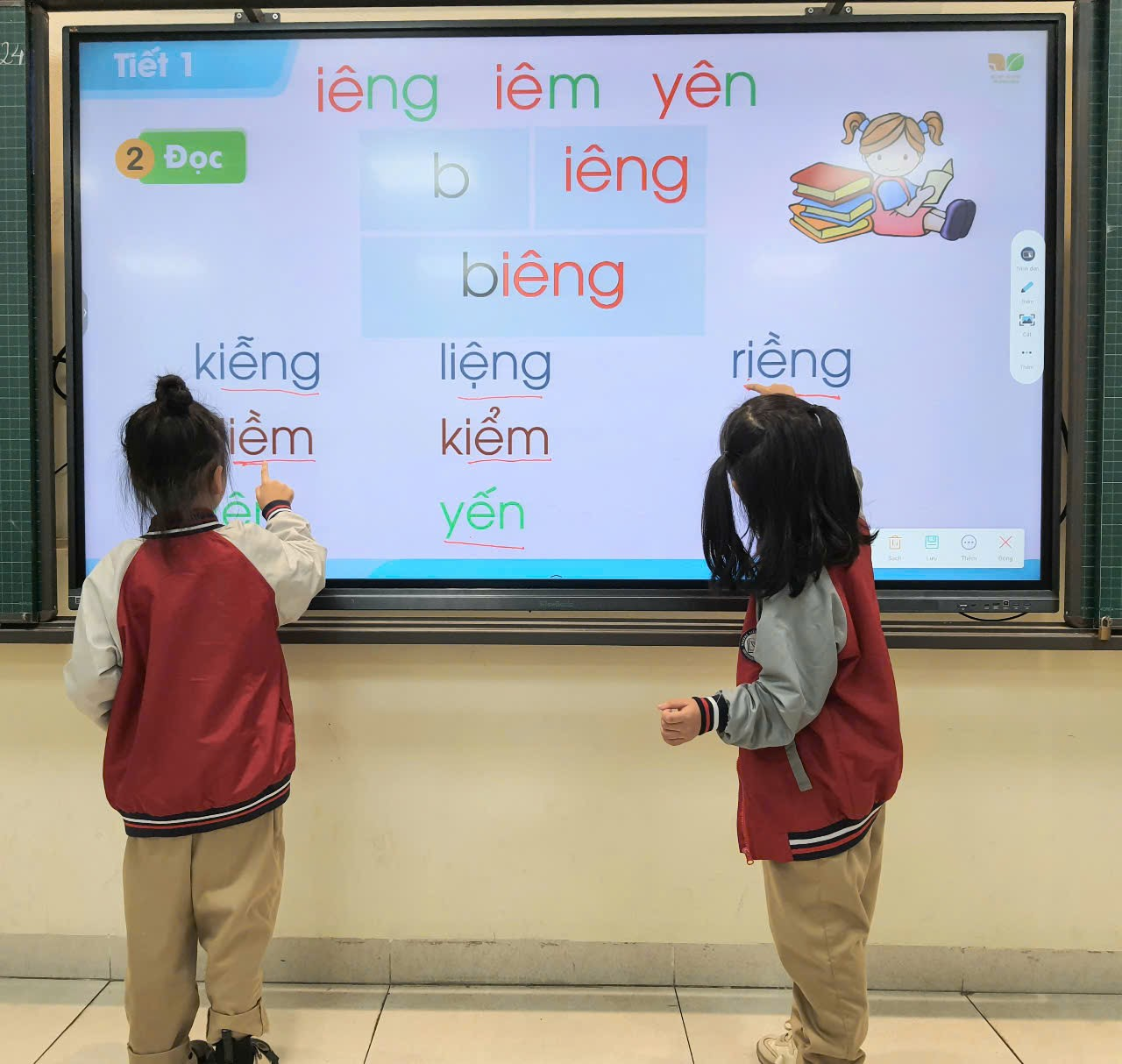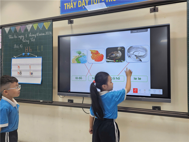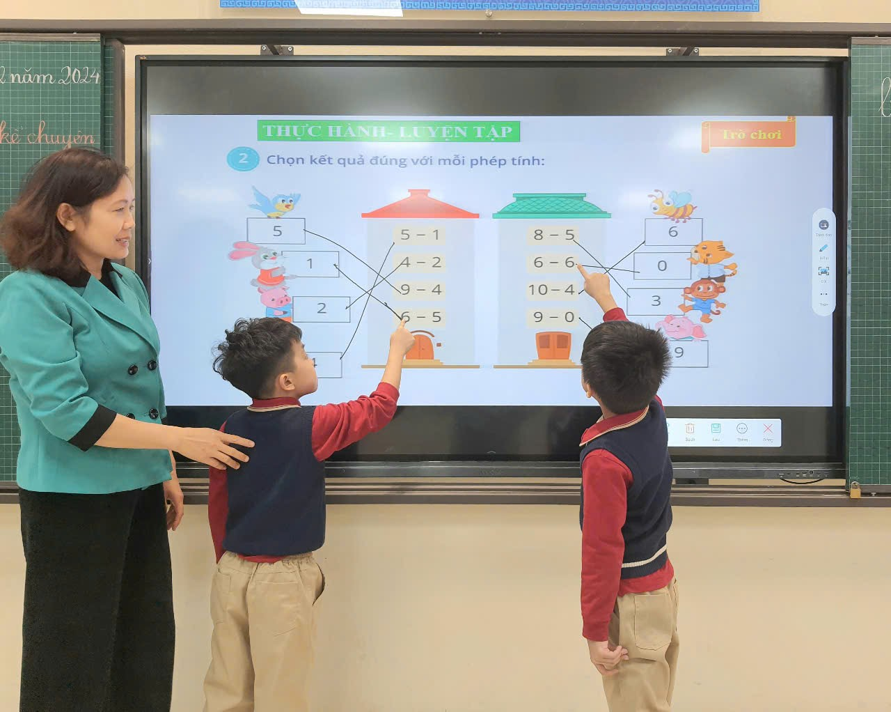 Học sinh lớp 1C sử dụng màn hình thông minh trong các giờ học dưới sự hướng dẫn của cô giáo Nguyễn Thu Hằng