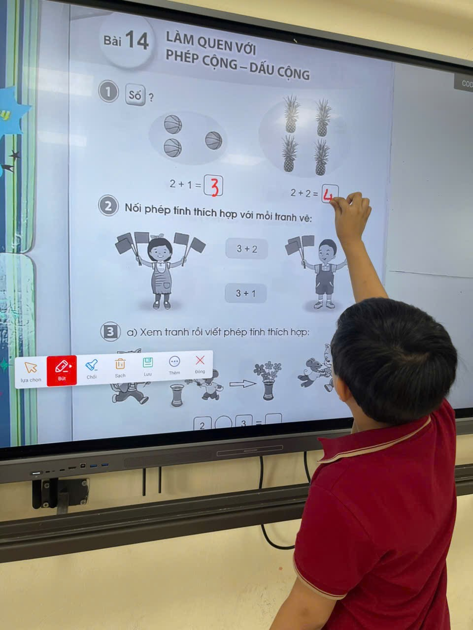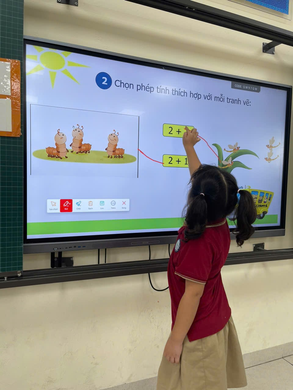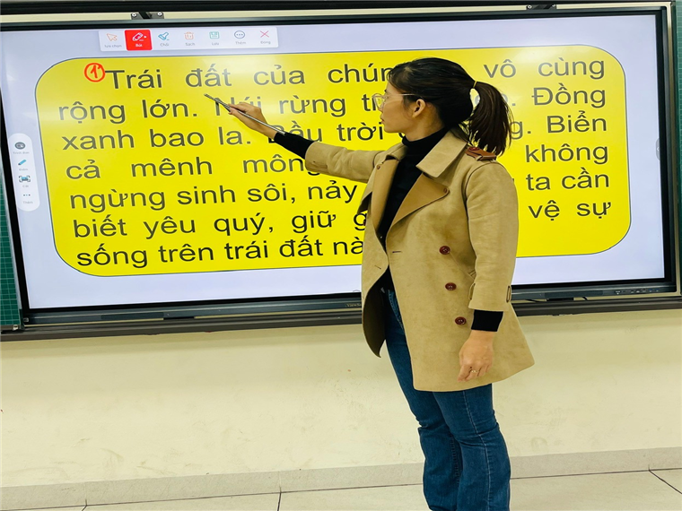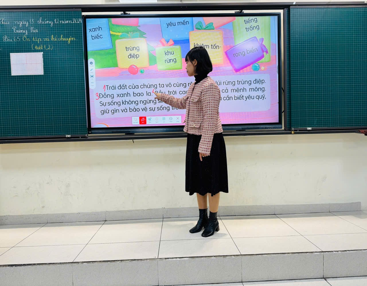 Cô giáo Đỗ Thị Kim Khanh hướng dẫn các con học sinh lớp 1B sử dụng màn hình thông minh trong các giờ học