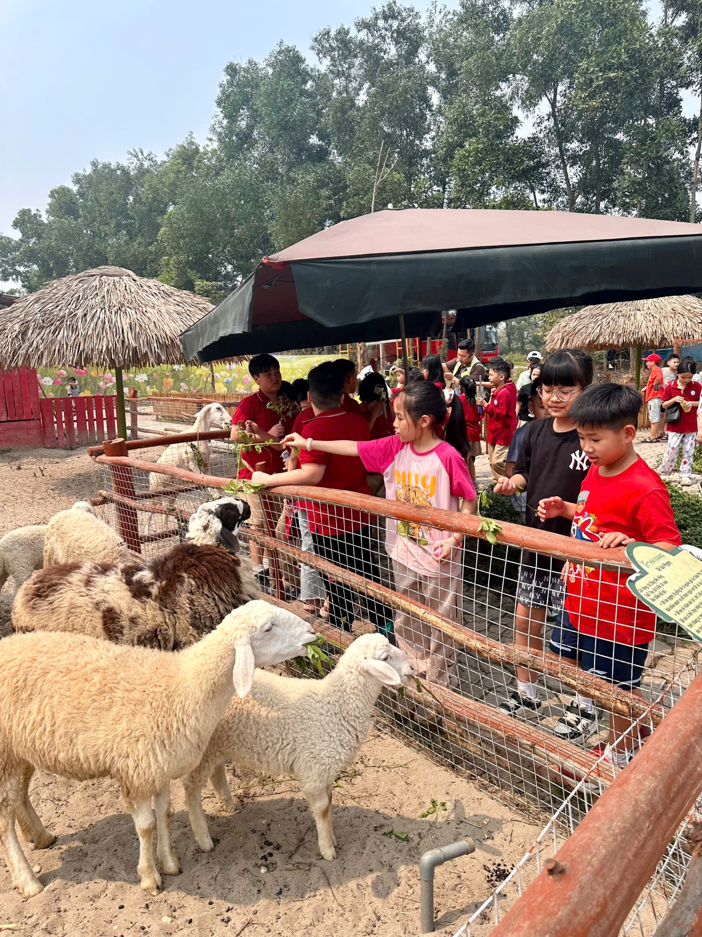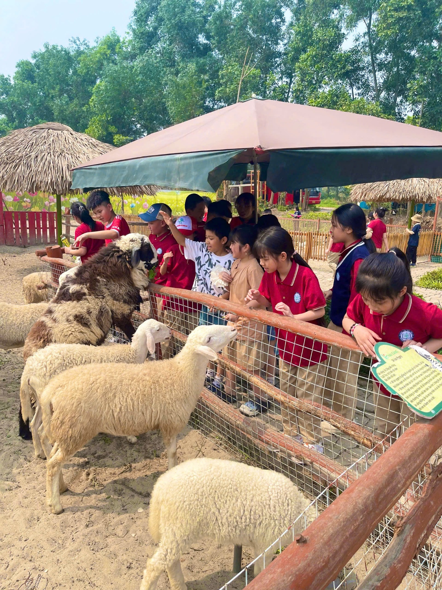 Các bạn học sinh khối 4 làm quen với những chú cừu thân thiện